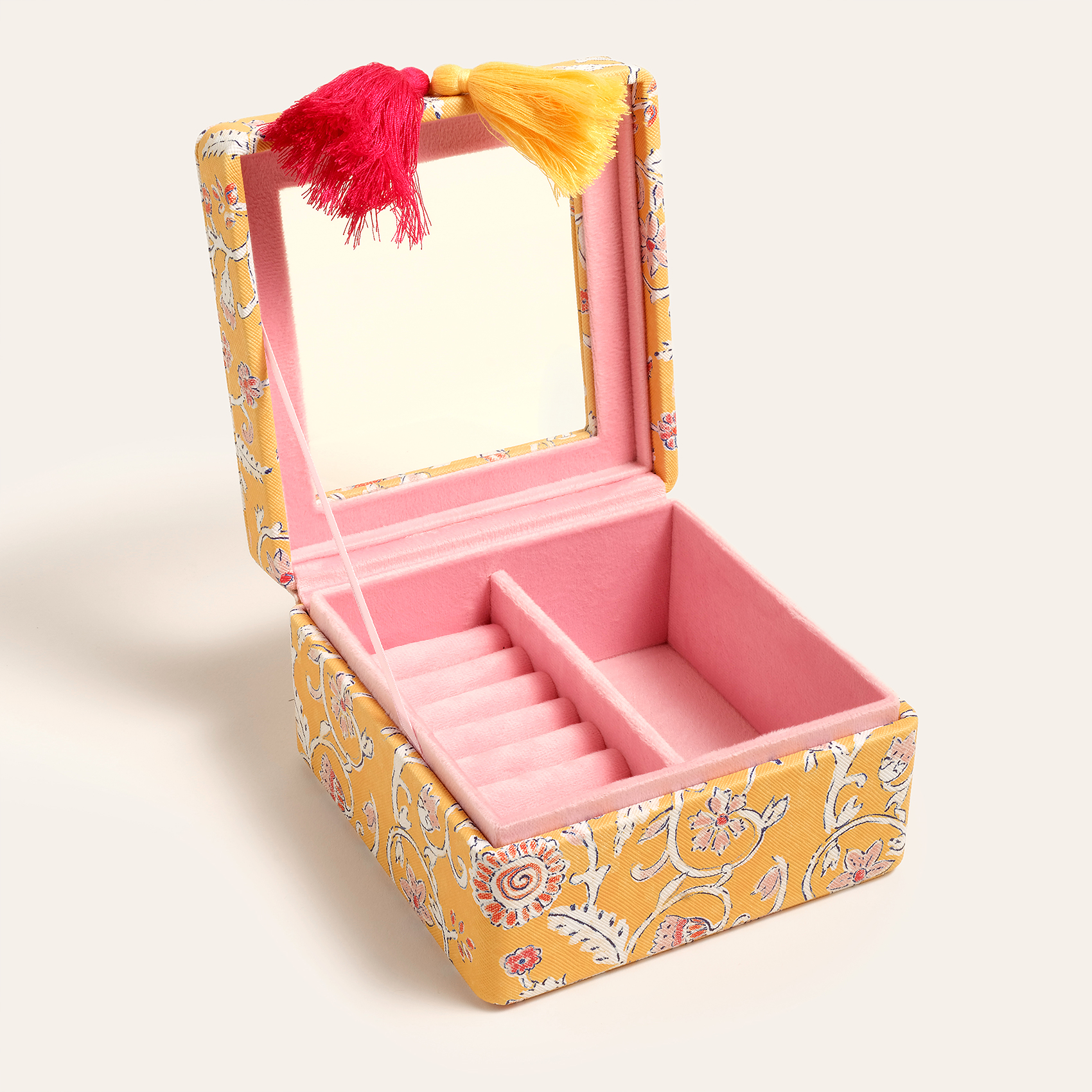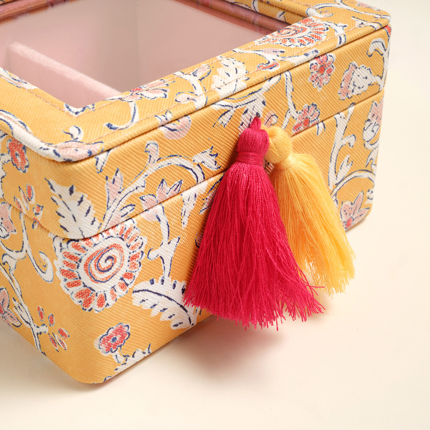 Her ayrıntısıyla ilham veren bir obje… Heritage koleksiyonunun karakteristik desenleriyle kaplı Meilin takı kutusu, takılarınızı saklamanın en stil sahibi yolunu sunuyor. Üst kısmındaki aynası ve renkli püskül detayıyla hem nostaljik hem oyuncu bir ruh taşıyor. PVC dış yüzeyi formunu korurken, iç kısmındaki MDF yapı ve kadife kaplama zarif eşyalarınız için yumuşacık bir alan yaratıyor. Komodin üstünde, valiz içinde ya da hediye olarak… Meilin her yerde fark yaratır. Temizlemeniz gerekiyorsa nemli bir bezle silmeniz yeterli.