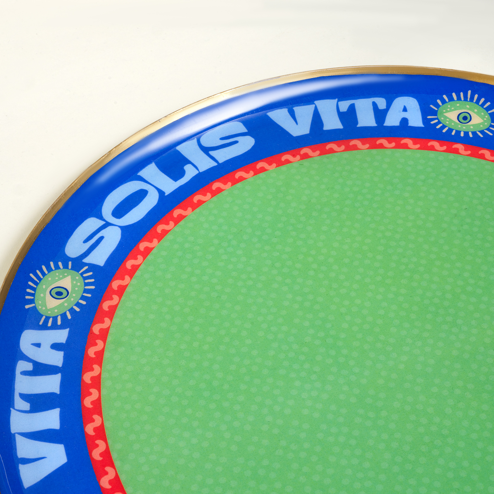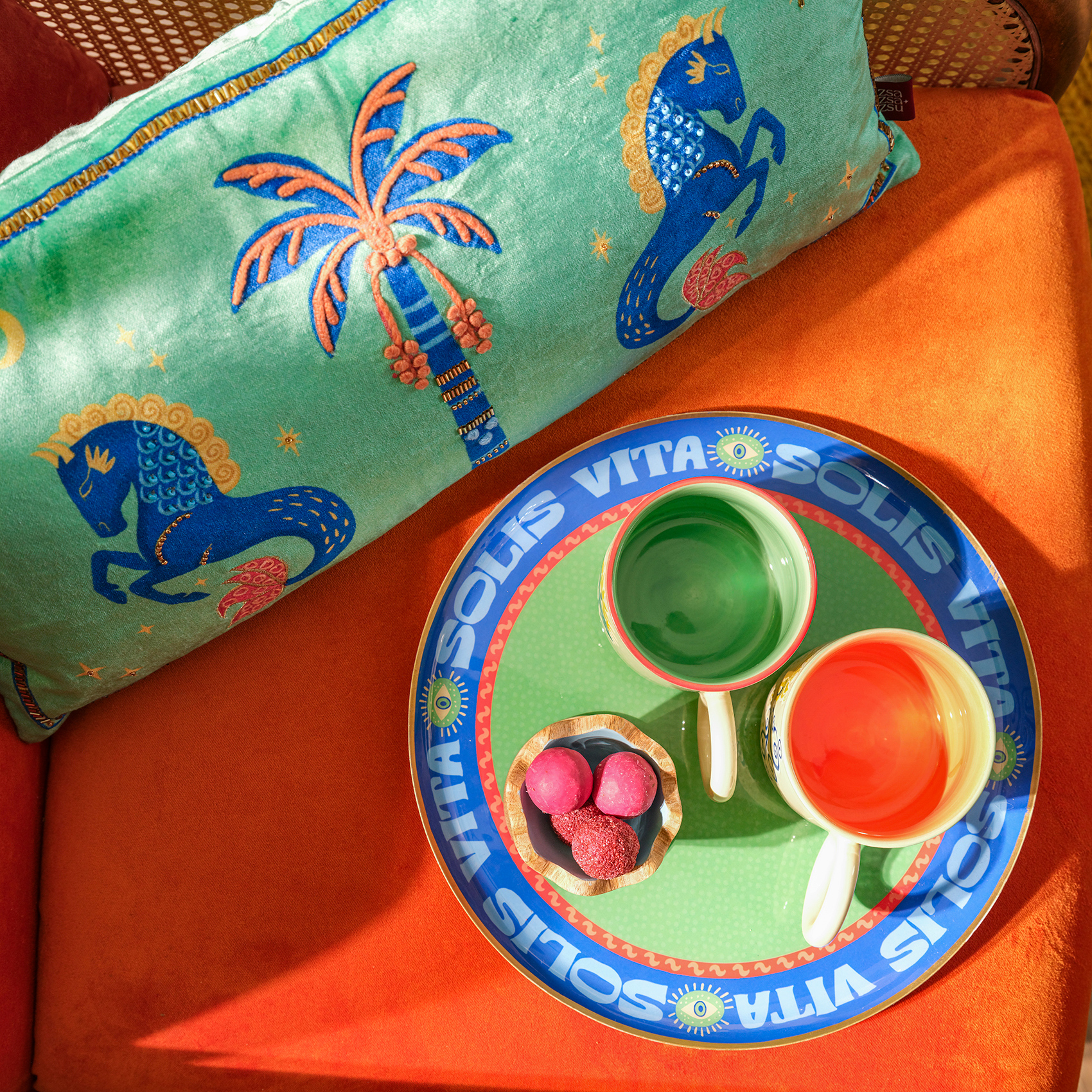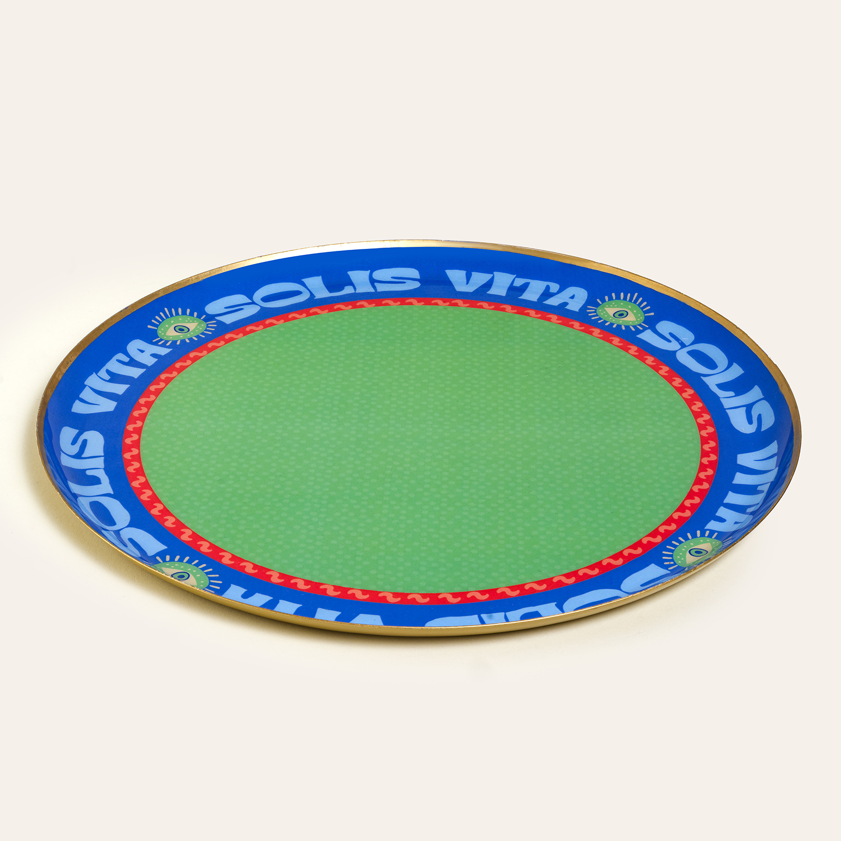 Güneşten aldığı enerjiyi saklamıyor, doğrudan yüzeye yayıyor. Agra Tepsi, Blue koleksiyonunun o parlak ve canlı dünyasını “Solis Vita” ritmiyle taşıyor; ortadaki yeşil alan bir nefes gibi açılıyor, etrafındaki mavi çerçeve hareketi sürekli kılıyor. Hindistan’da demir yüzey üzerine uygulanan dekal tekniğiyle üretiliyor. Renkler net, kontrast güçlü, duruşu kararlı. Küçük sunumlarda, kahve anlarında ya da duvarda tek başına bile bulunduğu yeri daha enerjik bir hale getiriyor. Agra, güneşten gelen mutluluk hissini hayatınızın her anında hissetmeniz için tasarlandı.