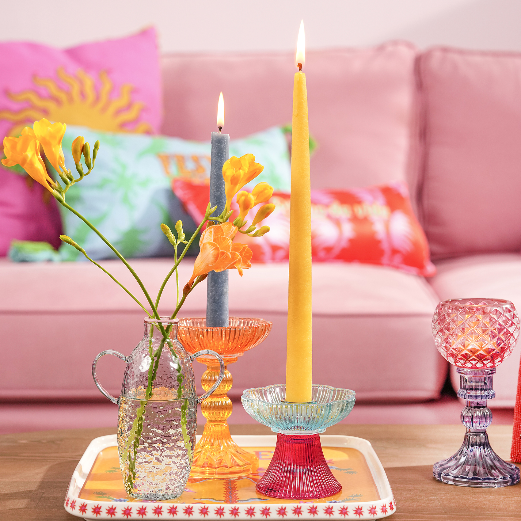 Nanjing Borosilikat Vazo, Maximalist koleksiyonunun cesur renk dünyasını artizan dokunuşlarla buluşturuyor. El üretimi borosilikat cam, ışığı net ve parlak yansıtarak form boyunca uzanan renkleri daha canlı ve belirgin gösteriyor. El yapımı olduğu için her parça kendine özgüdür; form ve renk geçişlerinde küçük farklılıklar görülebilir. Kulplu detayları ve heykelsi görünümüyle bulunduğu yüzeyde güçlü bir etki yaratıyor, tek başına dikkat çekiyor, bir araya geldiğinde daha oyunbaz bir kompozisyon kuruyor. Nanjing Vazo ile dekorasyonunu tamamla, modunu yükselt, sahneyi renklendir.