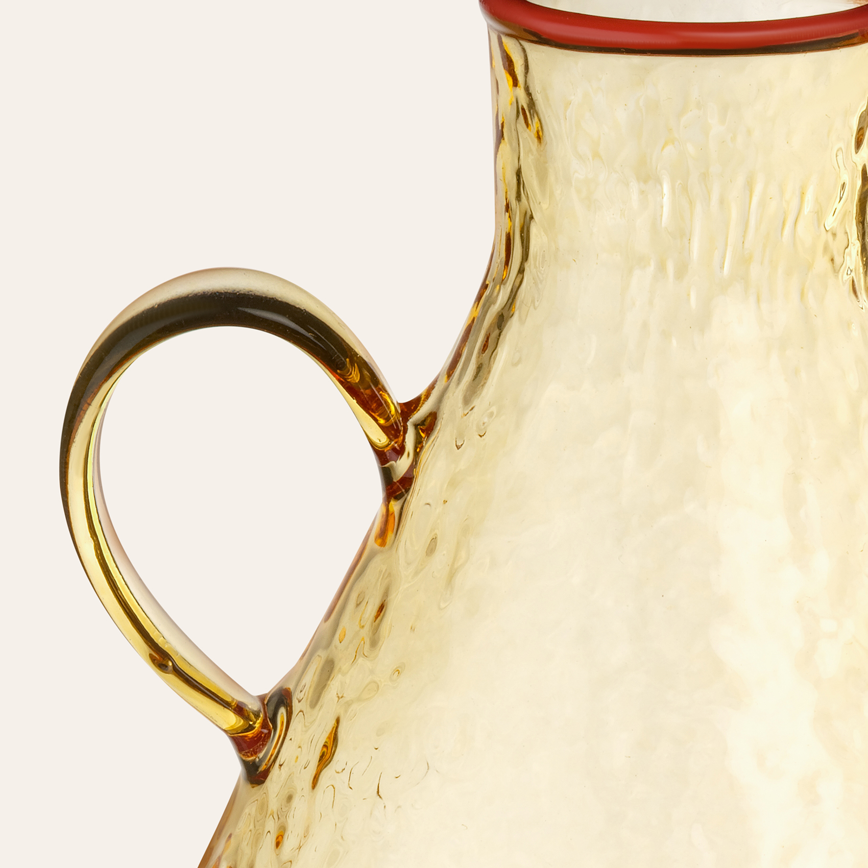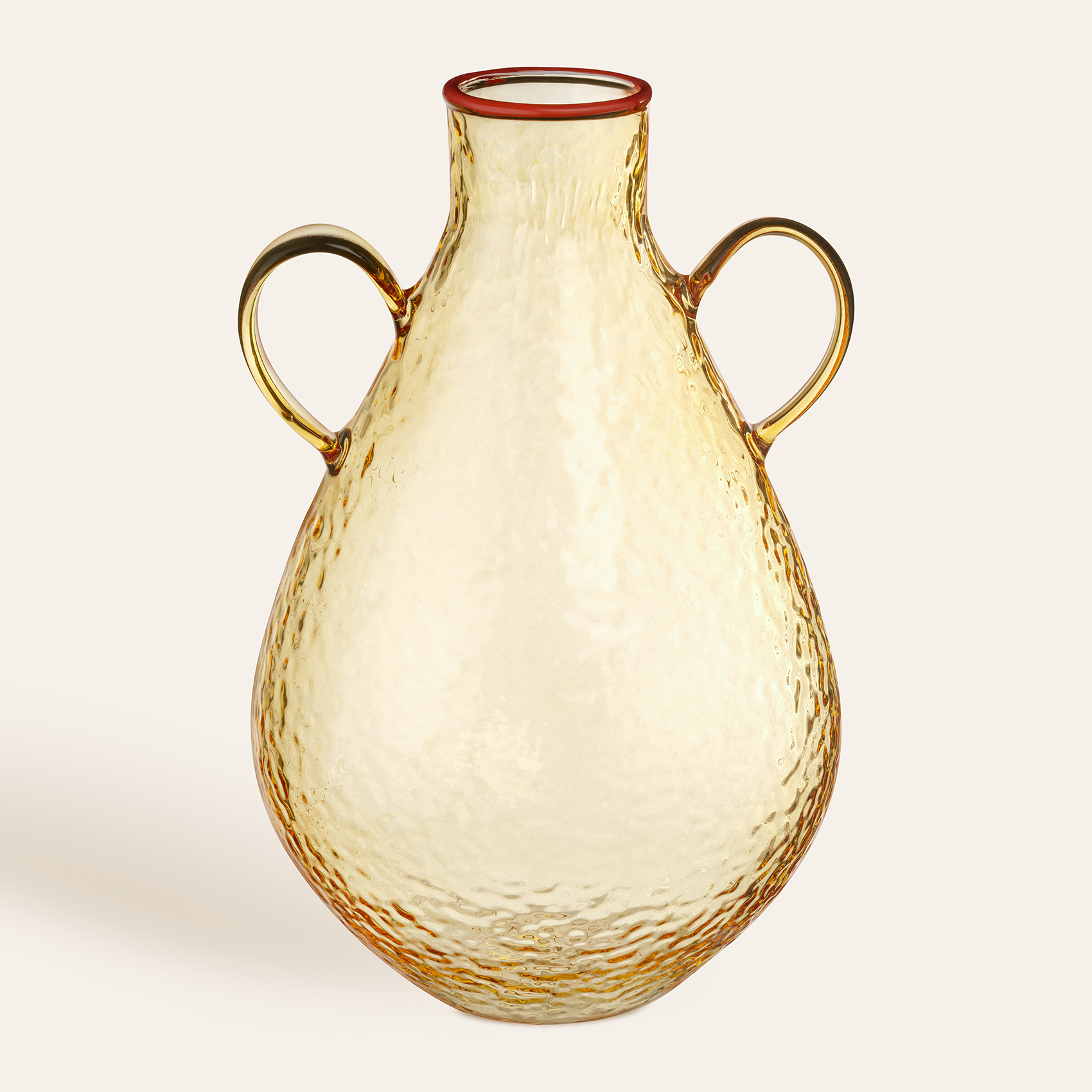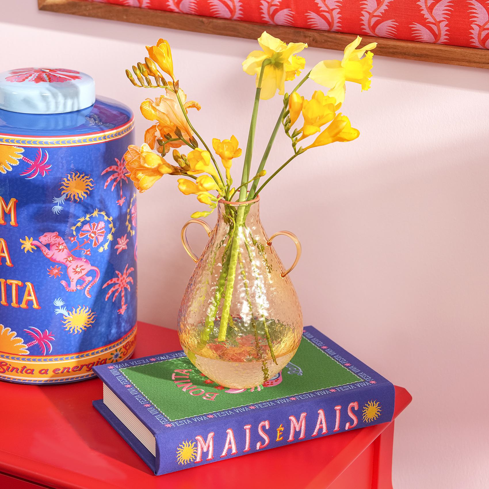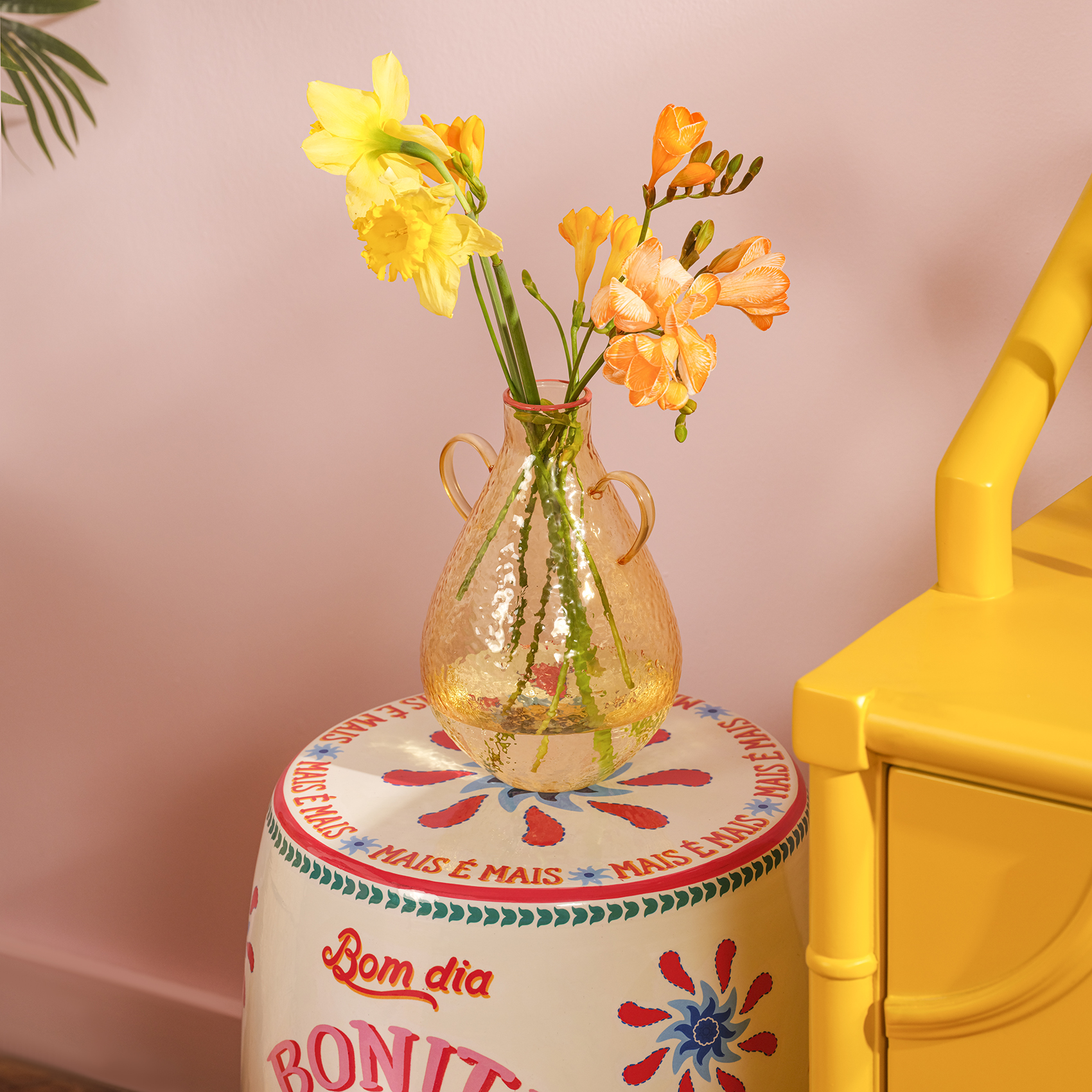 Nanjing Borosilikat Vazo, Maximalist koleksiyonunun cesur renk dünyasını artizan dokunuşlarla buluşturuyor. El üretimi borosilikat cam, ışığı net ve parlak yansıtarak form boyunca uzanan renkleri daha canlı ve belirgin gösteriyor. El yapımı olduğu için her parça kendine özgüdür; form ve renk geçişlerinde küçük farklılıklar görülebilir. Kulplu detayları ve heykelsi görünümüyle bulunduğu yüzeyde güçlü bir etki yaratıyor, tek başına dikkat çekiyor, bir araya geldiğinde daha oyunbaz bir kompozisyon kuruyor. Nanjing Vazo ile dekorasyonunu tamamla, modunu yükselt, sahneyi renklendir.