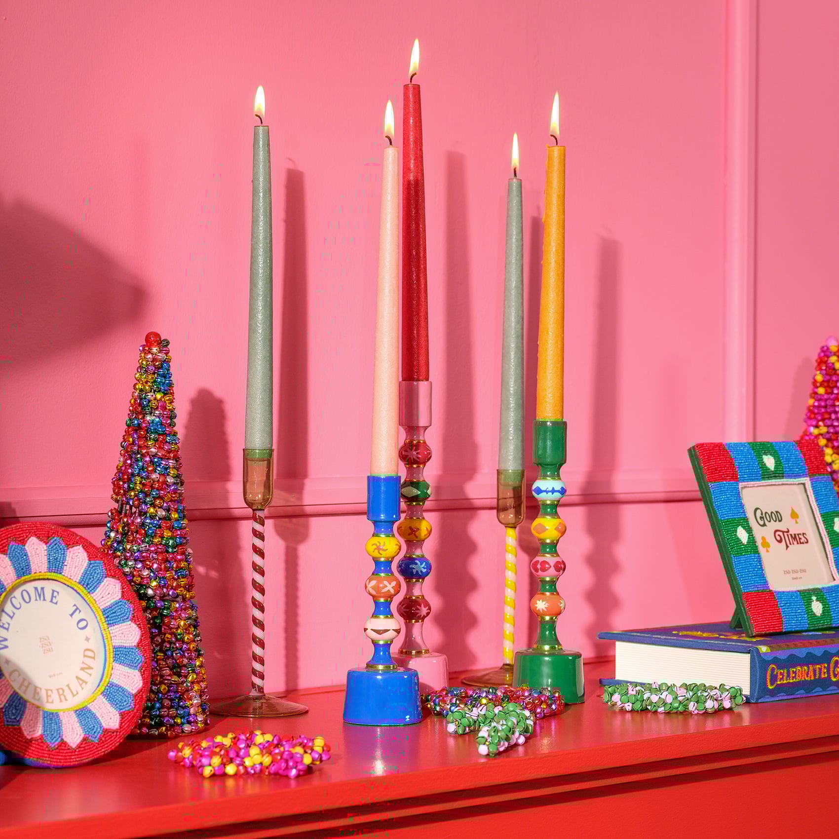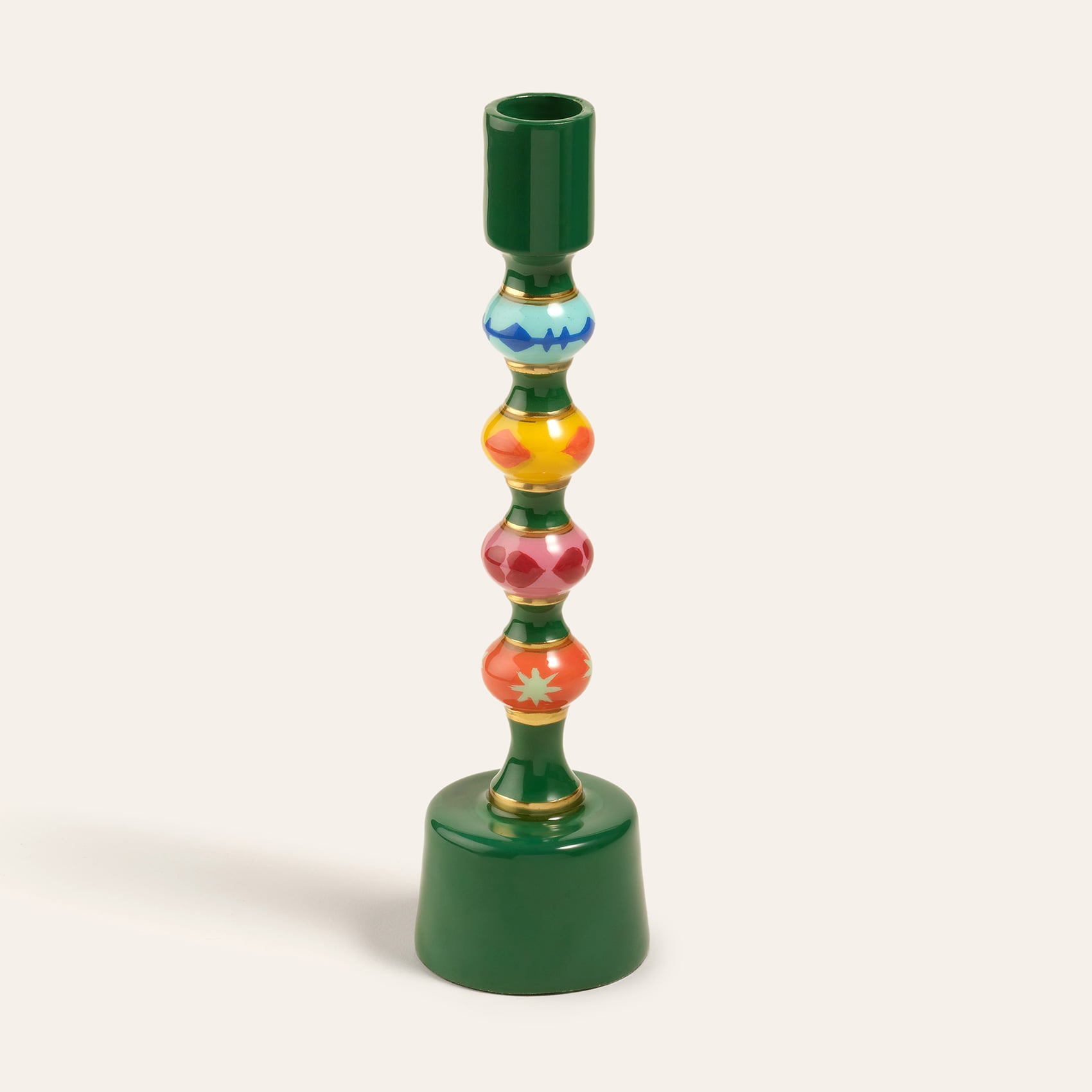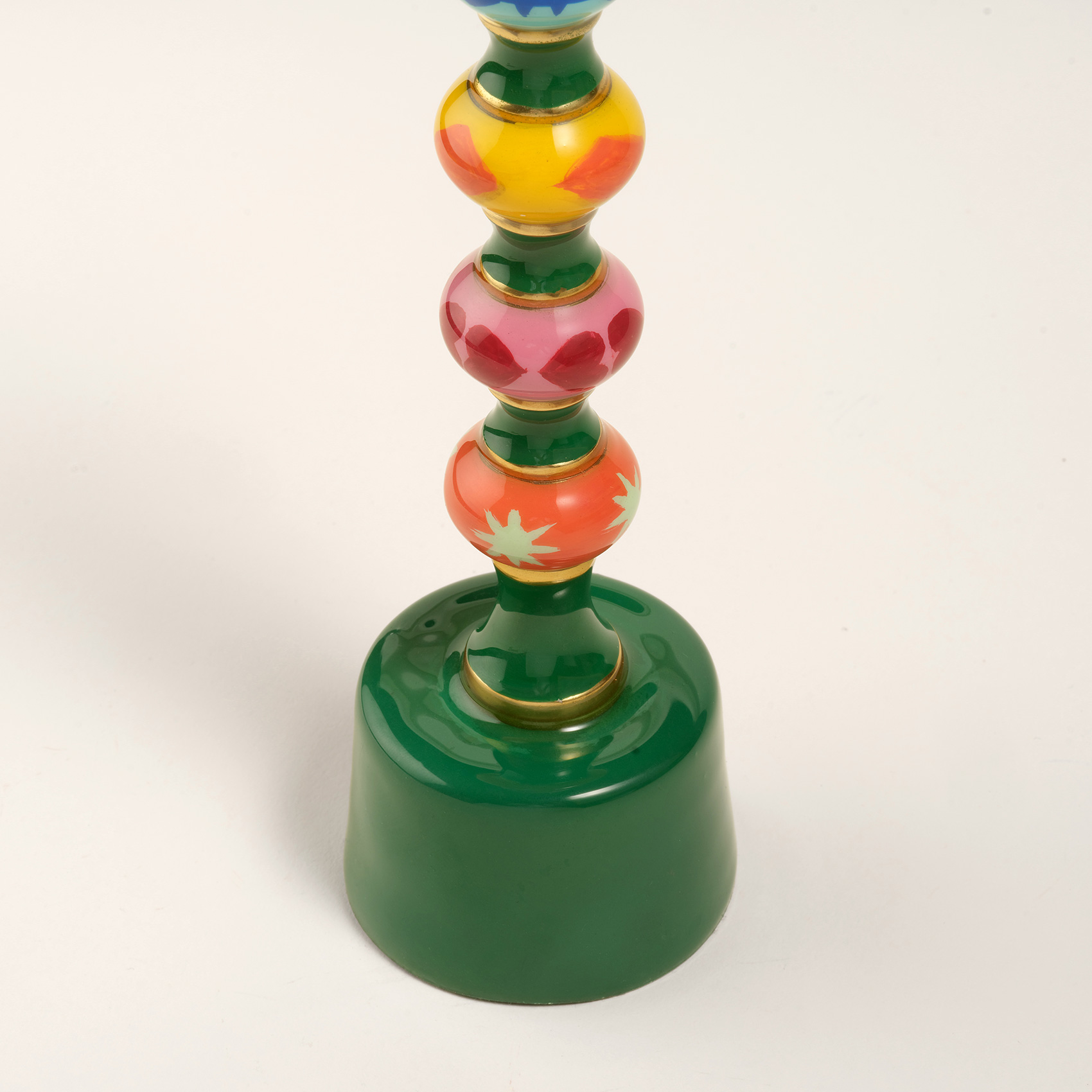 Nanpur Metal Şamdan, Cheerland koleksiyonunun enerjik ruhunu evinize taşıyor. Hindistan’da ustalıkla üretilen bu tasarım, parlak renklerle birleşen katmanlı formu sayesinde masaların ve konsolların üzerinde adeta küçük bir sanat eseri gibi parlıyor. Modern çizgilerle şekillenen eğlenceli geometrik halkalar, hem sofistike hem de neşeli bir atmosfer yaratıyor. Dekorasyon önerisi: Tek başına cesur bir vurgu objesi olarak kullanabilir ya da farklı renklerdeki Nanpur Metal Şamdan’ları bir araya getirerek masa düzeninize karnaval coşkusu katabilirsiniz. Özellikle renkli mumlarla eşleştirildiğinde, akşam yemeklerinde ya da özel kutlamalarda ışığı dans ettirerek mekânın havasını değiştirir.