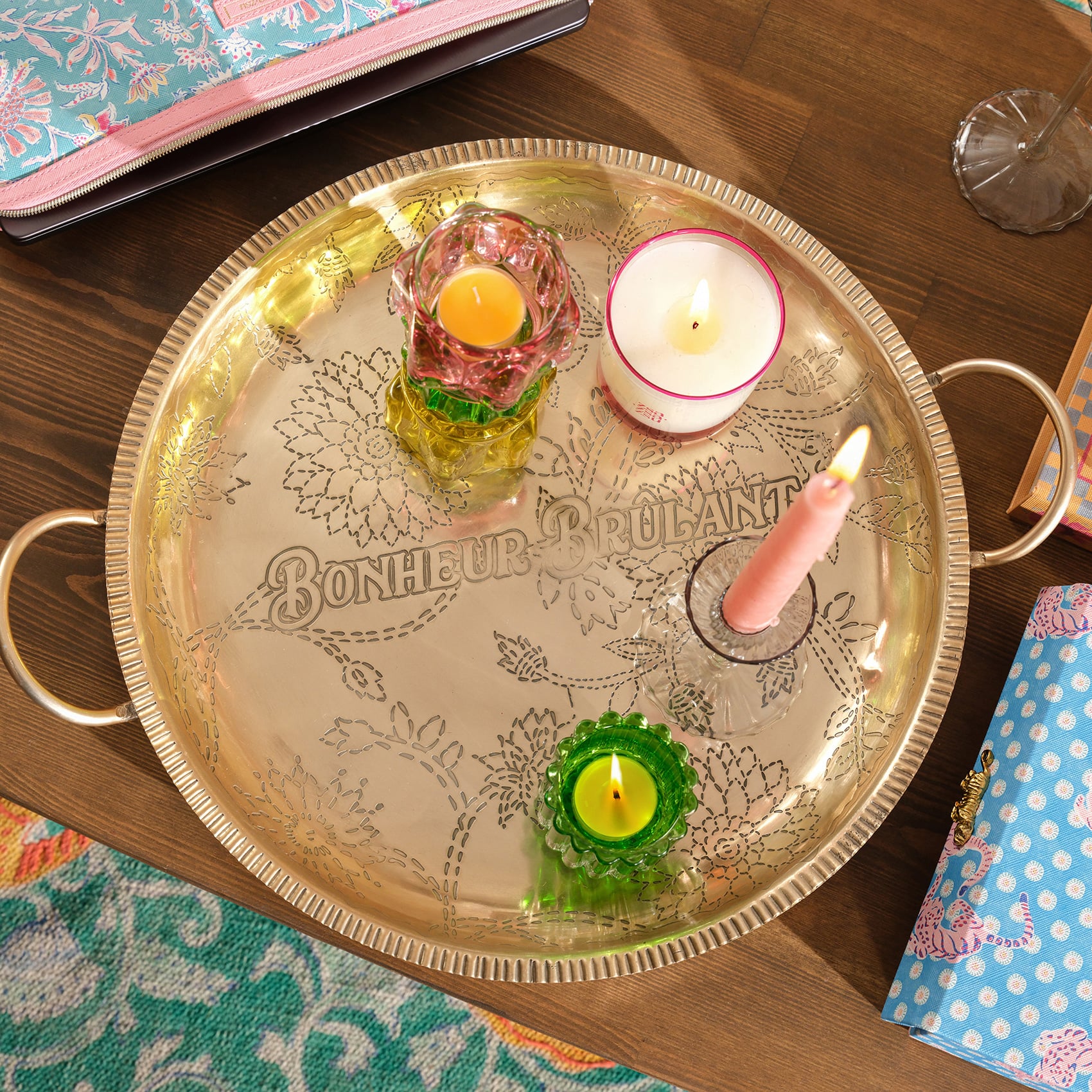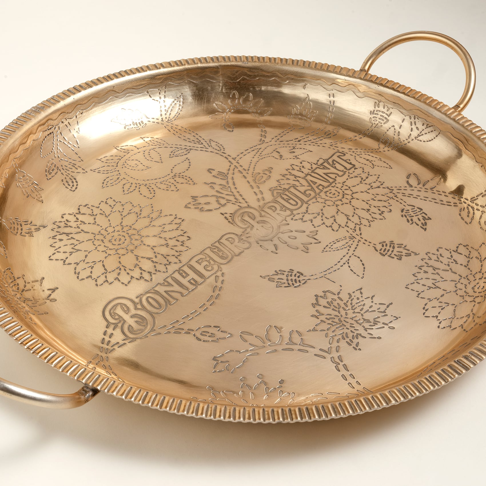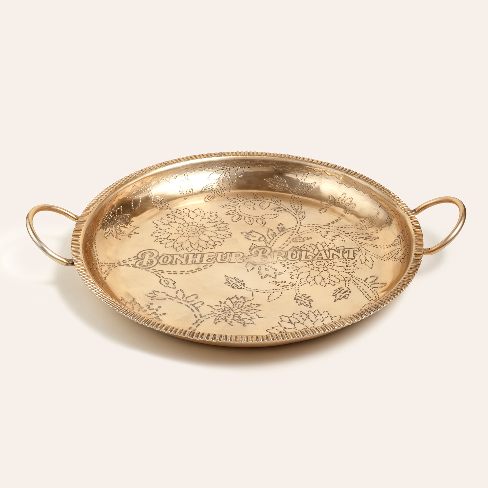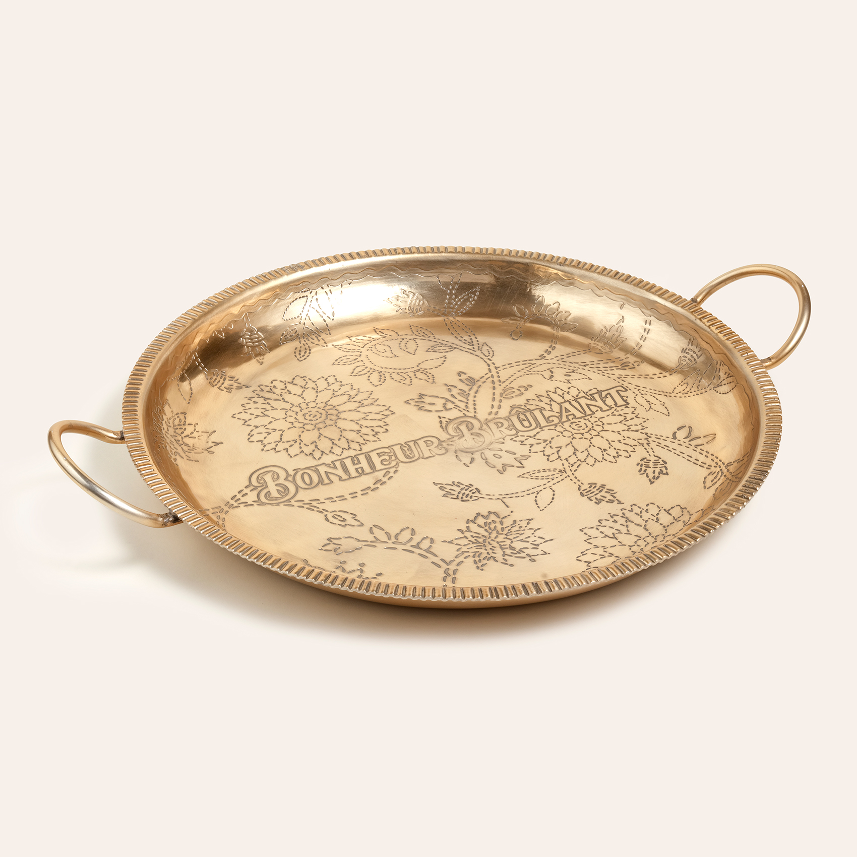 Nanpur desenli saplı yuvarlak metal dekoratif tepsi, eklektik bir sofistike stilin parçası. Hindistan’da el işçiliğiyle üretilen bu geniş ve zarif tepsi, altın yüzeyiyle dikkat çekiyor. Davet sofralarında büyük sunumlar için ideal olan tasarım, aynı zamanda mumlar ya da dekoratif objelerle tamamlandığında yaşam alanınıza farklı bir karakter katıyor. Heritage koleksiyonunun otantik havasını evinize taşırken, her detayında ustalığın izlerini hissettiriyor.