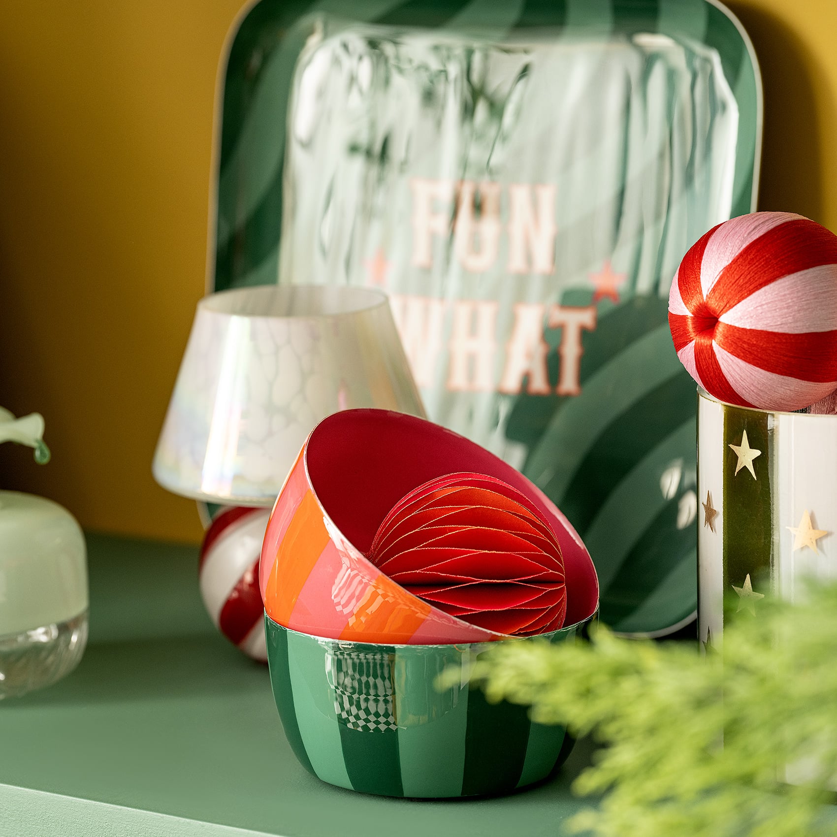 Nanpur metal dekoratif kâse, Funfair koleksiyonunun neşeli ruhunu evinize taşıyor. 11x11x5.75 cm boyutlarındaki bu enerjik kâse, çarpıcı renk birlikteliklerinin sıra dışı uyumuyla dikkat çekiyor. Hindistan’da ustalıkla el boyamasıyla tamamlanan bu şirin parça, sanki bir sanatçının fırçasından yeni çıkmış gibi canlı bir hava sunuyor. Hem dekoratif hem de işlevsel bir tasarım olan Nanpur kase, minik atıştırmalıklar veya küçük aksesuarlar için ideal bir sunum sağlıyor. Bakımı ise oldukça kolay: nemli bir bezle nazikçe silin. Gerekiyorsa elde yıkayın. Mikrodalga ve bulaşık makinesi mi? Bu şenlikte onlar yok, ama biz eğlenmeye devam ediyoruz!