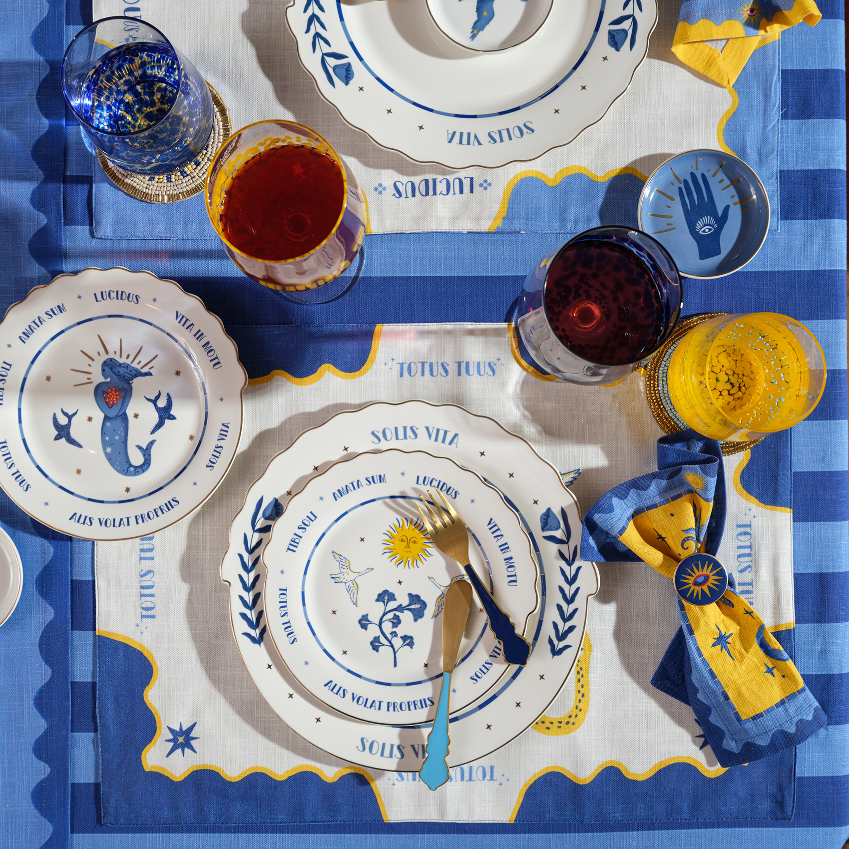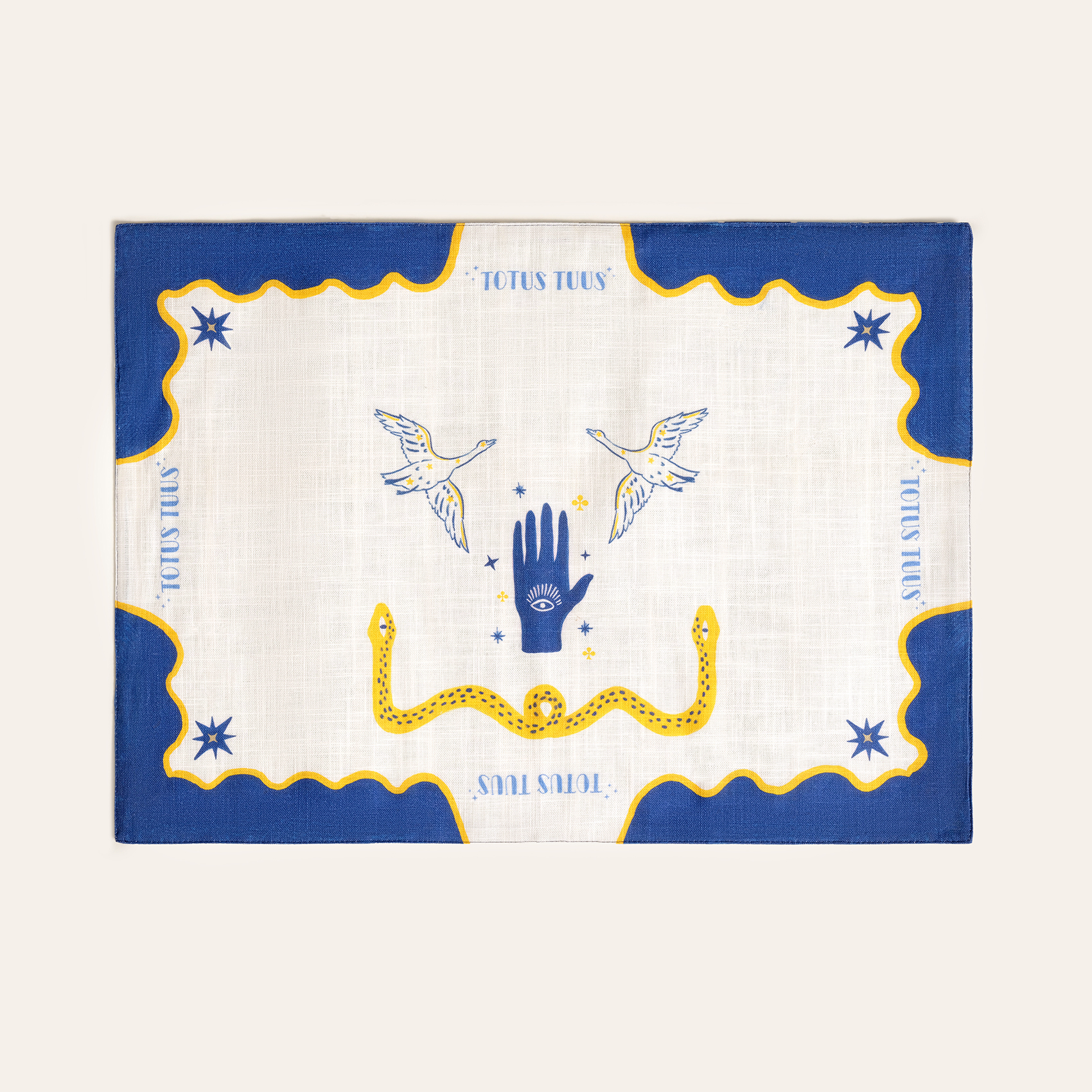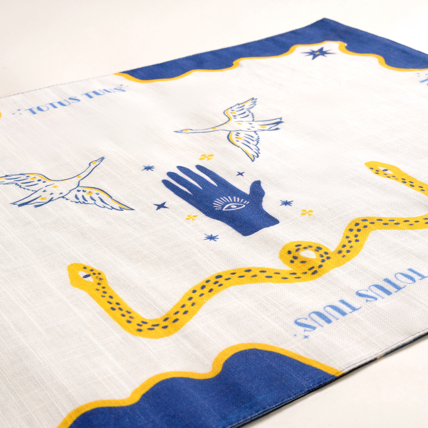 Gökyüzü ve denizin derinliklerinden ilham alan Nilüfer dijital baskılı nakışlı %100 pamuk Amerikan servis seti, mitolojik semboller, efsanevi figürler ve zarif nakış detaylarıyla sofranıza büyüleyici hikâyeler taşıyor. Türkiye’de üretilen bu özel tasarım, cesur renkleri ve çift taraflı kullanımıyla her sofrada farklı bir atmosfer yaratıyor; denizin özgürlüğünü ve gökyüzünün sonsuzluğunu yansıtarak masanıza bambaşka bir boyut katıyor.