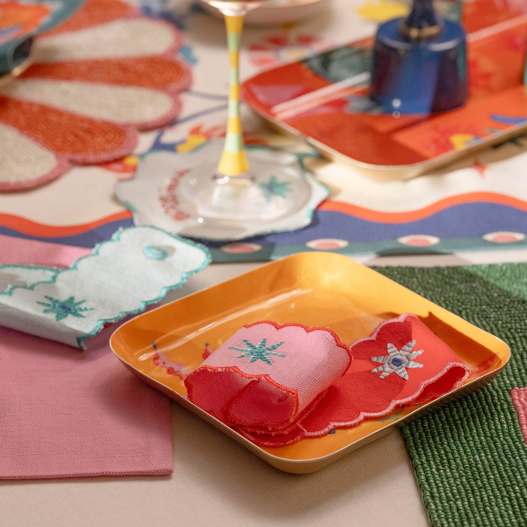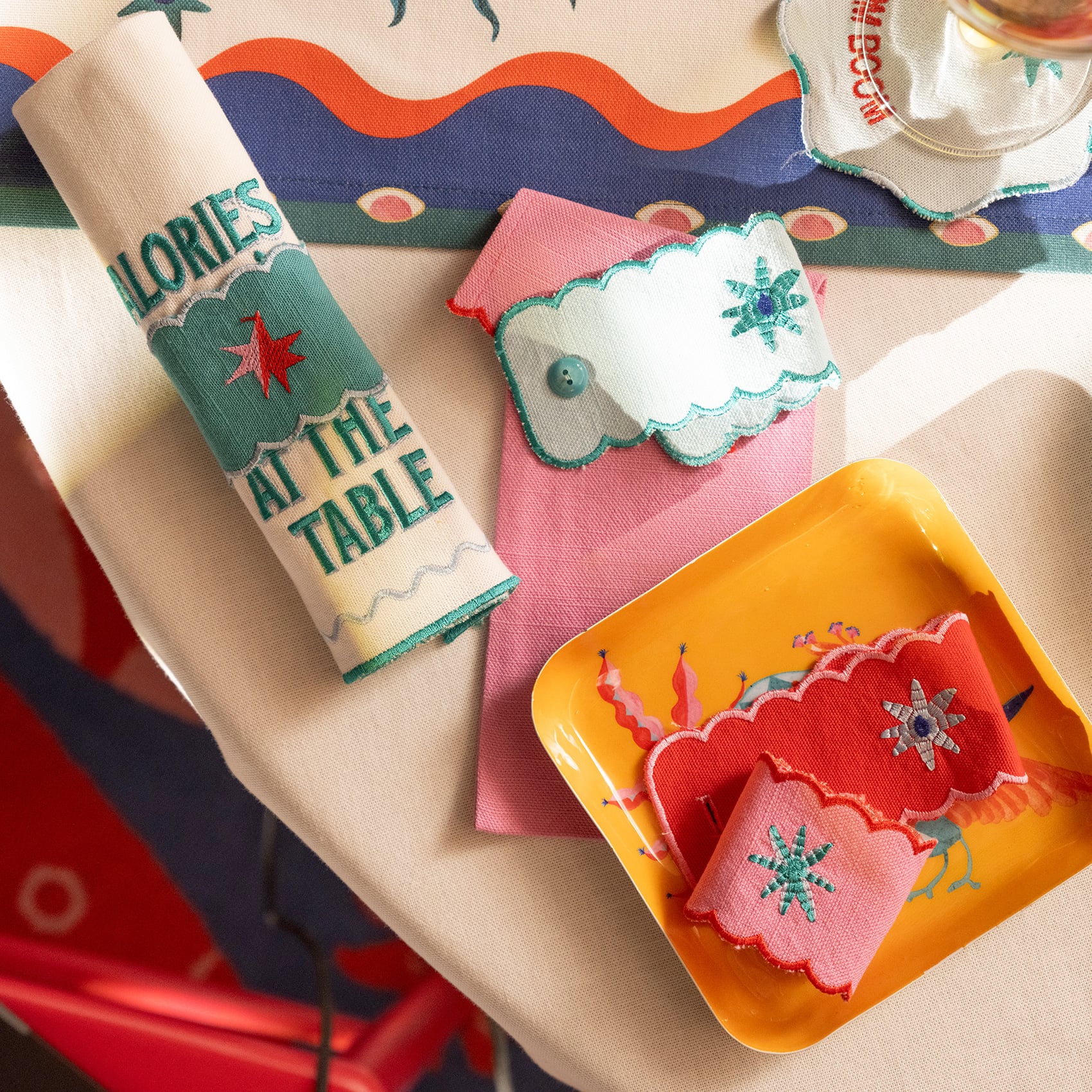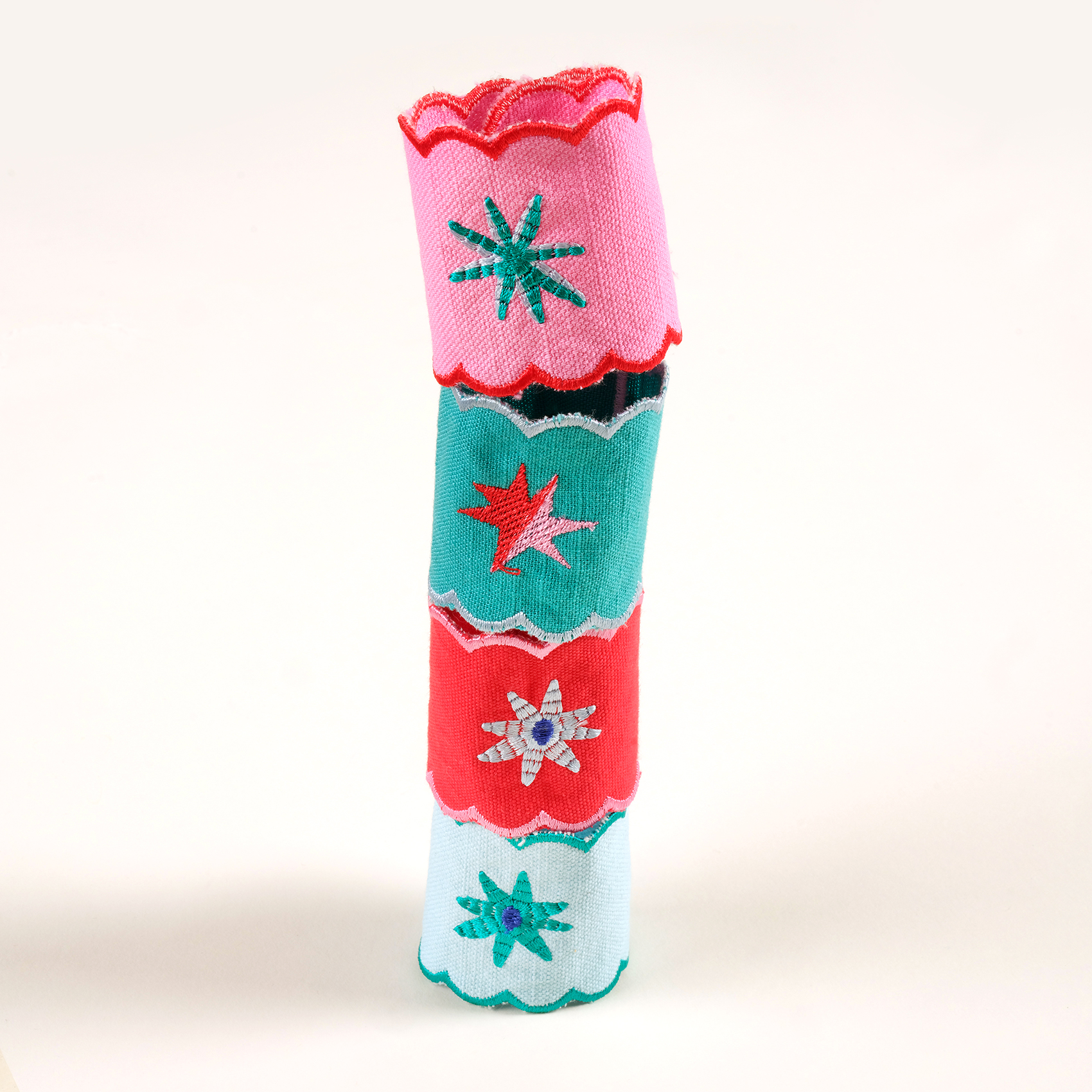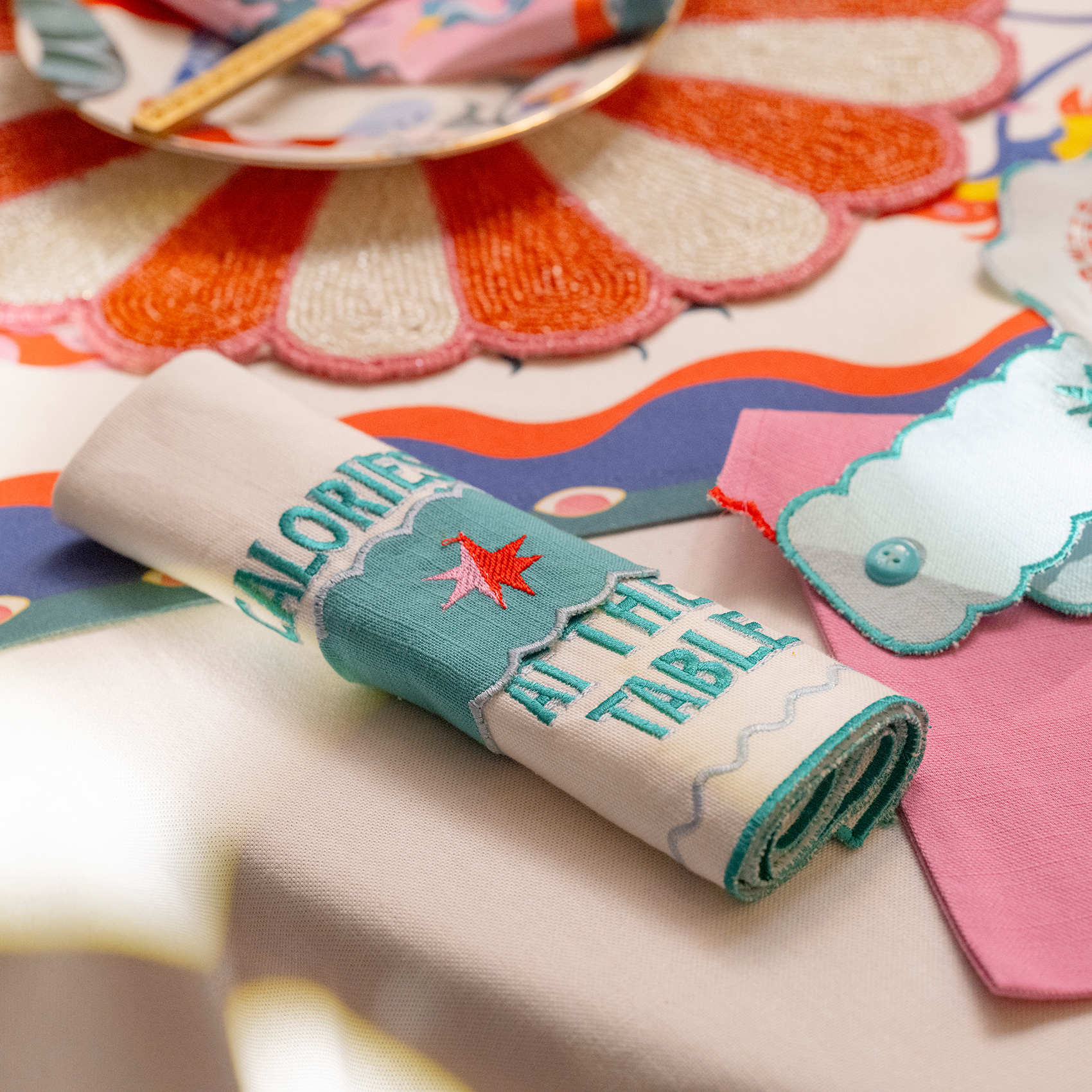 Sıradan sofralara veda, eğlence dolu detaylara merhaba! Nilüfer 4’lü dijital baskılı nakışlı %100 pamuk peçete halkası seti, doğal pamuk dokusu, dijital baskı ve nakış detaylarıyla peçeteleri şık bir dokunuşla tamamlıyor. Maximalist koleksiyonunun renkli ruhunu taşıyan tasarımıyla bu set, her sofraya cesur ve karakterli bir hava katıyor. Kendi kumaşından özel torbasıyla gelen Nilüfer peçete halkası, masanızı renklendirmek ve her yemeği kutlamaya dönüştürmek için tasarlandı.