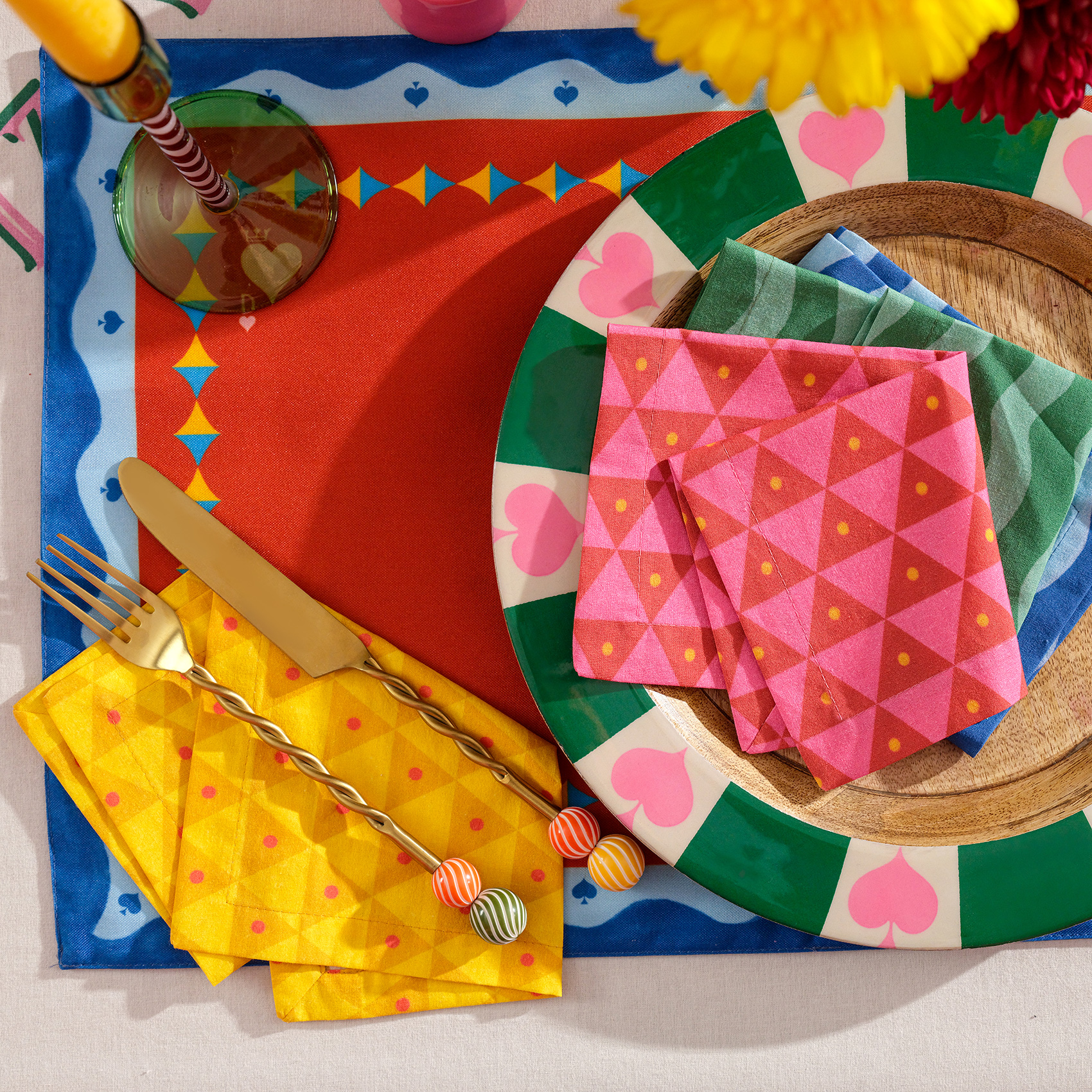 Nilüfer 4’lü peçete seti, canlı renkleri ve şans dozunu artıran desenleriyle sade bir davet sofrasını bile bir kutlama sahnesine dönüştürüyor. Dört farklı renkteki desen, tıpkı havai fişekler gibi art arda patlayan neşeli bir ritim katıyor. %100 pamuk dokusu ve dijital baskı tekniğiyle hazırlanan tasarım, 45x45 cm ölçüsüyle hem günlük sofralara hem özel buluşmalara coşkulu bir dokunuş ekliyor. Türkiye’de üretildi, Zsa Zsa Zsu tasarım ekibinin özgün imzasını taşıyor.