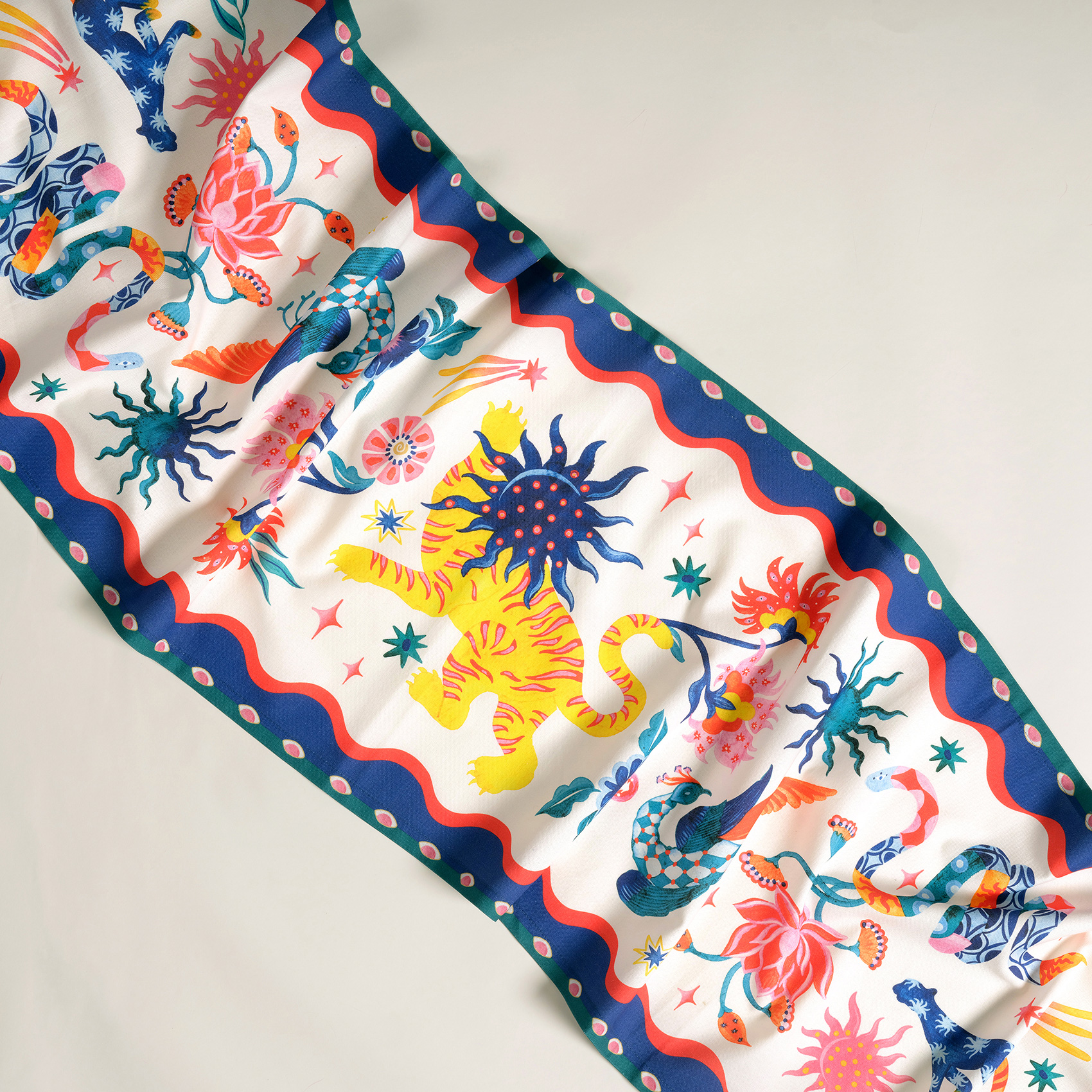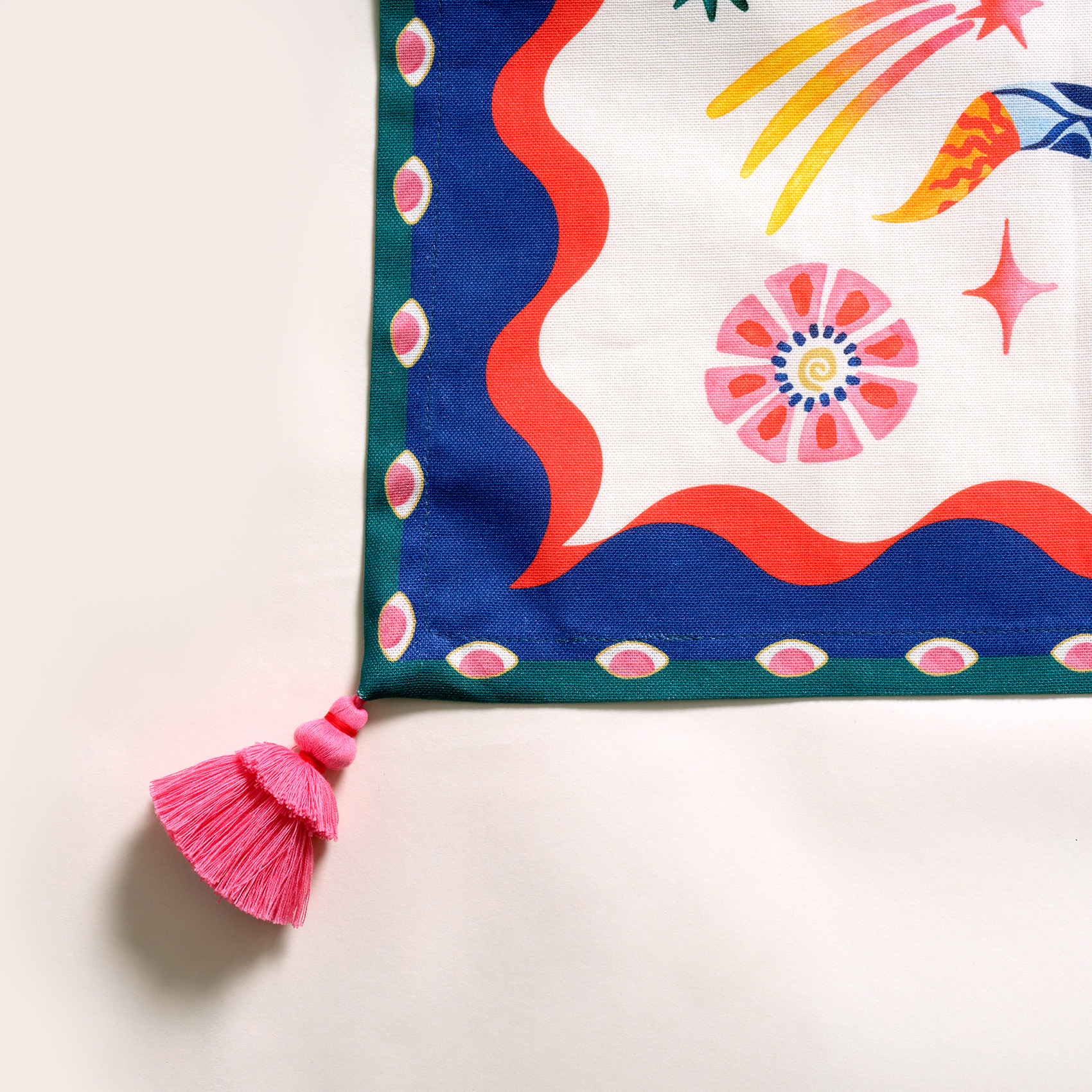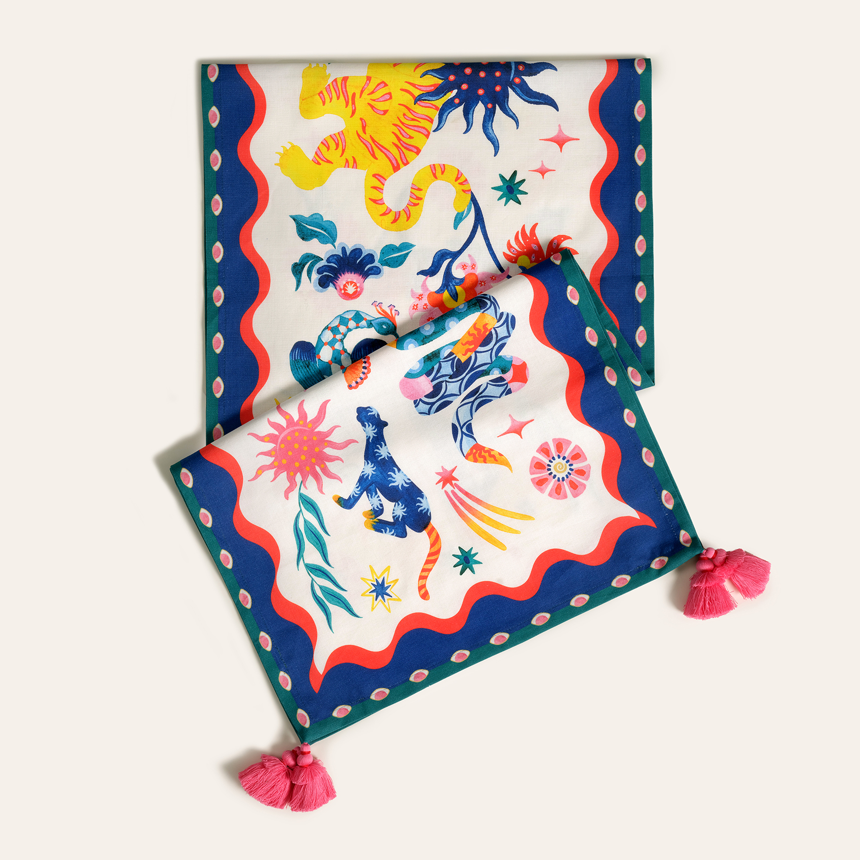 Renklerin, hareketin ve maksimalist enerjinin buluştuğu Nilüfer dijital baskılı püsküllü %100 pamuk runner, sofranızda görsel bir şölen yaratıyor. Türkiye’de üretilen ve %100 pamuktan dokunan bu canlı tasarım, mitolojik figürlerden kıvrımlı çiçeklere uzanan beklenmedik detaylarla göz alıcı bir hikâye anlatıyor. Püskül detayları ise tasarıma enerjik bir dokunuş ekleyerek sofranızda cesur ama zahmetsizce sofistike bir hava yaratıyor.