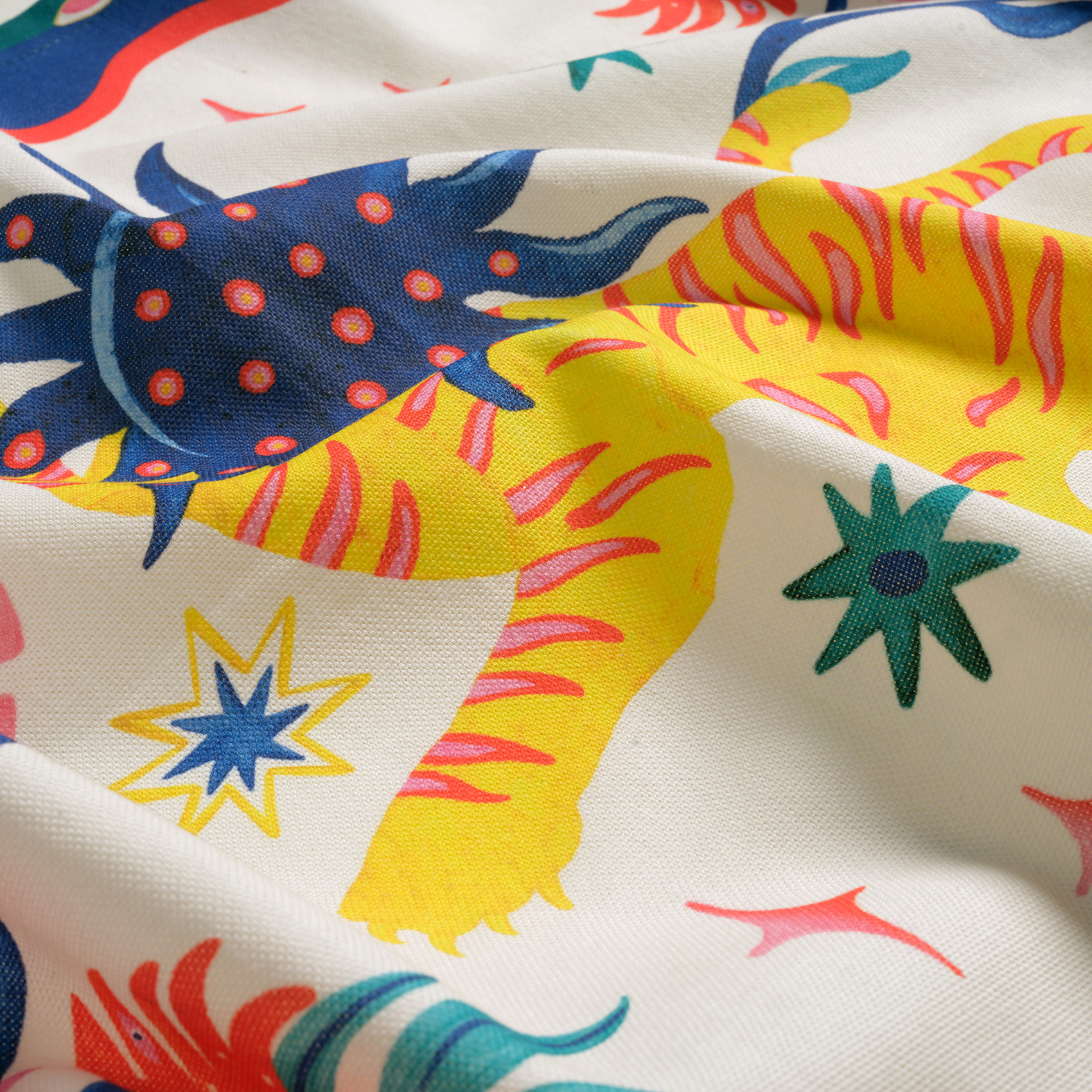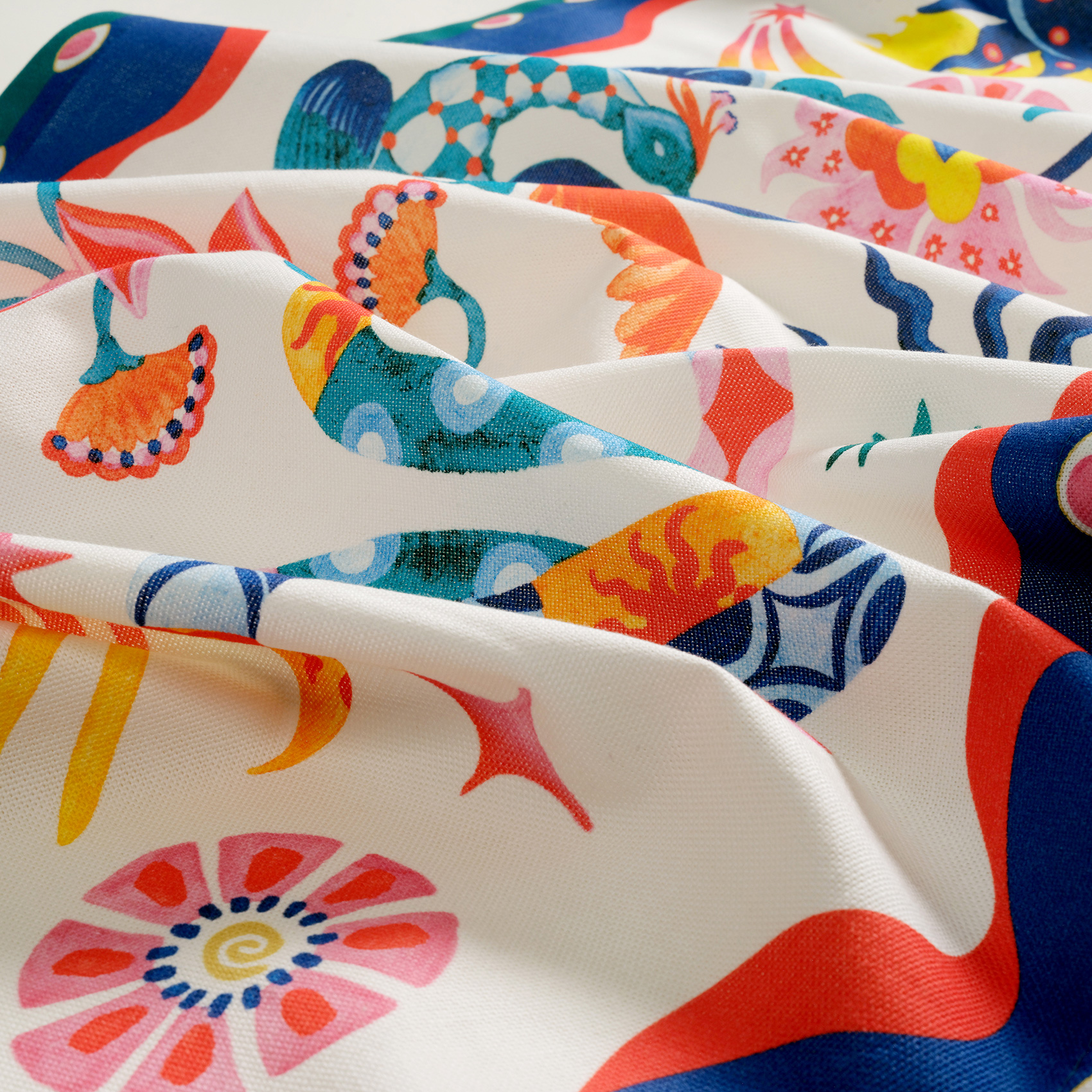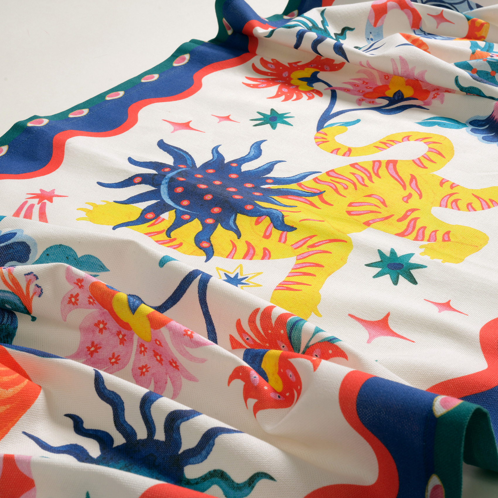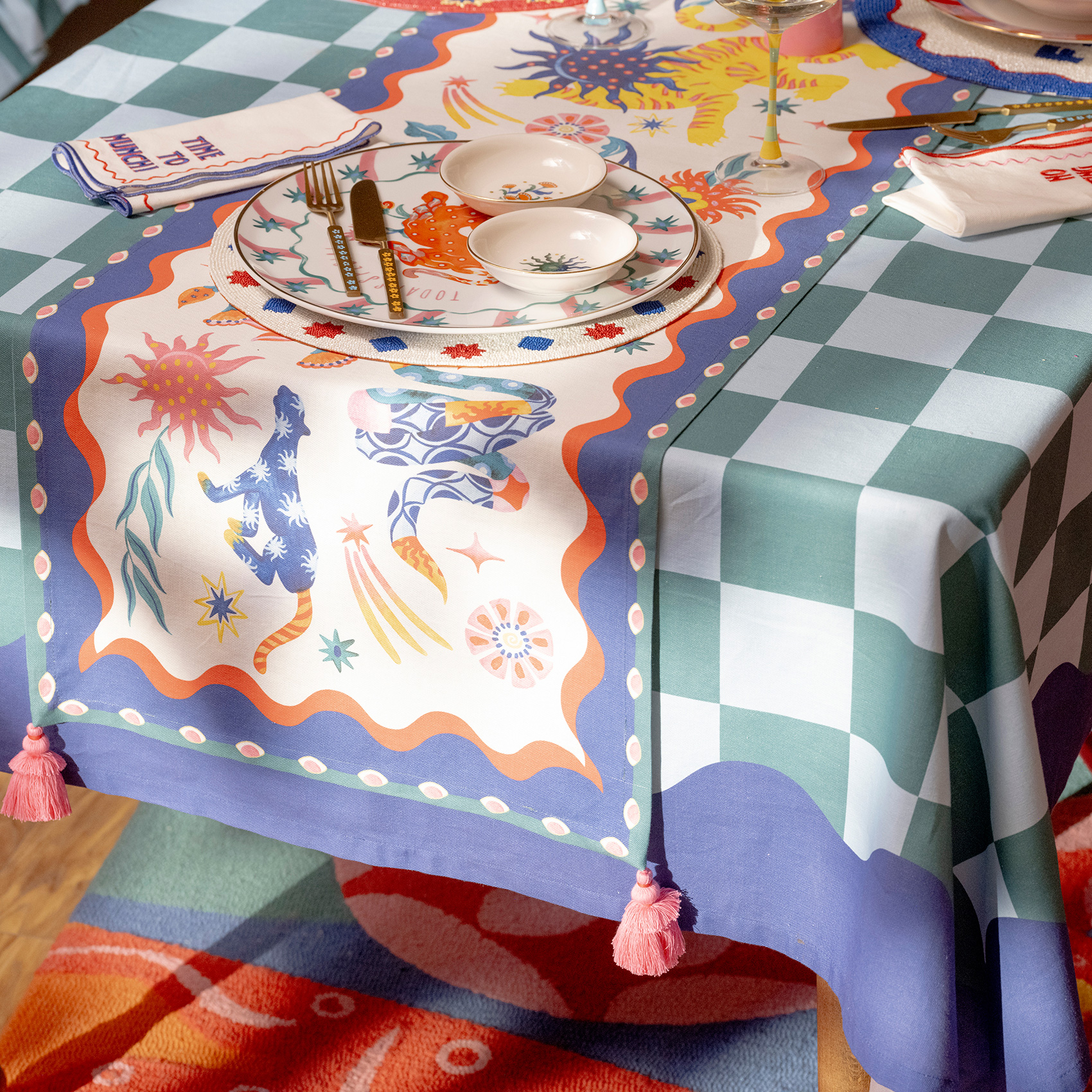 Renklerin, hareketin ve maksimalist enerjinin buluştuğu Nilüfer dijital baskılı püsküllü %100 pamuk runner, sofranızda görsel bir şölen yaratıyor. Türkiye’de üretilen ve %100 pamuktan dokunan bu canlı tasarım, mitolojik figürlerden kıvrımlı çiçeklere uzanan beklenmedik detaylarla göz alıcı bir hikâye anlatıyor. Püskül detayları ise tasarıma enerjik bir dokunuş ekleyerek sofranızda cesur ama zahmetsizce sofistike bir hava yaratıyor.