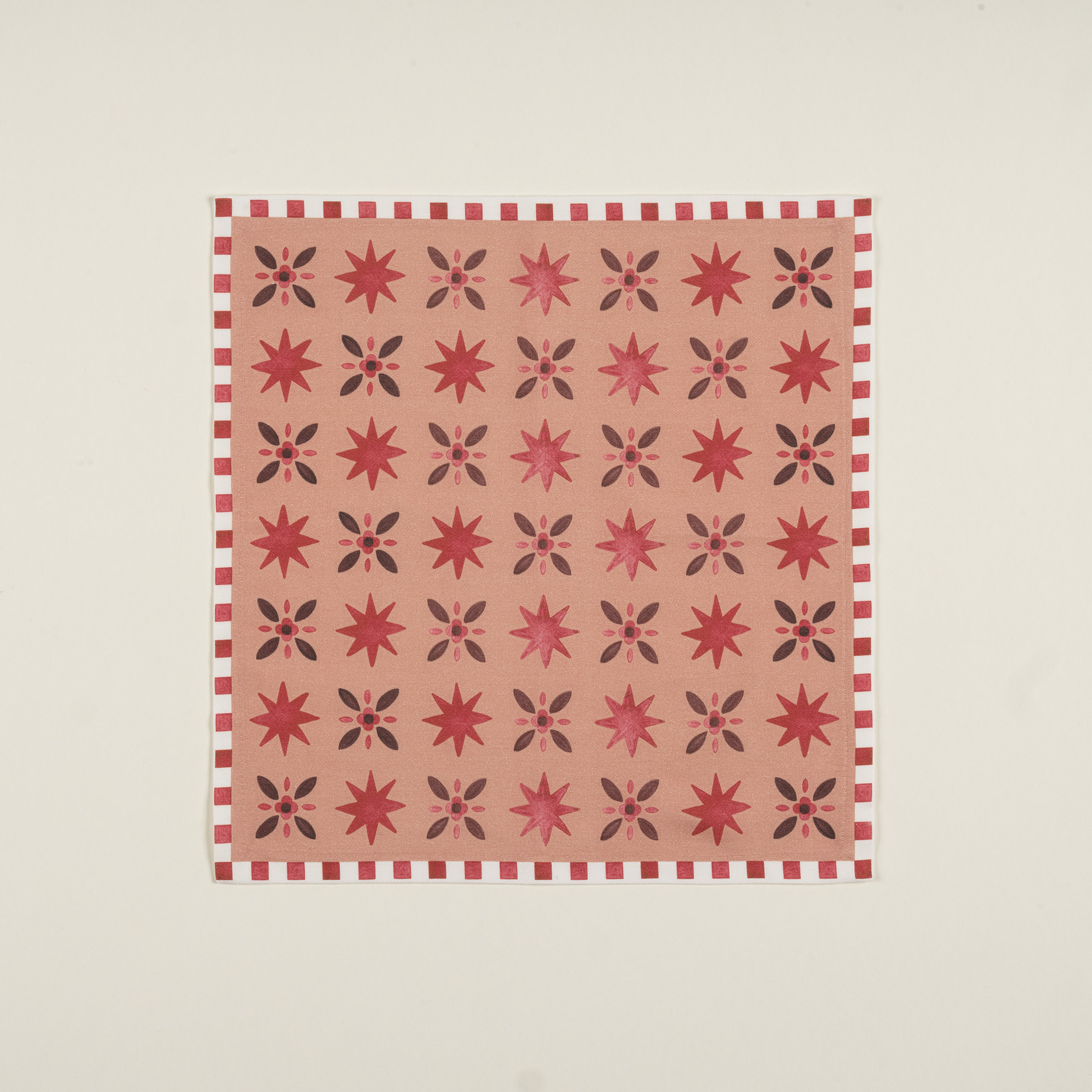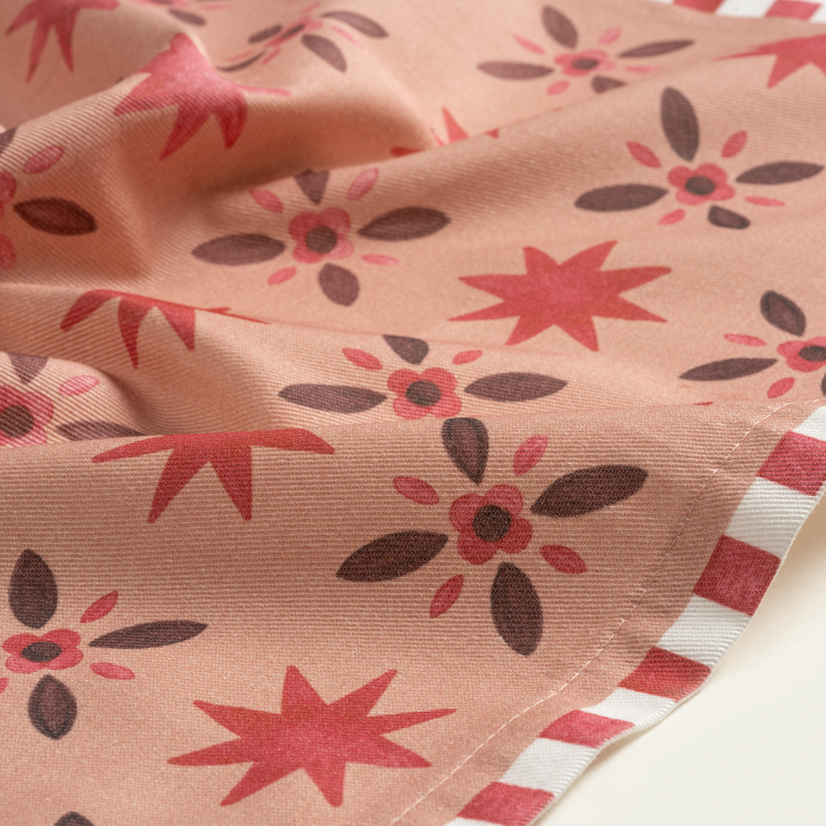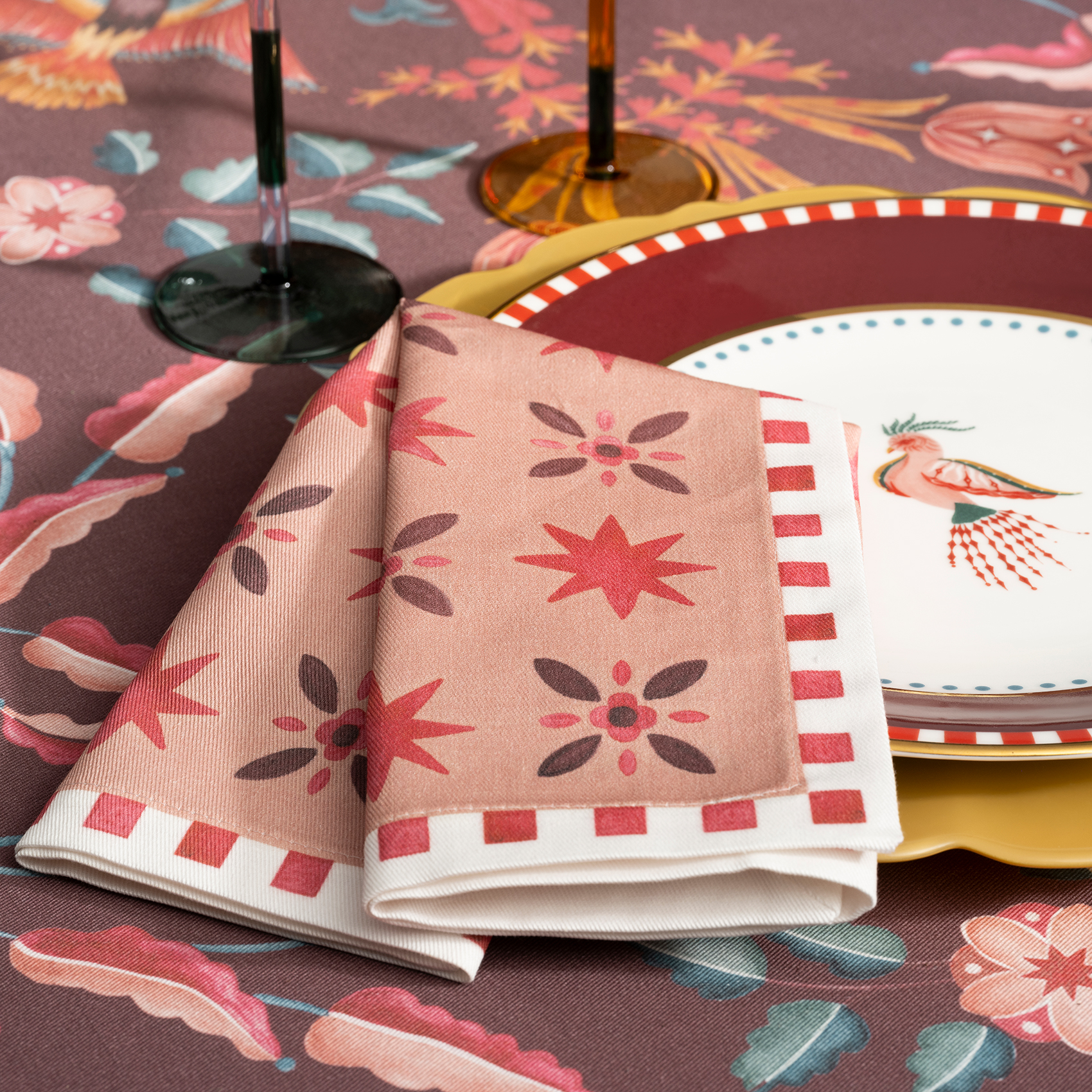 Maximalist dünyasından gelen Nilüfer peçete, çiçek desenlerini adeta bordo ve pembe bir dans partisine davet ediyor. %100 sürdürülebilir pamuktan üretildiği için stil sahibi olduğu kadar doğayla da dosttur. 45x45 cm boyutuyla ve sofistike overlok kenarlarıyla stil oyununda zirvede olduğunu fısıldayan bu peçete, sofralarınızı bir şölene çevirirken her detayında eğlence ve doğaya saygıyı bir araya getiriyor.