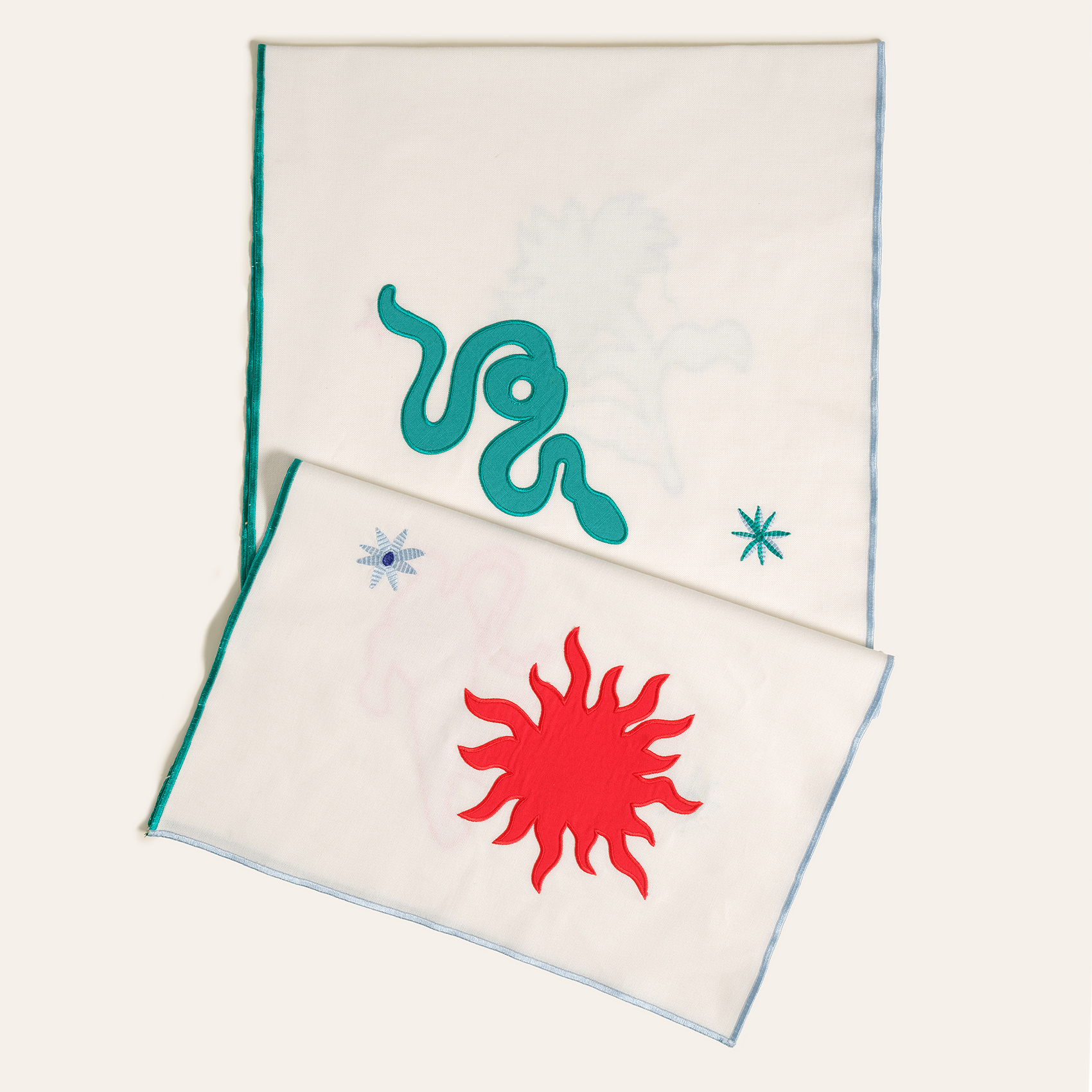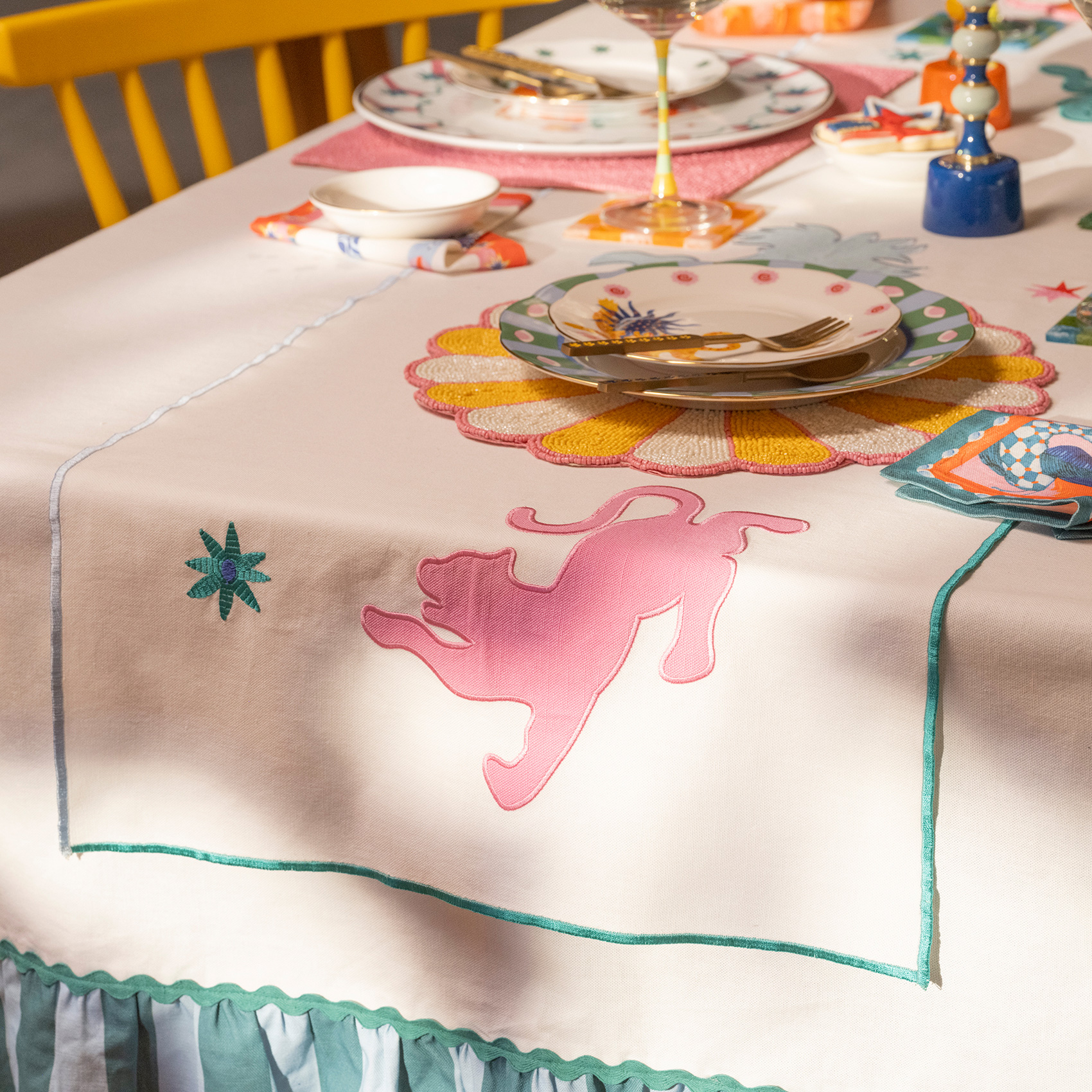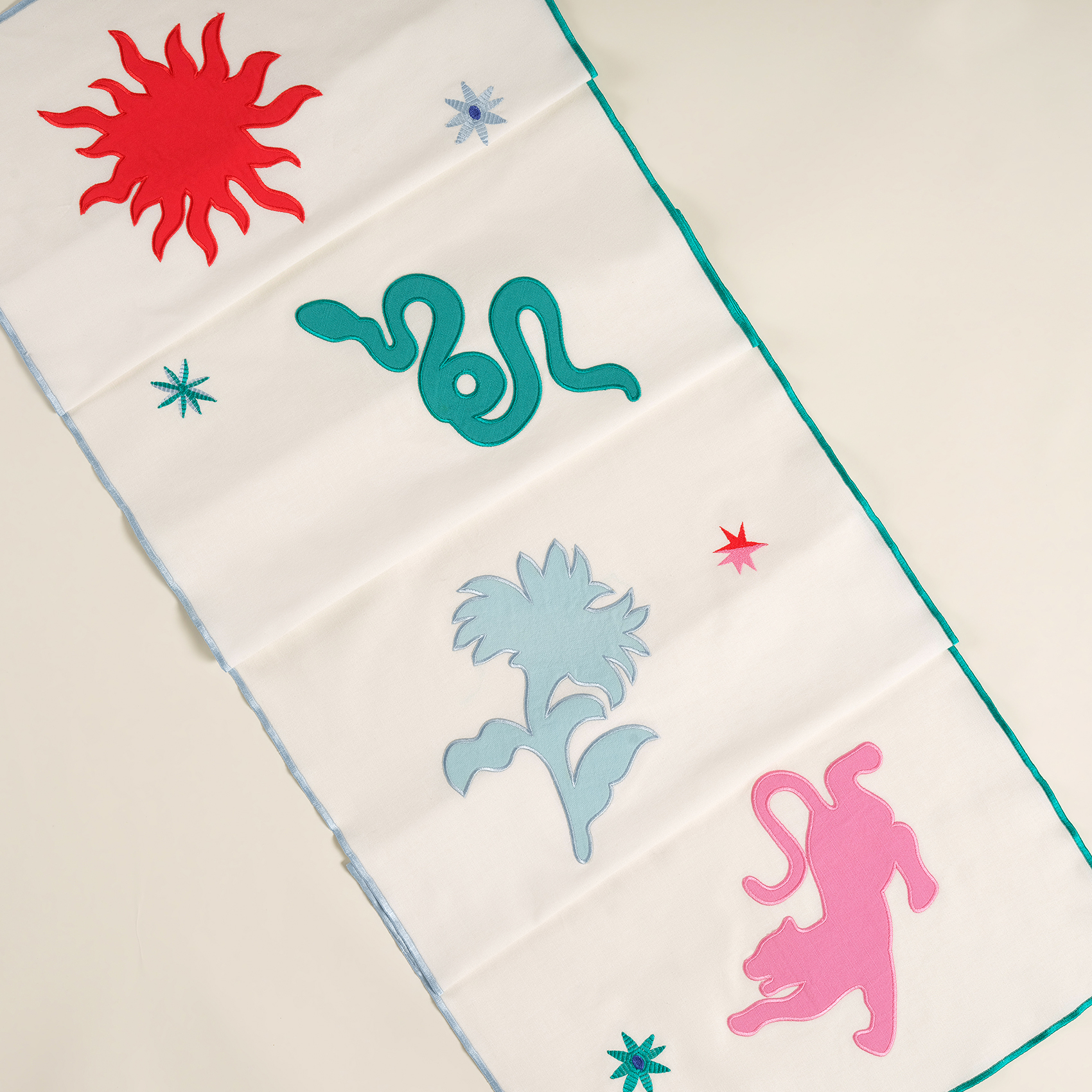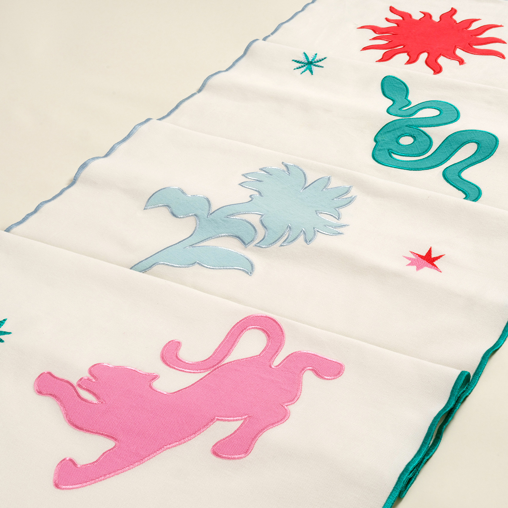 Cesur, eğlenceli ve karakter dolu bir sofra için Nilüfer overloklu nakışlı %100 pamuk runner tam da aradığınız parça! %100 pamuk dokusu, overlok detayları ve yaratıcı nakışlarıyla masanızda maksimalist bir atmosfer yaratıyor. Eğlenceli figürleriyle sofranıza hareket katarken, her detayıyla stilinizi konuşturuyor. Türkiye’de üretilen bu özel tasarım, yemek davetlerinize enerjik bir ruh katmanız için tasarlandı.