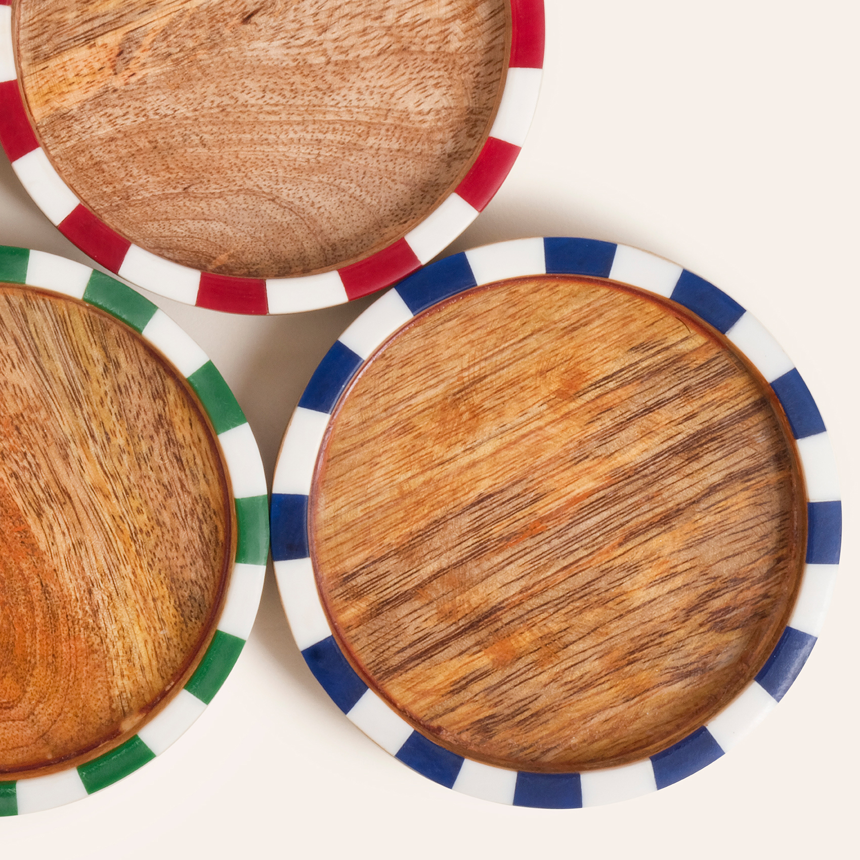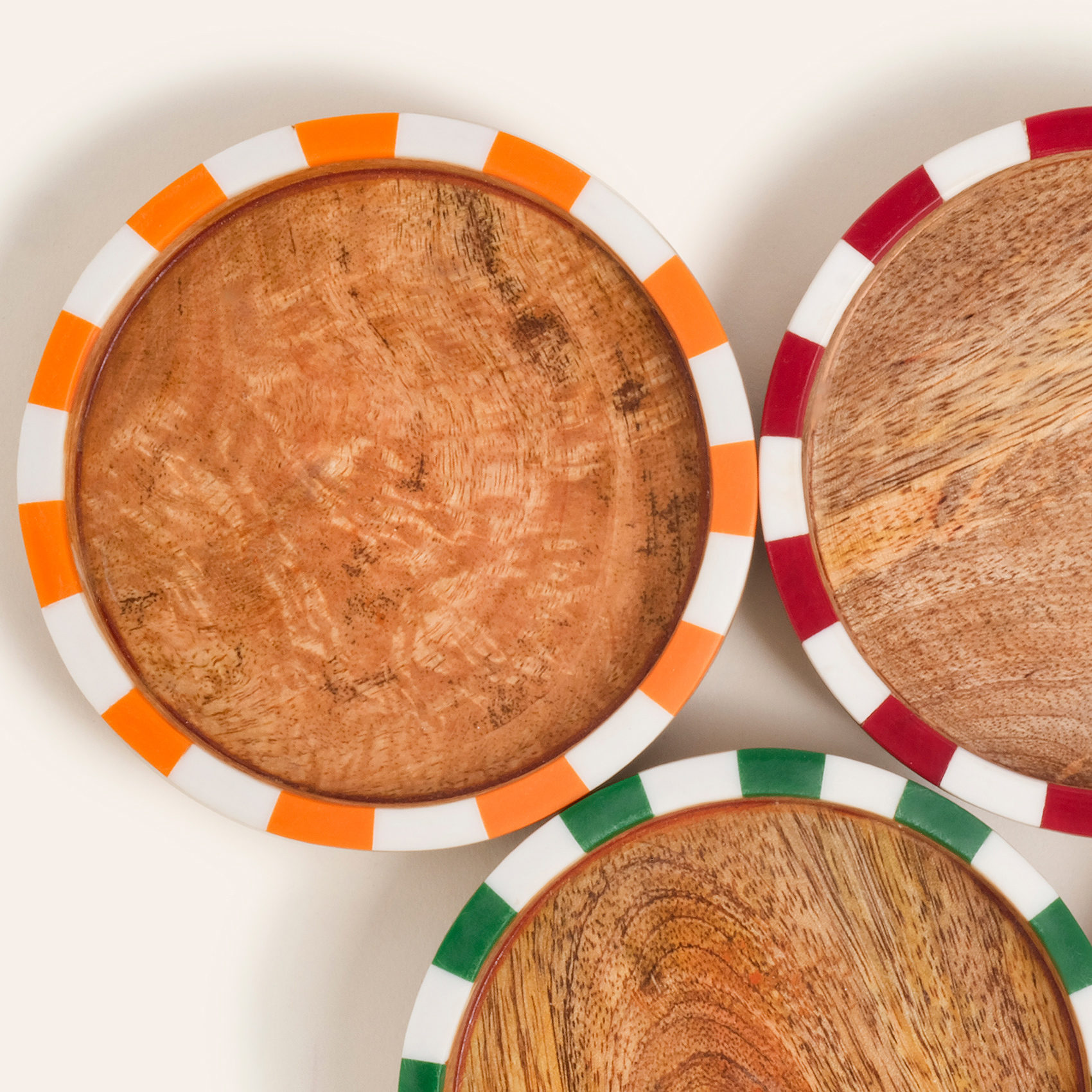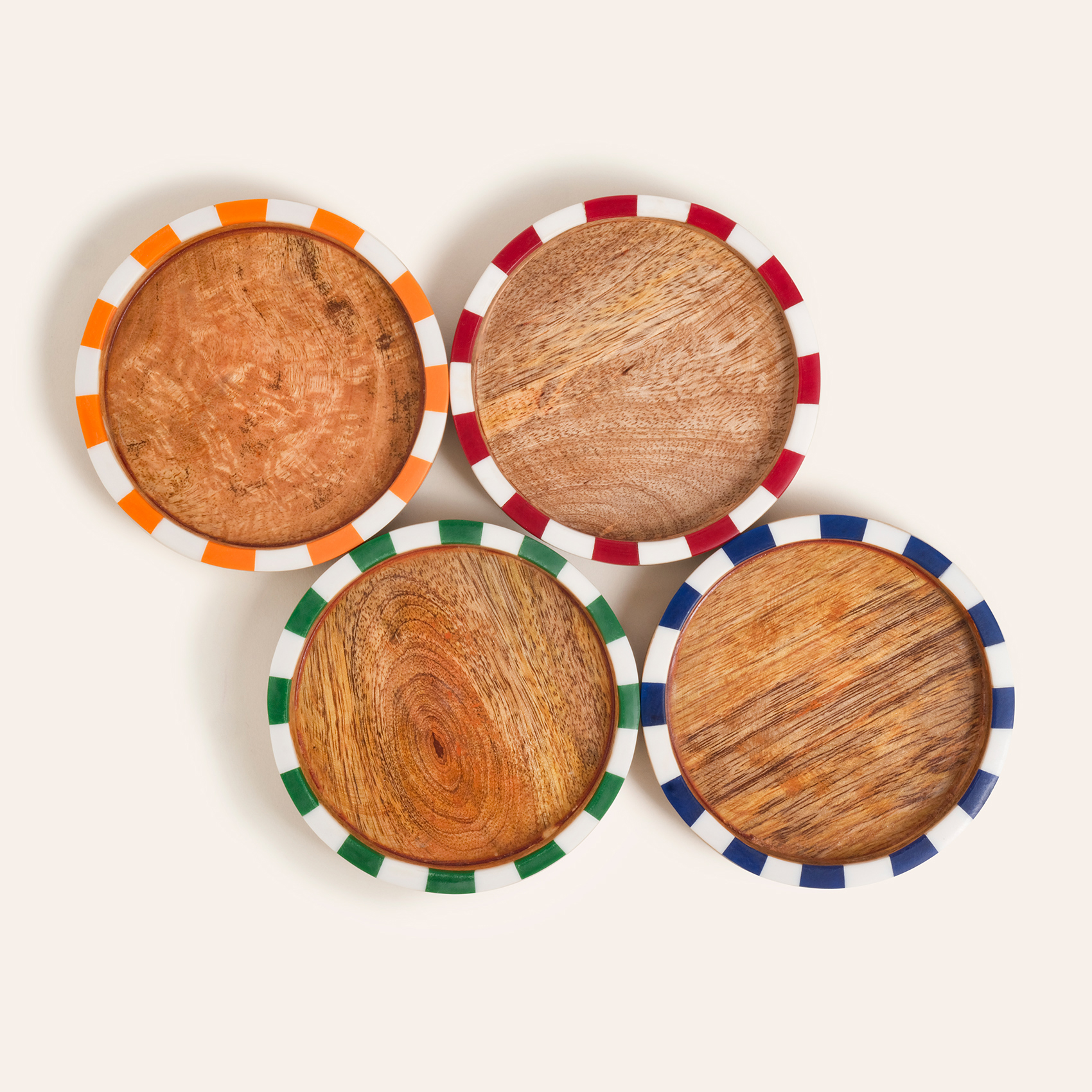 Hindistan’da usta zanaatkârların elinde şekillenen bu dört neşeli bardak altlığı, mango ağacının doğal yüzeyini cıvıl cıvıl reçine detaylarla çevreliyor. Her biri farklı renkte ve el yapımı, bu yüzden hem takım hem tekil birer karakter. Maximalist koleksiyonunun renk oyunlarını sofranıza taşırken, sıcak ve soğuk içecekler için eğlenceli bir zemin sunuyor. Elde yıkayın, nazikçe kurulayın.