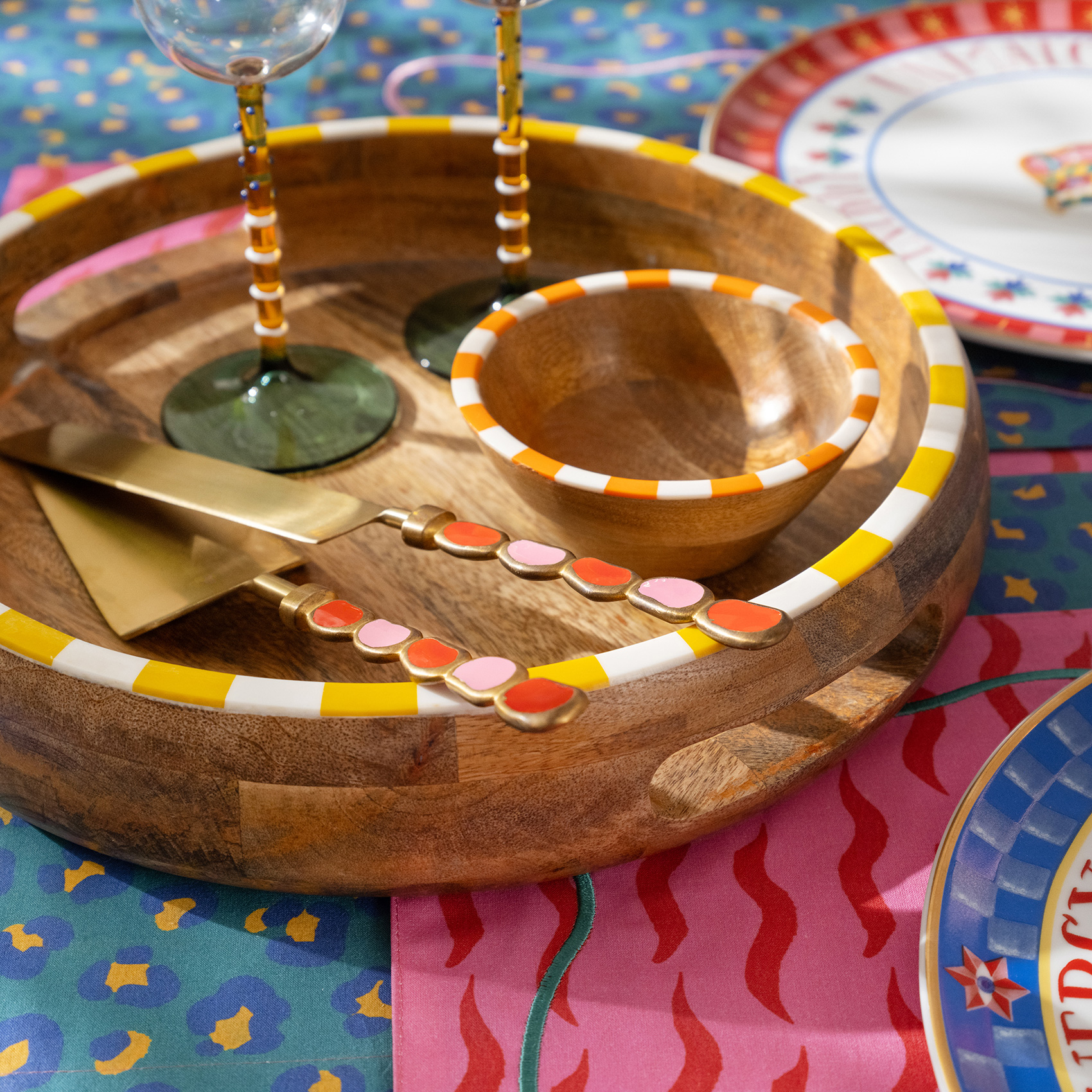 Göz alıcı ve kullanışlı! Hindistan’daki usta ellerde şekillenen bu Nohar tepsi, mango ağacının zarif dokusunu sarı-beyaz reçine şeritlerle renklendiriyor. Yuvarlak formu ve yanlardaki rahat kavrama boşluklarıyla servis etmenin en eğlenceli hali. El yapımıdır, her biri kendine özgü bir canlılık taşır. Elde yıkayın, nazikçe kurulayın.