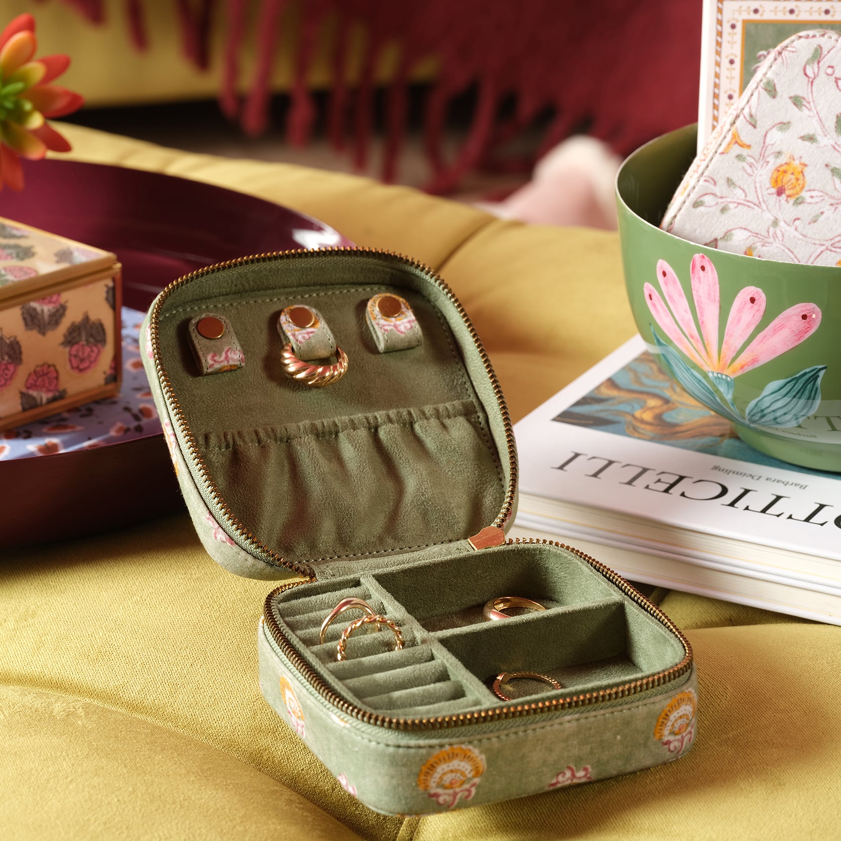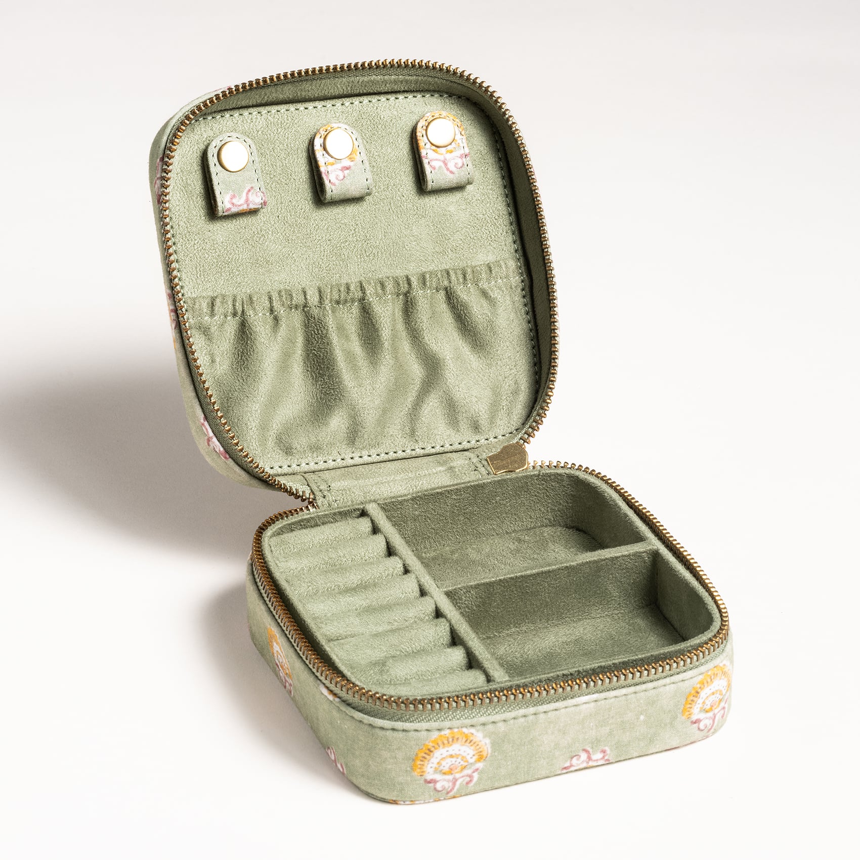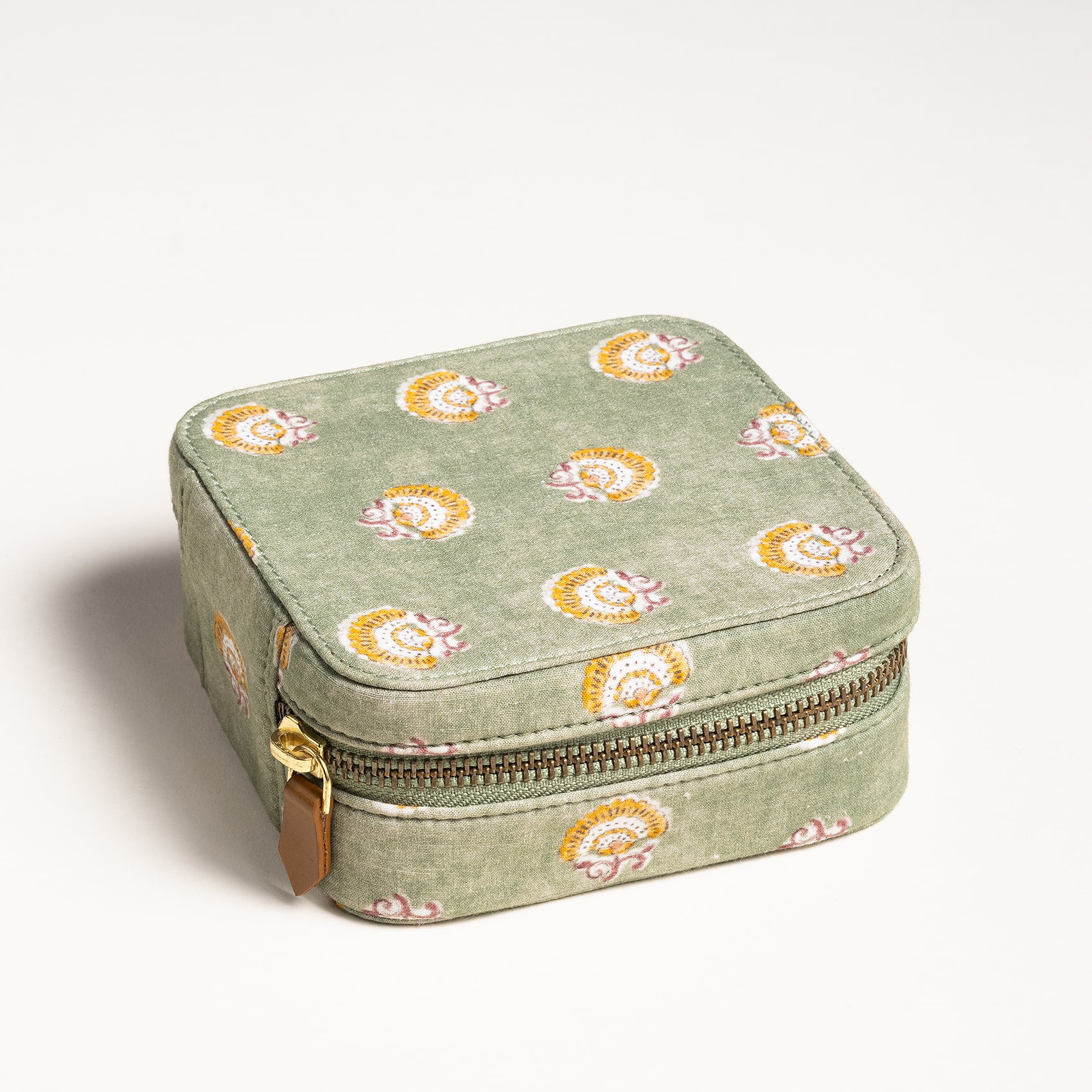 Usta zanaatkârlar tarafından özenle tasarlanmış olan bu takı kutusu, her bir detayında ince işçiliğin ve geleneksel sanatın zarafetini taşıyor. İç kısmındaki bölmeler, takılarınızı düzenlemek için mükemmel bir çözüm sunuyor; her parça için ayrı bir alan sağlandığından düzenli bir görünüm elde etmek çok kolay. %100 pamuk kumaşla kaplanmış olan Noida takı kutusu Hindistan’da üretilmiştir.