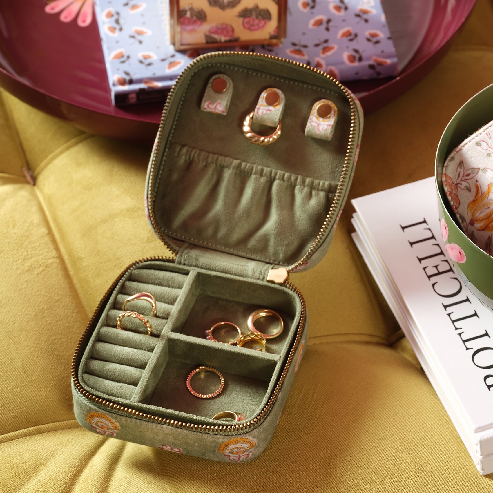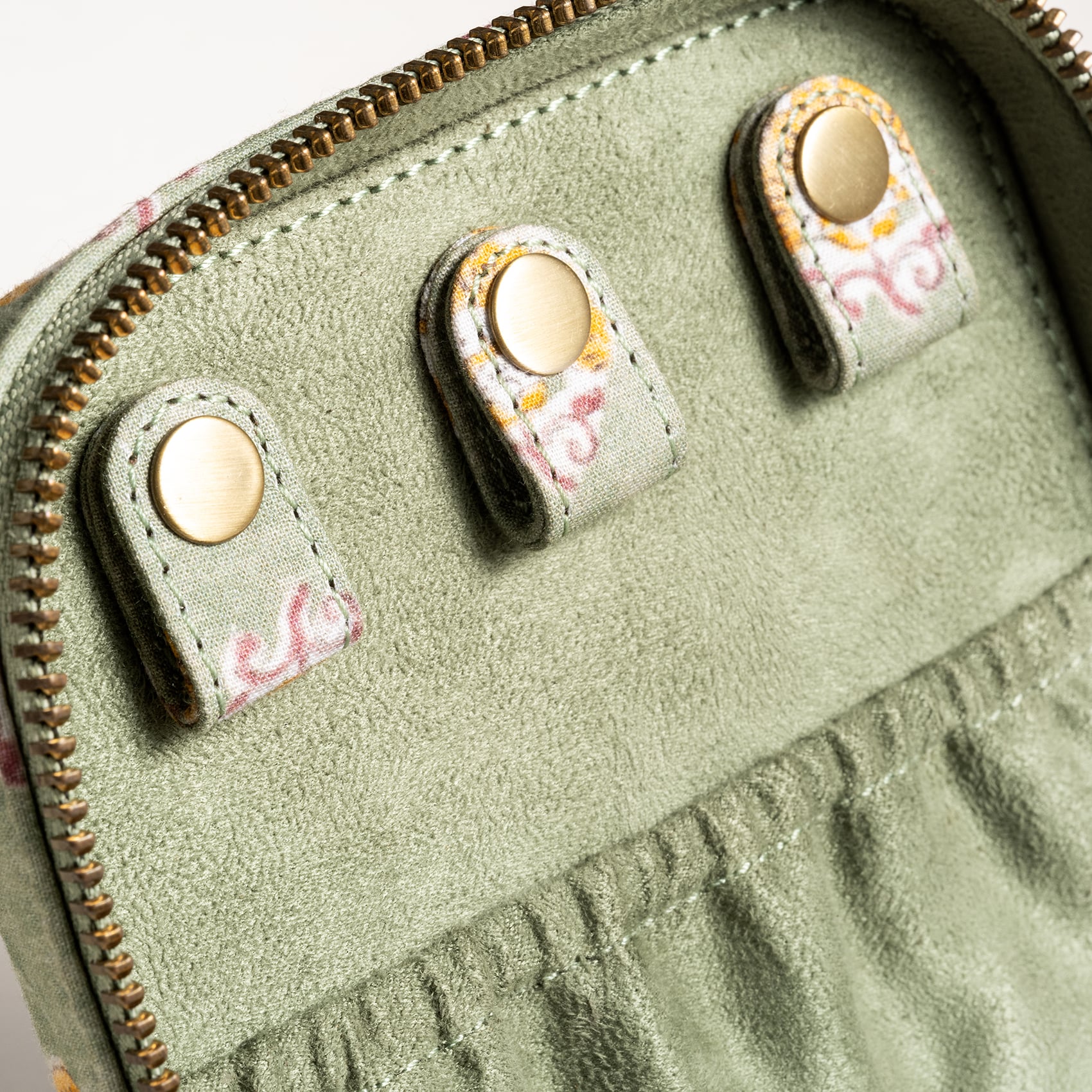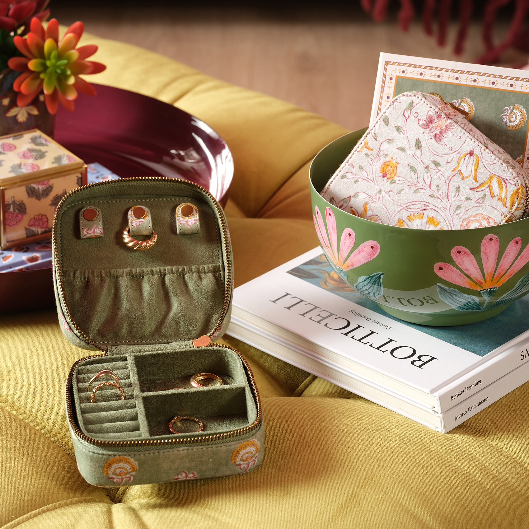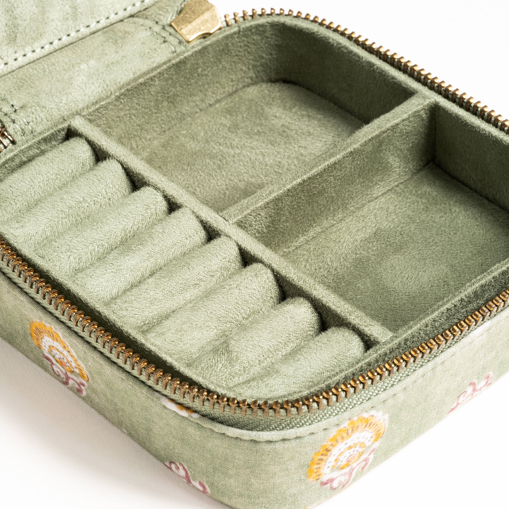 Usta zanaatkârlar tarafından özenle tasarlanmış olan bu takı kutusu, her bir detayında ince işçiliğin ve geleneksel sanatın zarafetini taşıyor. İç kısmındaki bölmeler, takılarınızı düzenlemek için mükemmel bir çözüm sunuyor; her parça için ayrı bir alan sağlandığından düzenli bir görünüm elde etmek çok kolay. %100 pamuk kumaşla kaplanmış olan Noida takı kutusu Hindistan’da üretilmiştir.