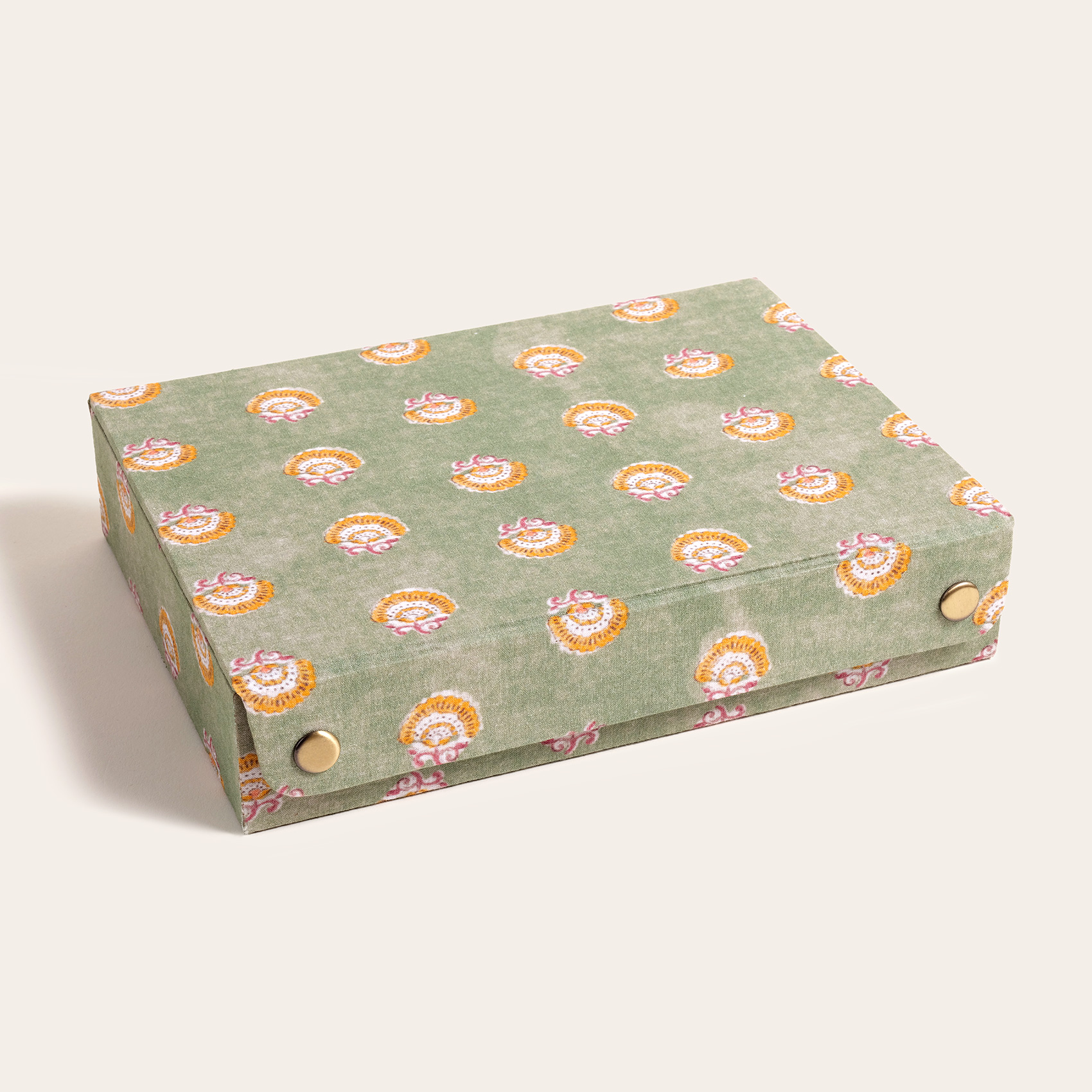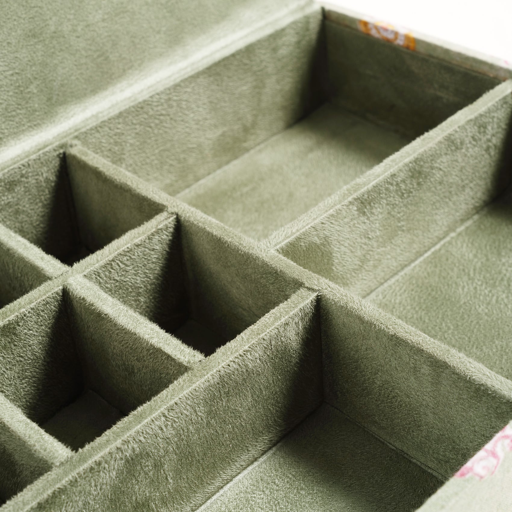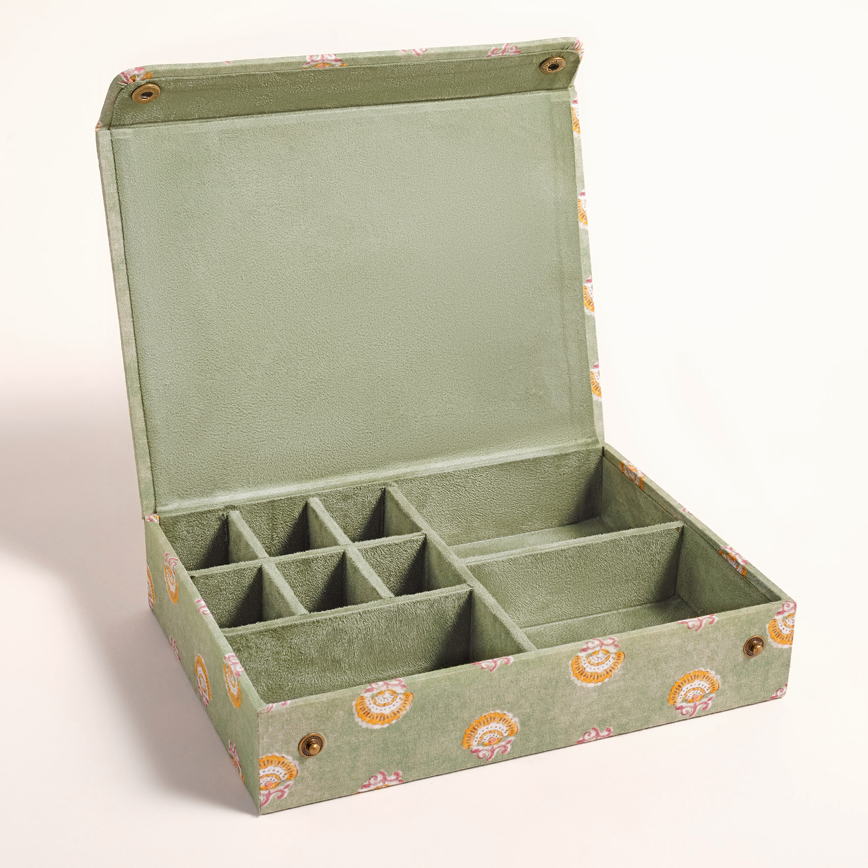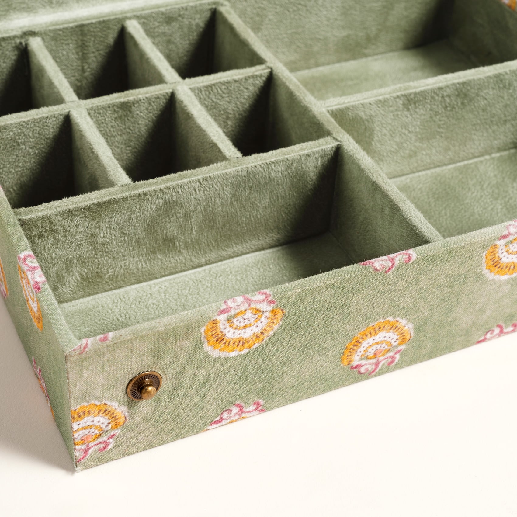 Usta zanaatkârlar tarafından özenle tasarlanmış olan bu takı kutusu, her bir detayında ince işçiliğin ve geleneksel sanatın zarafetini taşıyor. İç kısmındaki bölmeler, takılarınızı düzenlemek için mükemmel bir çözüm sunuyor; her parça için ayrı bir alan sağlandığından düzenli bir görünüm elde etmek çok kolay. %100 pamuk kumaşla kaplanmış olan Noida takı kutusu Hindistan’da üretilmiştir.