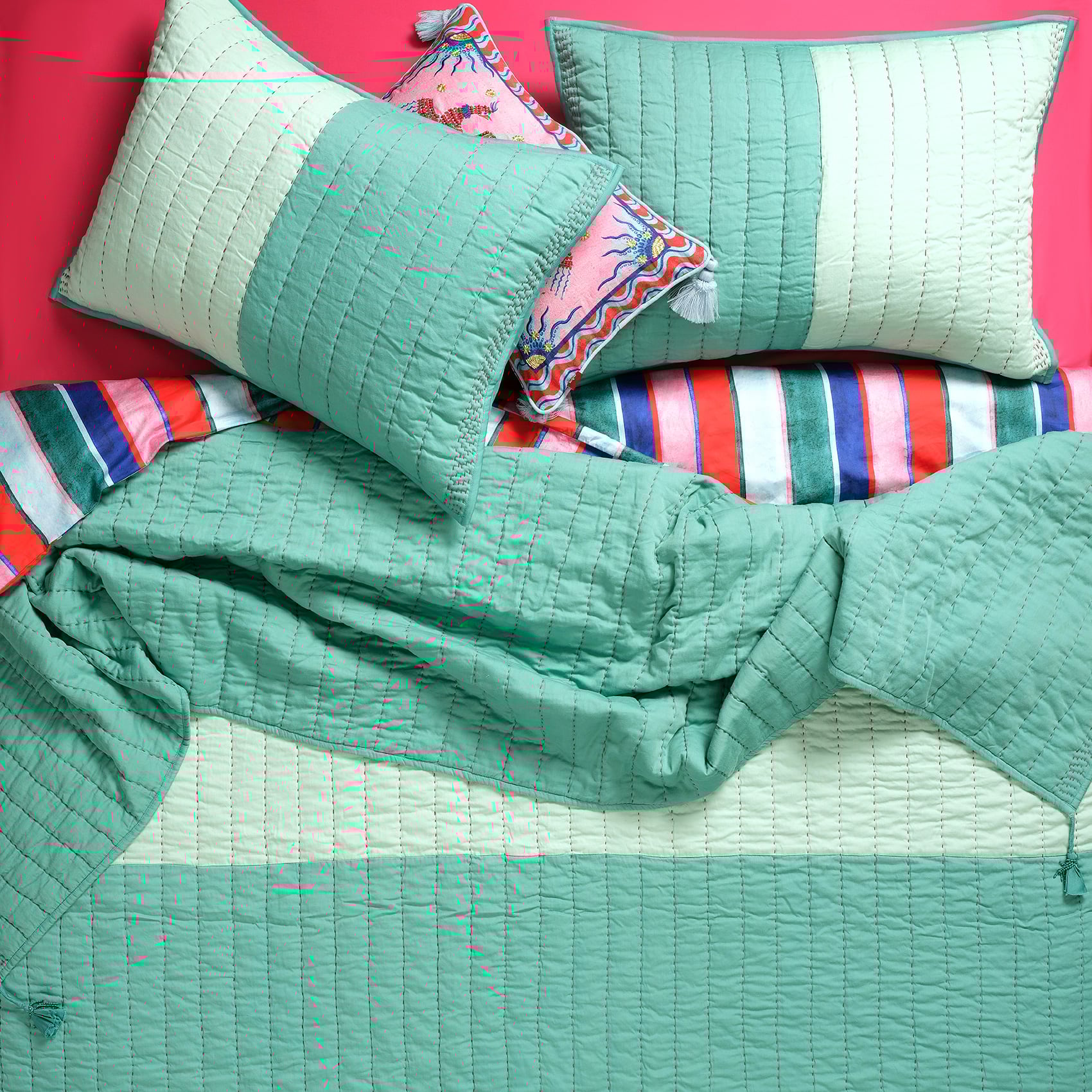 %100 pamuk satenin yumuşak dokusu ve el işçiliğiyle hazırlanan kapitone detaylar, bu tasarımı geçmişin otantik zarafetiyle buluşturuyor. Hindistan’da zanaatkârların ellerinde hayat bulan Okhla el işi kapitoneli yatak örtüsü seti, Zsa Zsa Zsu’nun Heritage koleksiyonunun eklektik ruhunu taşıyor. Yeşil tonlarıyla sofistike bir atmosfer yaratırken, her dikişte artizanların emeği var. İki adet pamuk saten yastık kılıfıyla tamamlanan bu eşsiz parça, yatak odanızın stilini eşsiz kılacak. Bu özel tasarımı 30° hassas programda yıkayın, düşük ısıda kurutun ve ütü yapmaktan kaçının.