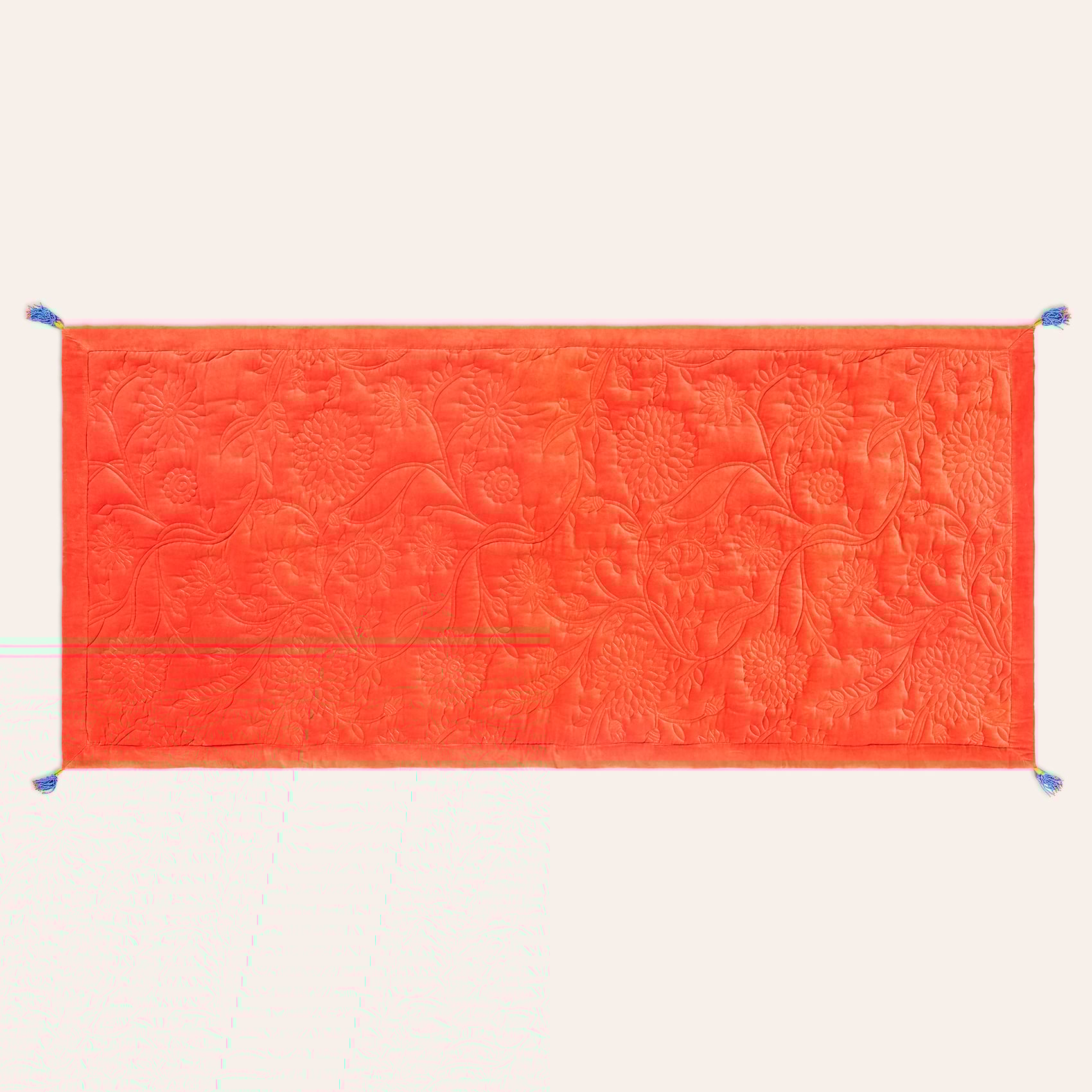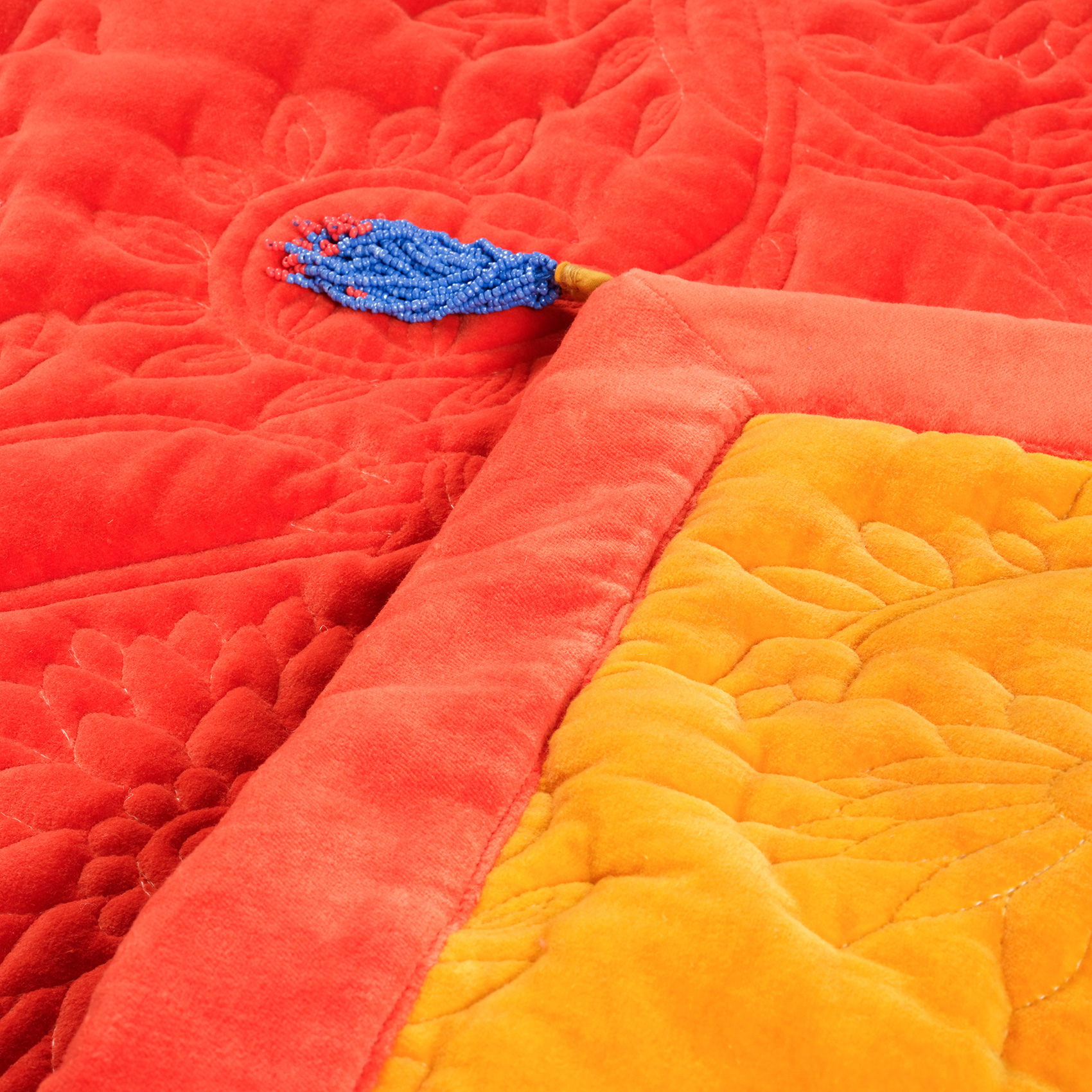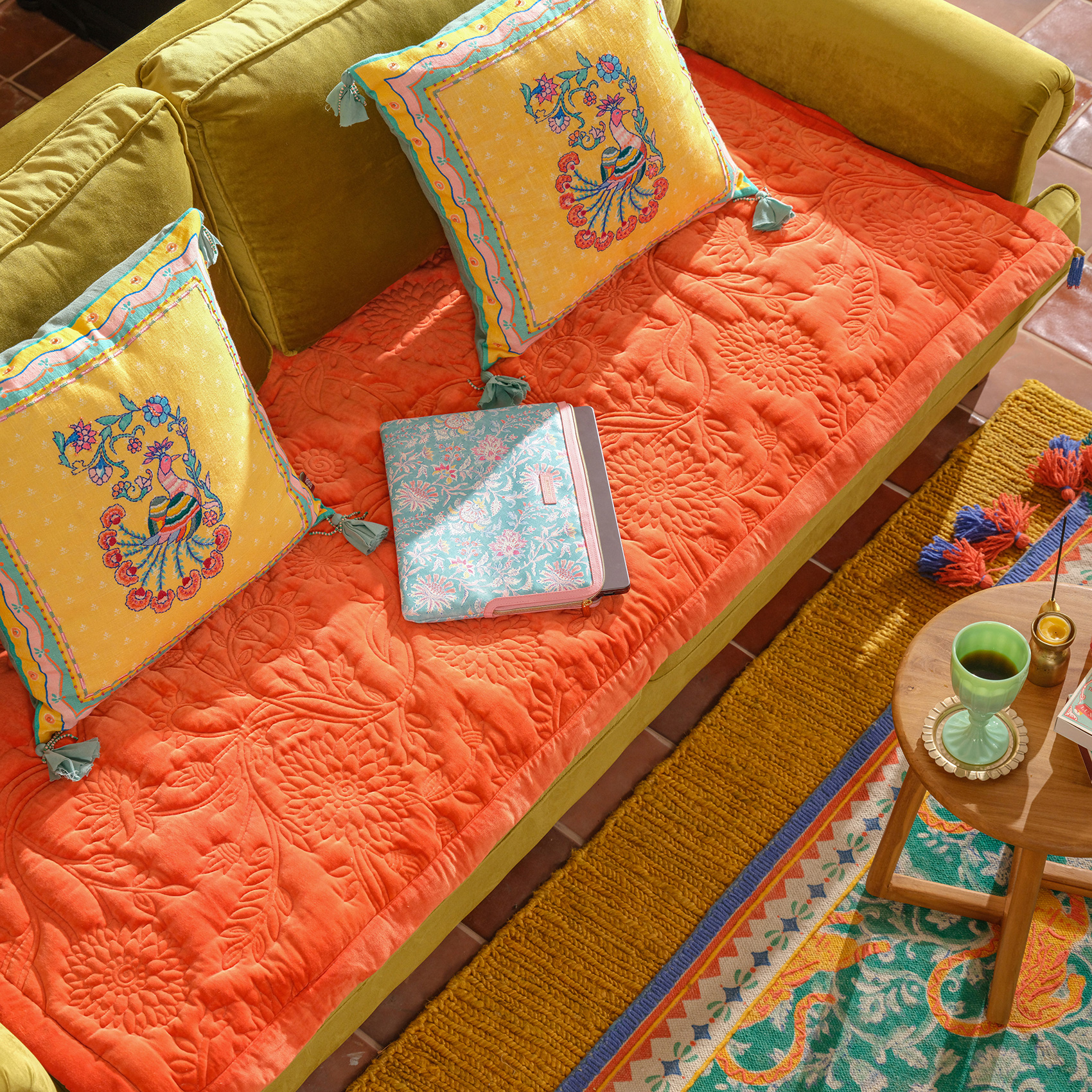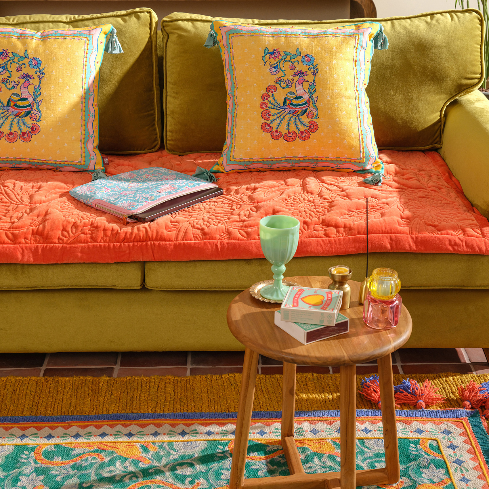 Zsa Zsa Zsu tasarımcılarının adeta bir hikâye anlatıcısı olarak hayal ettiği Okhla koltuk matı, Hindistan’ın usta zanaatkârları tarafından elde kapitone edildi. %100 pamuk kadife dokusuyla yumuşacık, canlı renk paletiyle göz alıcı. Püskül detayları, tasarıma neşeli bir dokunuş katıyor. Kanepede harika durur, pencere önü ya da sedir gibi köşelerde de anında fark yaratır. Okhla koltuk matı, kültürel zenginliklerden ilham alan Heritage koleksiyonunun en özgün parçalarından biri.