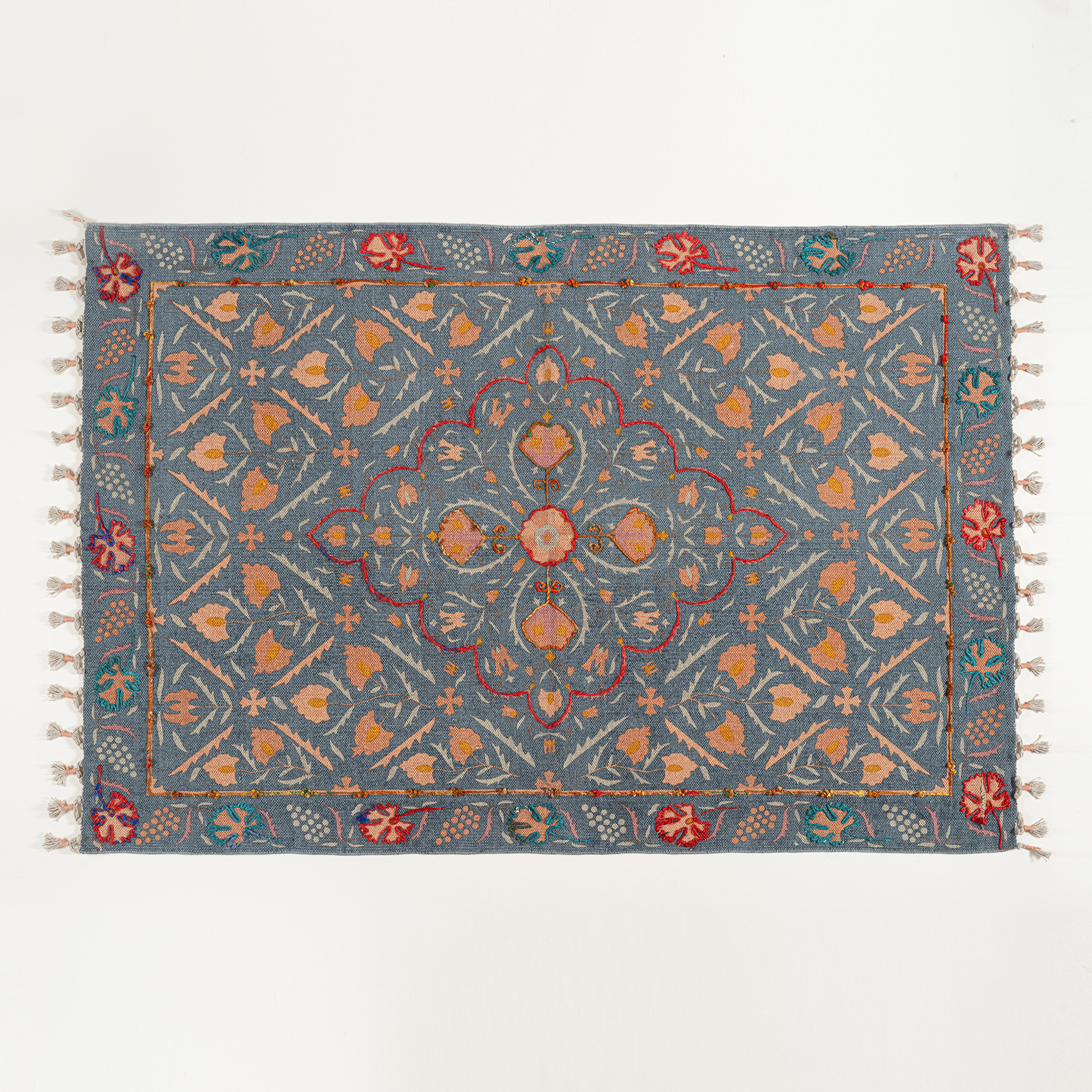 Maximalist koleksiyonunun güçlü renk ve özgün desen dilini yansıtan Palri, nesilden nesile aktarılabilecek kadar kaliteli ve dayanıklı bir ürün. Hindistan da yaşayan usta artizanların el tezgâhlarında doğal pamuk elyaf kullanarak dokuduğu ve geleneksel ahşap baskı tekniği ile desenlerine hayat verdiği Palri kilimin saçakları elde örülüyor.