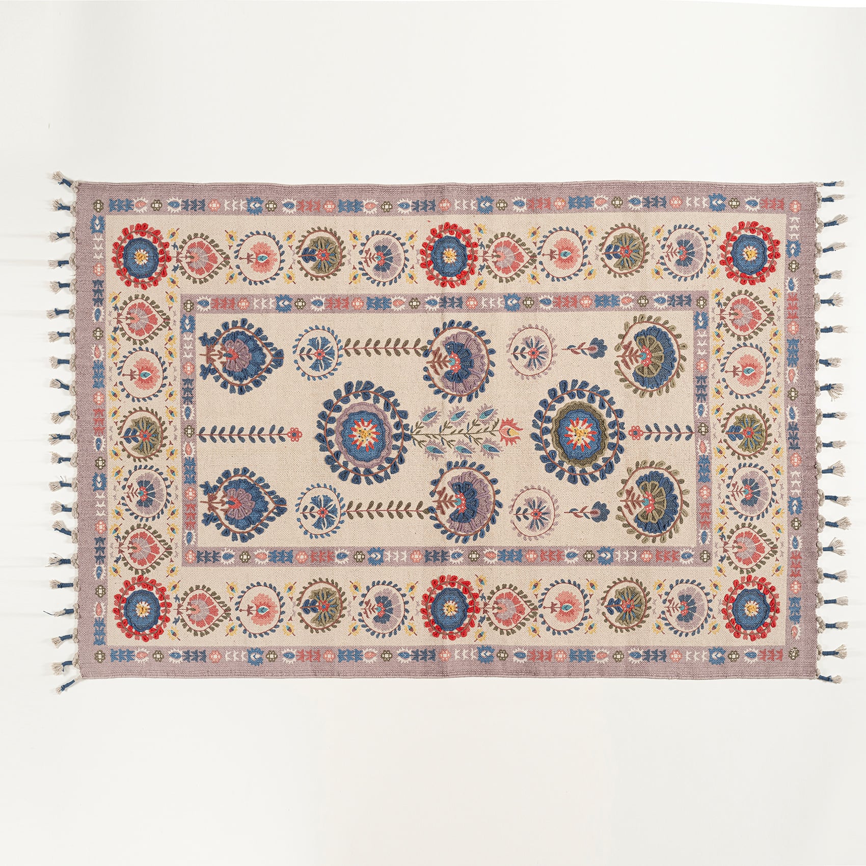 Maximalist koleksiyonunun güçlü renk ve özgün desen dilini yansıtan Palri, nesilden nesile aktarılabilecek kadar kaliteli ve dayanıklı bir ürün. Hindistan da yaşayan usta artizanların el tezgâhlarında doğal pamuk elyaf kullanarak dokuduğu ve geleneksel ahşap baskı tekniği ile desenlerine hayat verdiği Palri kilimin saçakları elde örülüyor.