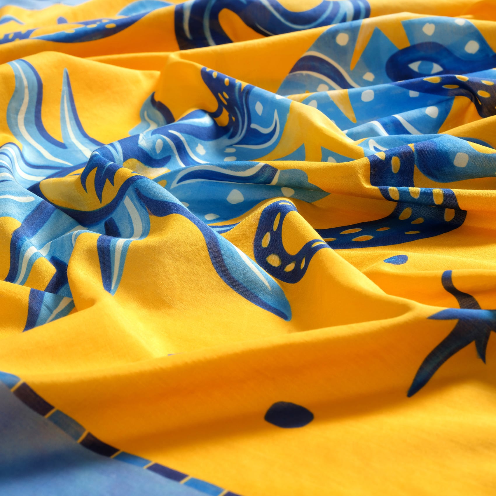 Rüzgarlı günler, altın saatler ve tempoya ayak uydurmayı bilen bir pareo. Dijital baskılı pamuk ipek karışımı Pera pareo, mavinin ferahlığını sarının sıcaklığıyla buluşturuyor; adeta giyilebilir bir Akdeniz gün batımı. Canlı desenleri, hayatı tüm renkleriyle gören özgür ruhlar için tasarlandı. Plajda belinize bağlayın, şehirde bir gömlekle kombinleyin, birkaç kuralı gönül rahatlığıyla çiğneyin. %70 pamuk ve %30 ipek dokusuyla hafif, akışkan ve güneş ışığı kadar ışıltılı. Rüzgarla hareket eden, ışıkla parlayan bu pareo ile yazın ritmine adım atın. Türkiye’de tasarlandı ve üretildi.
