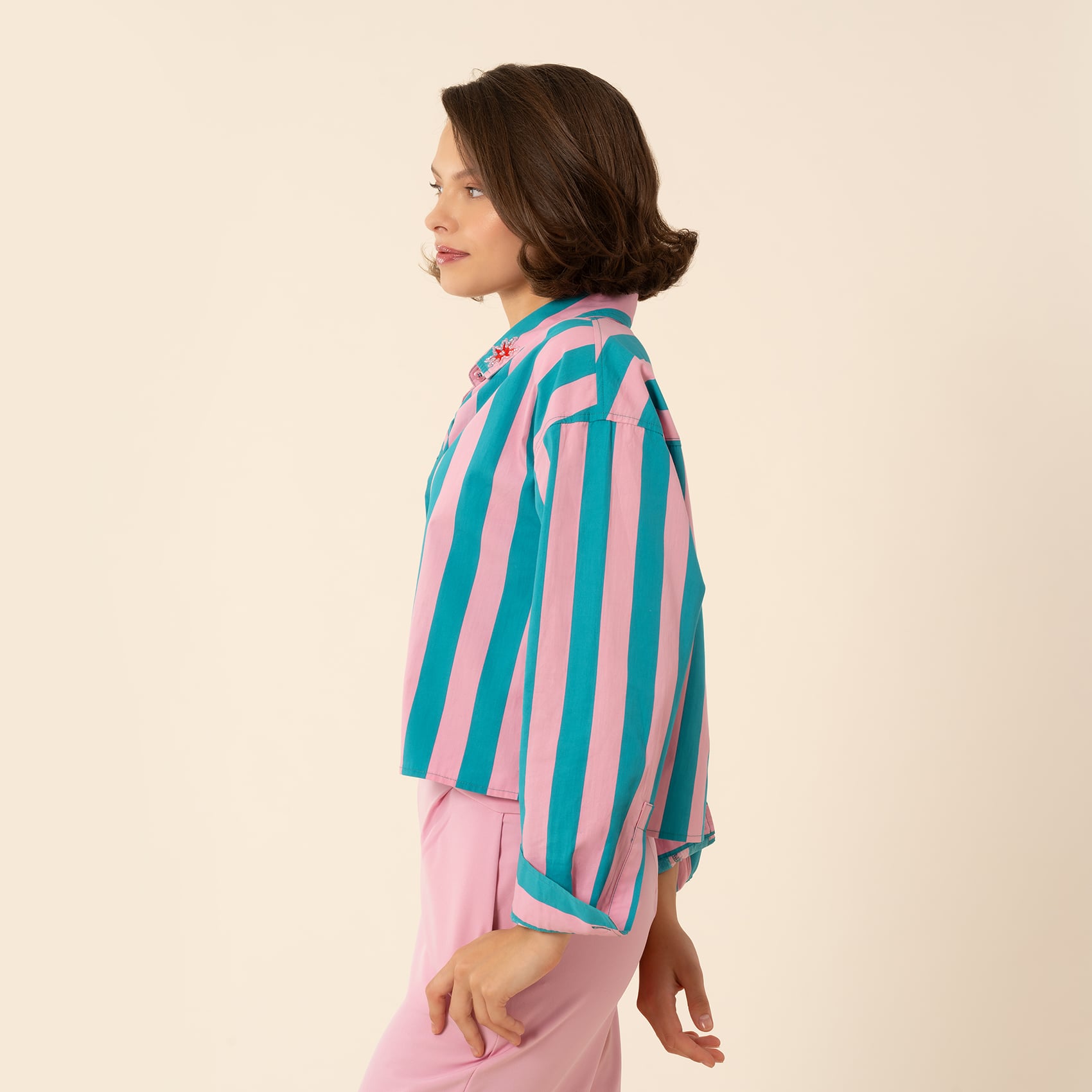 Maximalist dünyasının cesur duygusunu Proti Çizgili Poplin Kısa Gömlek ile üzerinizde hissedin. %100 pamuk poplinden üretilen bu parça, şeker pembesi ve koyu yeşil çizgilerle renklerin çarpıcı uyumunu kutluyor. Kısa kesimi ve keskin yakası modern bir havayı öne çıkarırken, yaka uçlarındaki minik yıldız işlemeleri beklenmedik bir dokunuş katıyor. Bu gömlek, günlük giyiminizi canlı bir ifadeye dönüştürerek şehir sokaklarından neşeli gecelere kadar size eşlik ediyor.