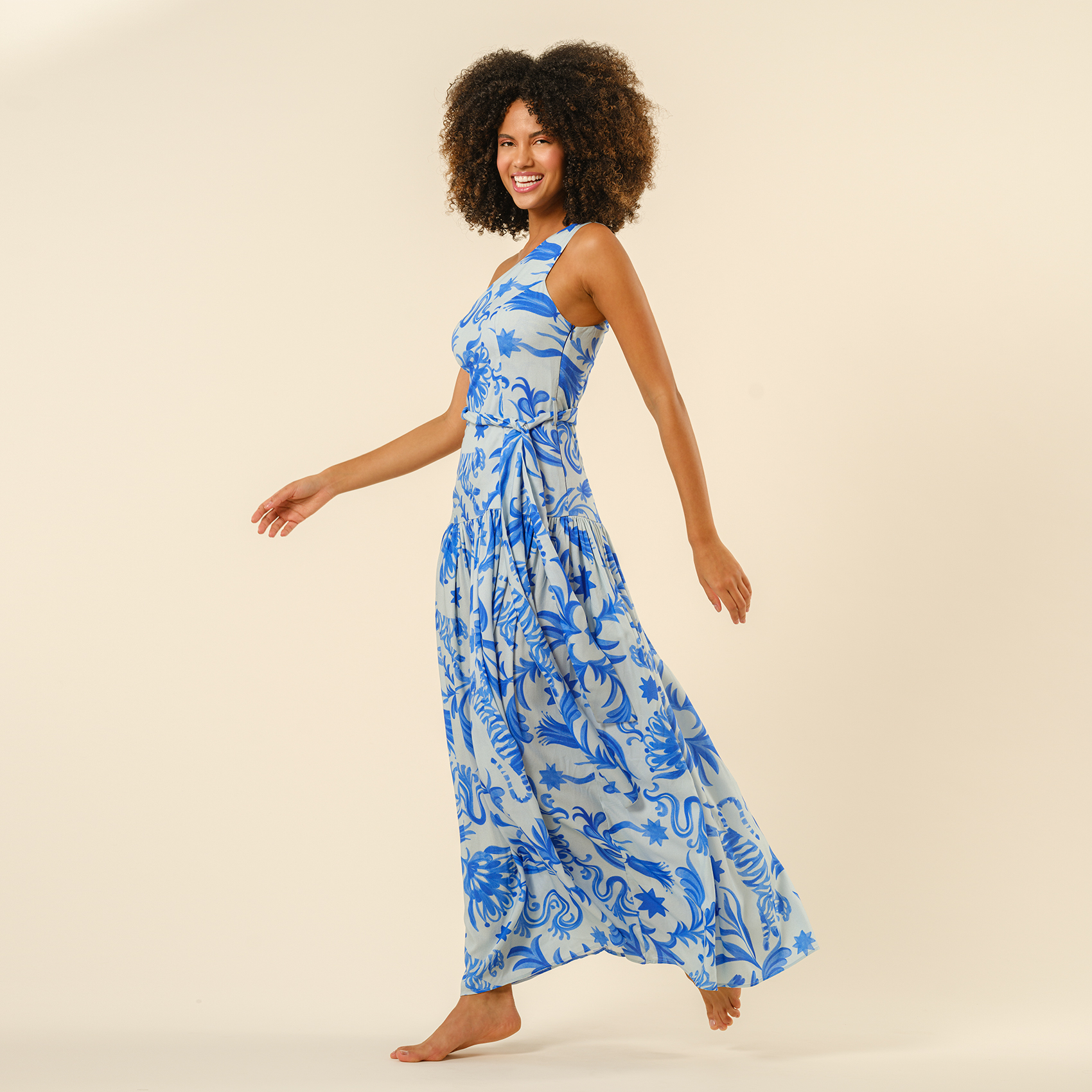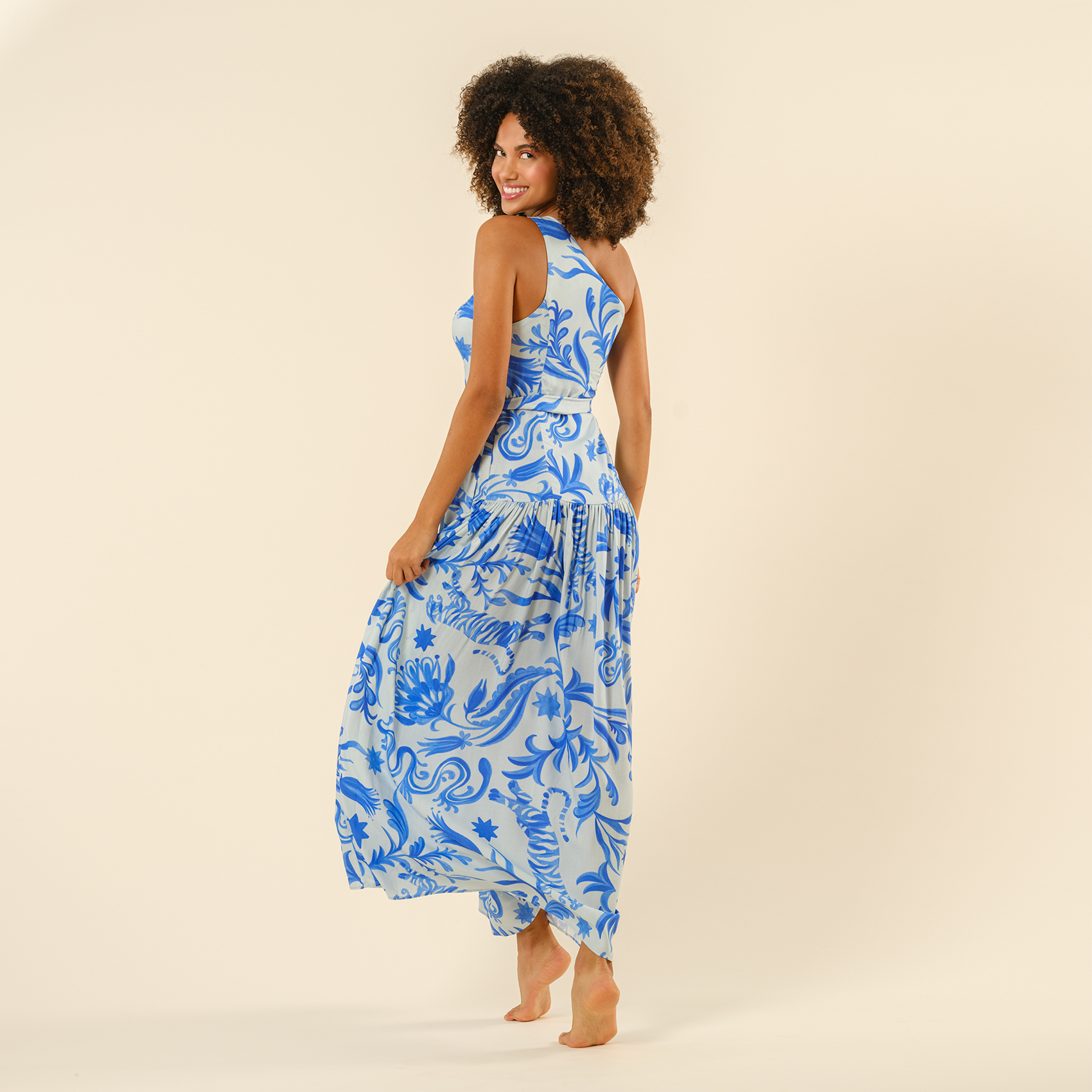 Protı Dijital Baskılı Asimetrik Elbise - Mavi