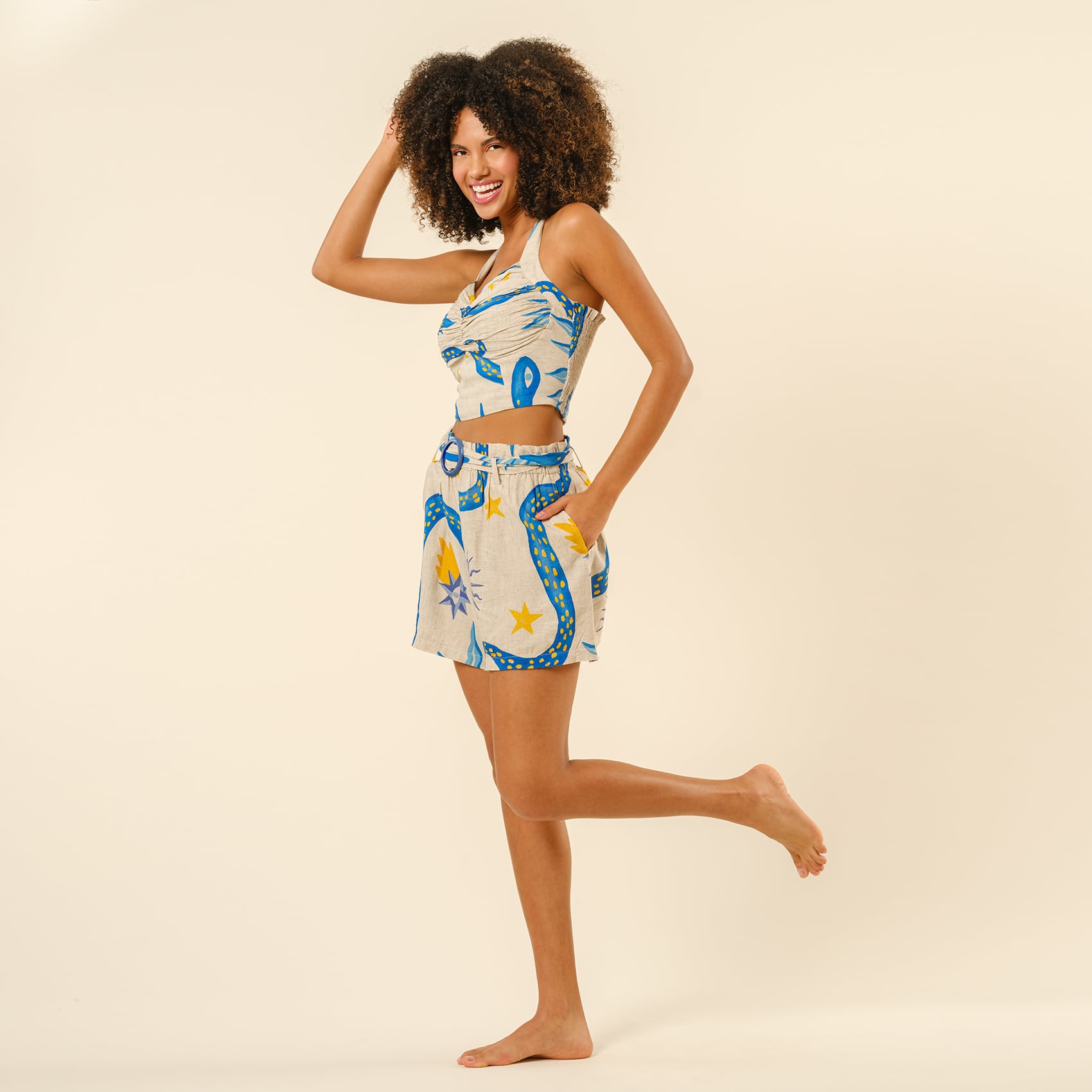 Proti dijital baskılı bluz, Blue koleksiyonunun sofistike dünyasından ilhamla tasarlanmış özgün bir parça. %80 viskon ve %20 ketenin hafifliğiyle stilinize özgürlük katarken, dijital baskılı desenleri Akdeniz’in mitolojik anlatılarını modern bir dokunuşla buluşturuyor. Vücudu kavrayan kesimi ve zarif detaylarıyla, hareketi ve zarafeti sevenler için özenle hazırlandı. Türkiye’de tasarlandı ve üretildi.