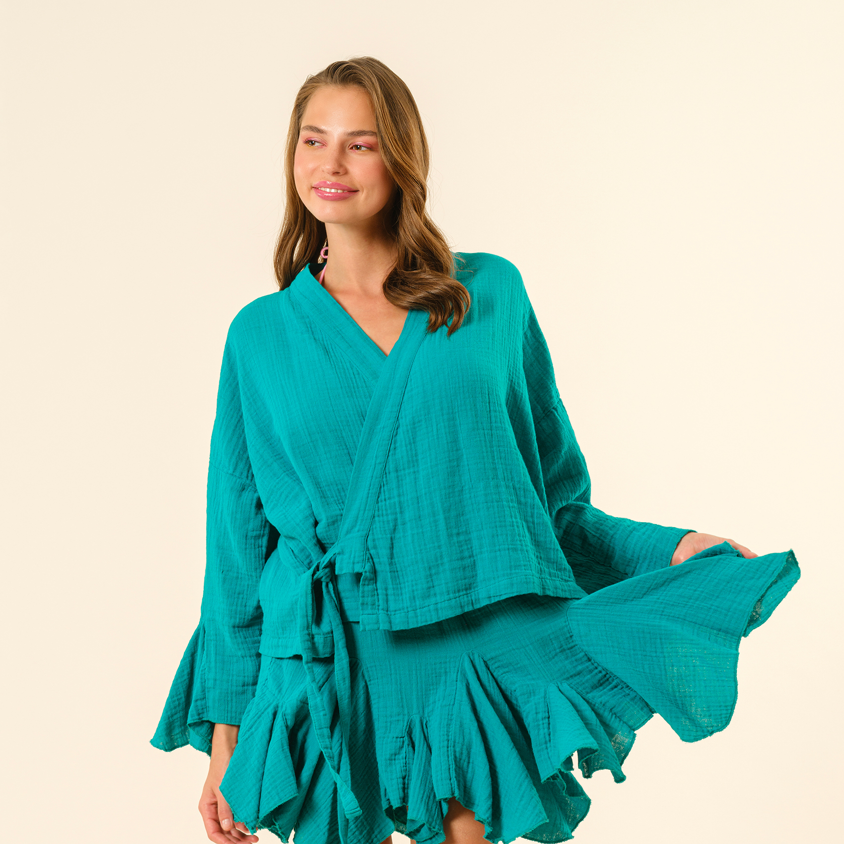 Proti müslin bluz ile stilinize özgürlüğün rüzgârı dokunsun! Akışkan kolları ve zarif bağlama detayıyla hareket ettikçe dans eden bu tasarım, sıradanlığı unutup cesareti kucaklayanlar için. %100 pamuk dokusu hafifliği hissettirirken, Maksimalist koleksiyonunun enerjisiyle buluşarak stilinize dinamizm katıyor. Gün doğumundan geceye, her anı bir şölene çevirenler için tasarlandı. Türkiye’de üretildi.