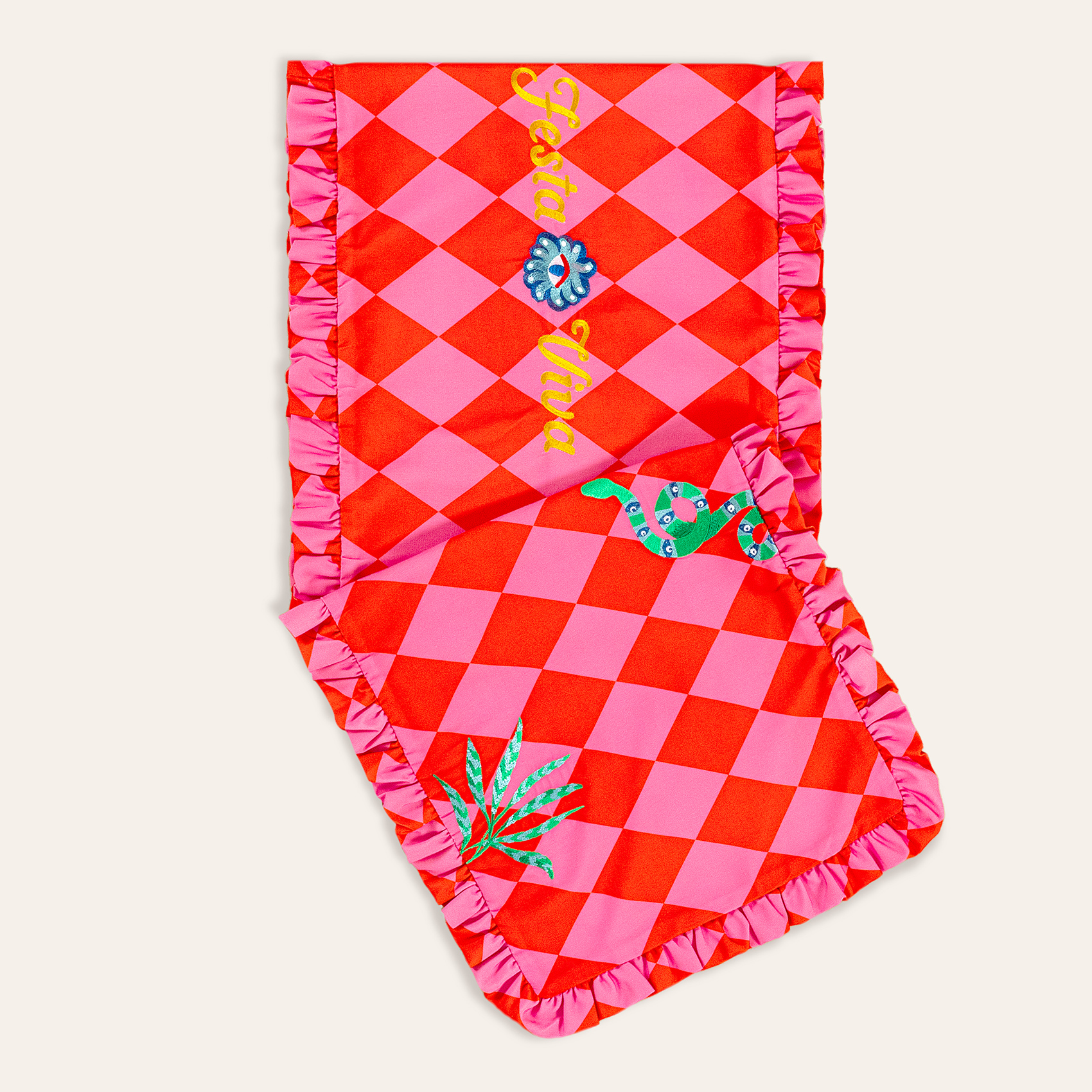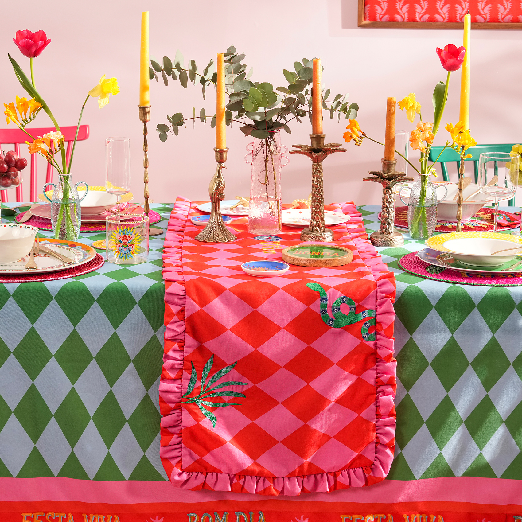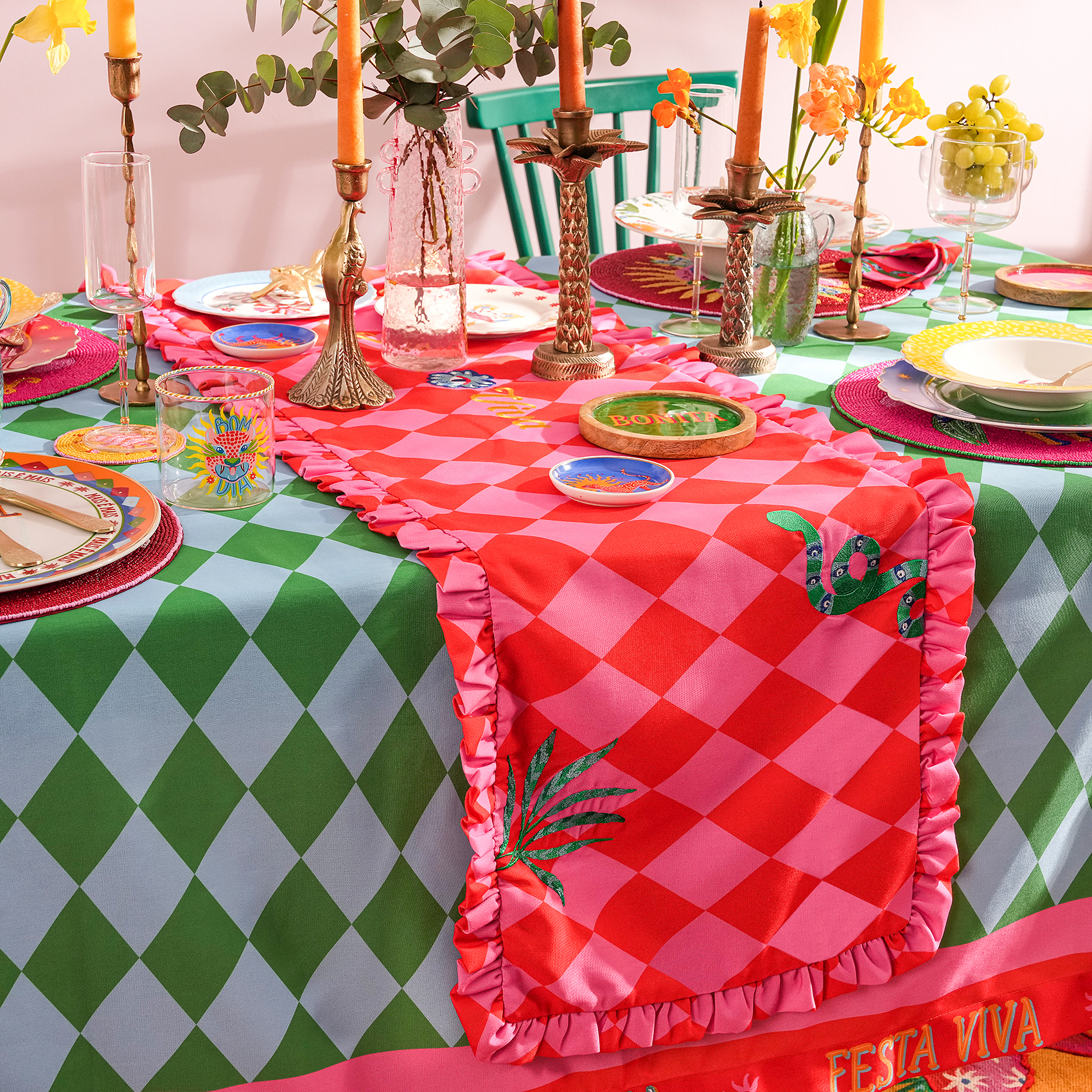 Hareketli kenar detayı ve akışkan kompozisyonu ile Prusa runner, masaya anında canlılık ve kutlama hissi taşıyan güçlü bir zemin kuruyor. Üzerine yerleşen eğlenceli figürler ve ritmik düzen, masa boyunca yayılan neşeli bir enerji yaratarak buluşmaları daha sosyal, daha cömert ve daha keyifli hissettiriyor. Maximalist koleksiyonunun coşkulu, renkli ve hayal gücünü ateşleyen ruhunu yansıtan bu tasarım, sıradan bir sofrayı bile davetkâr ve unutulmaz bir ana dönüştüren etkileyici bir dokunuş sunuyor. Türkiye’de tasarlandı ve üretildi.