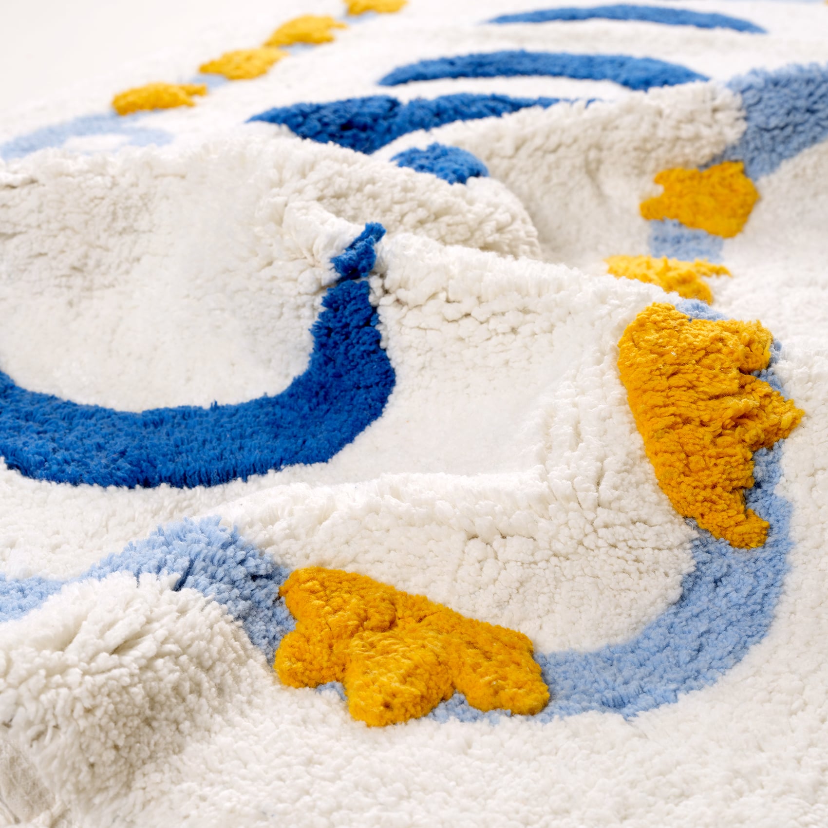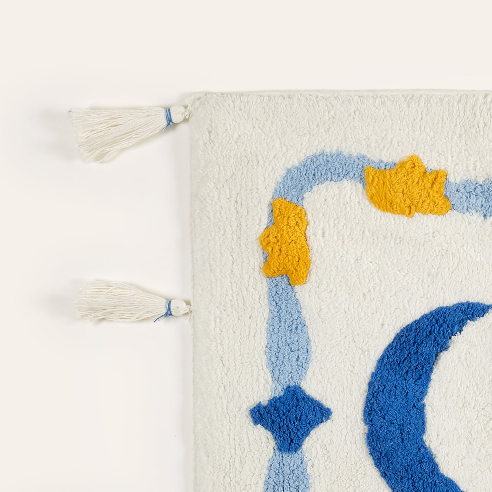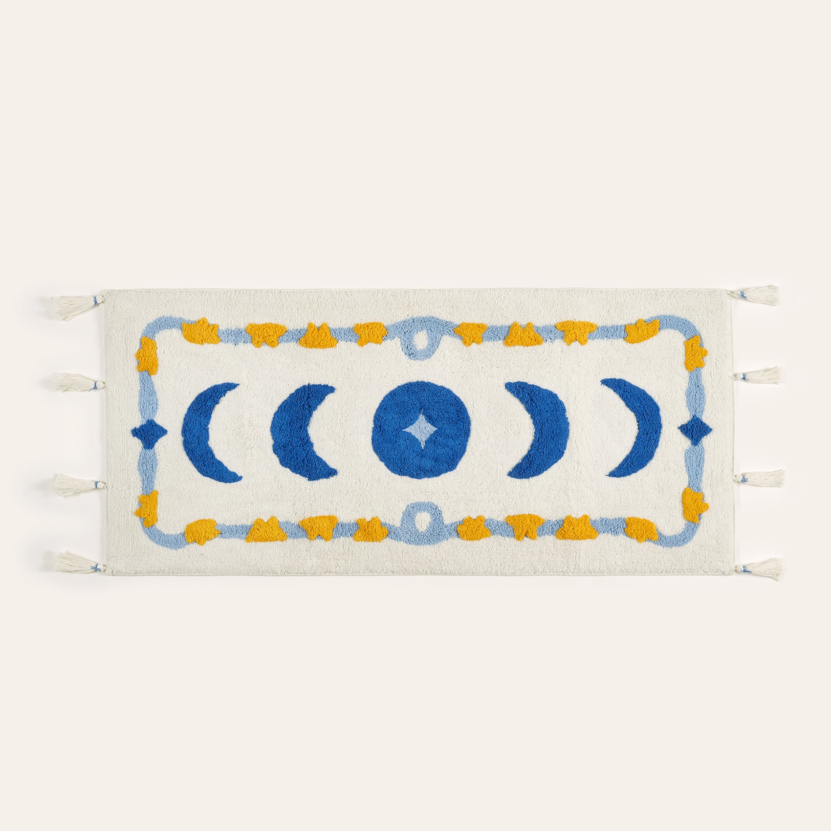 Blue koleksiyonunun şık ve sofistike stilini banyolarınıza taşıyan Punjab banyo paspası, gökyüzünü yaşam alanınıza getiriyor. 55x120 cm boyutundaki bu %100 pamuk paspas, sakin mavi tonları ve gold detaylarıyla adeta bir gökyüzü hikayesi anlatıyor. Ay döngüsünden ilham alan desenleriyle mitolojik bir atmosfer yaratan tasarım, zarif püskül detaylarıyla da tamamlanıyor. Hem yumuşacık dokusuyla her adımınızı şımartıyor hem de banyonuzu mistik bir sığınak haline getiriyor. 40°C’de makinede yıkayabilirsiniz.