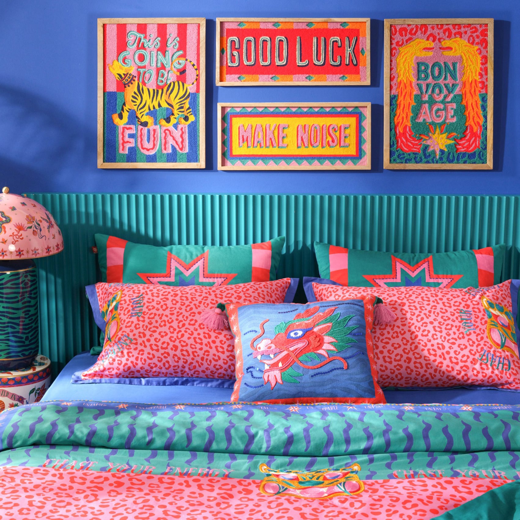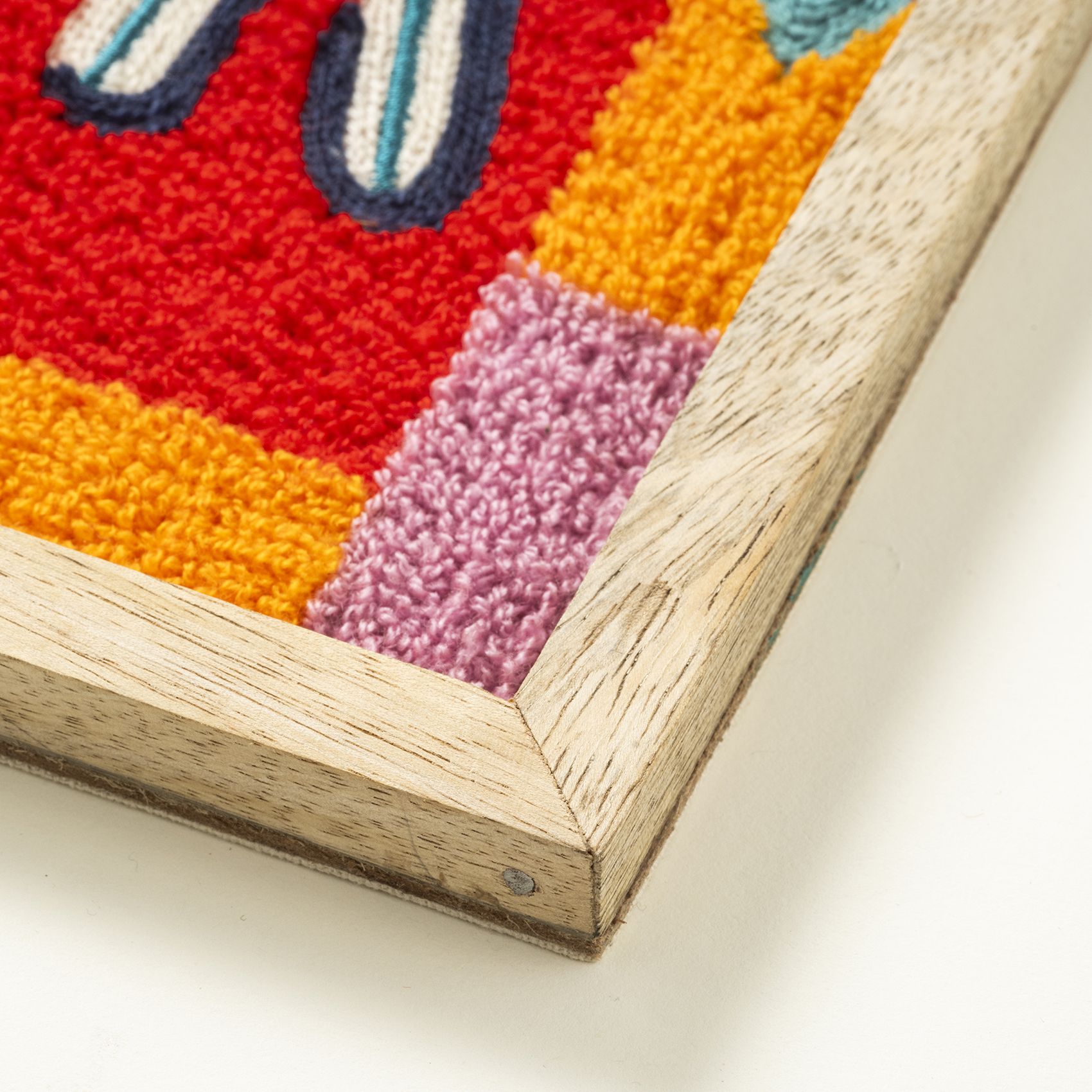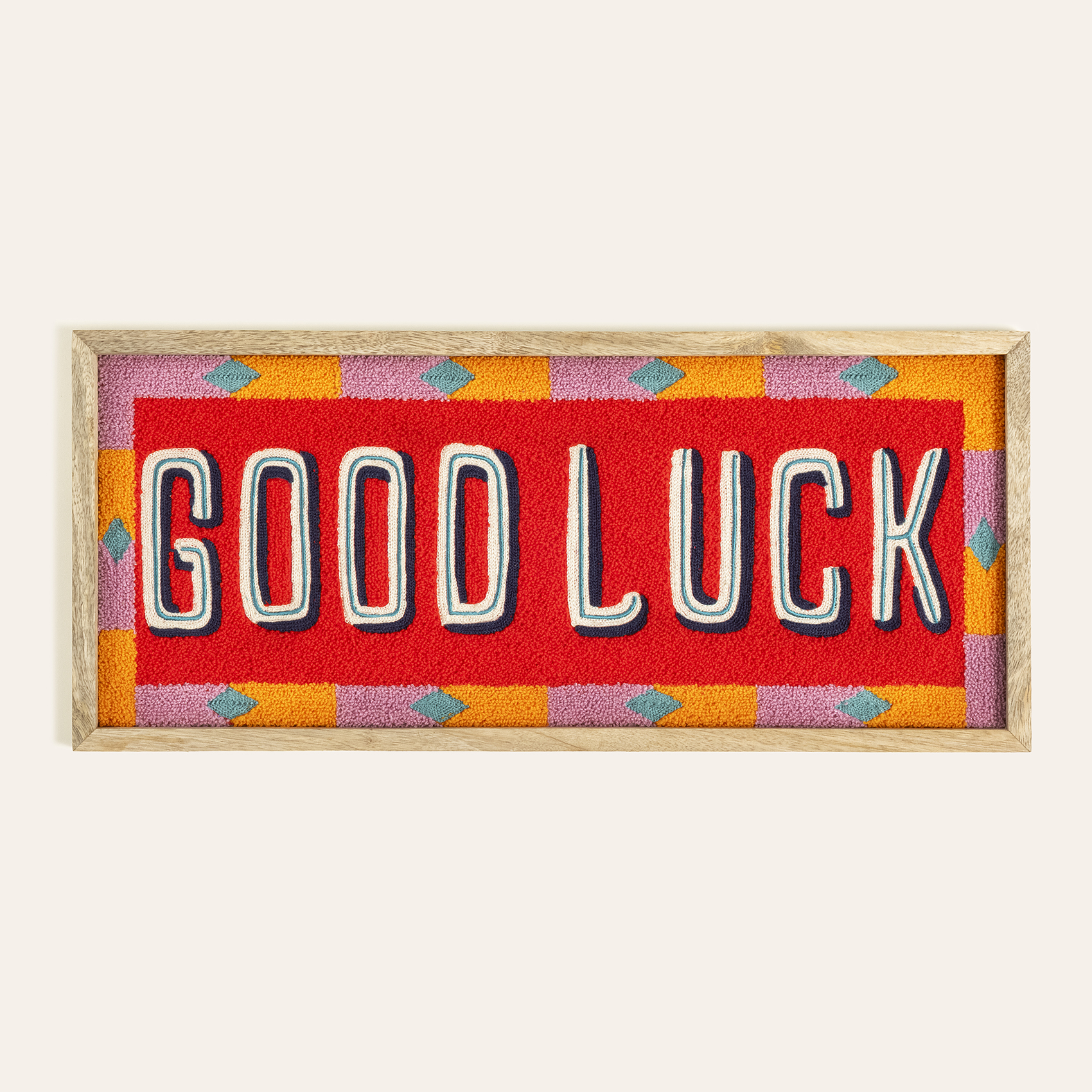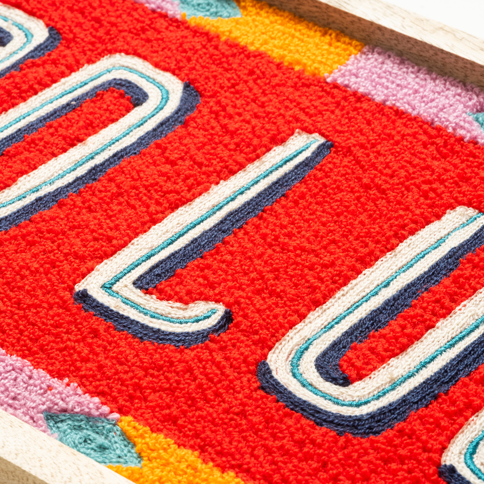 Rajpath nakışlı dekoratif duvar panosu ile duvarlarınızda şansı manifest edin. “Good Luck” mesajı kırmızı zeminde öne çıkarken, pembe, turuncu ve yeşil detaylar enerjiyi yükseltiyor. İyi şans, bu tasarımda Maximalist bir kutlamaya dönüşüyor. Mango ağacından çerçevesi, %100 pamuk kumaşı ve titiz nakış işçiliğiyle hazırlanan pano 20 x 50 cm ölçüsünde. Dekoratif bir ayrıntının ötesinde, yaşam alanınıza renkli bir Maximalist tılsımı taşır.
