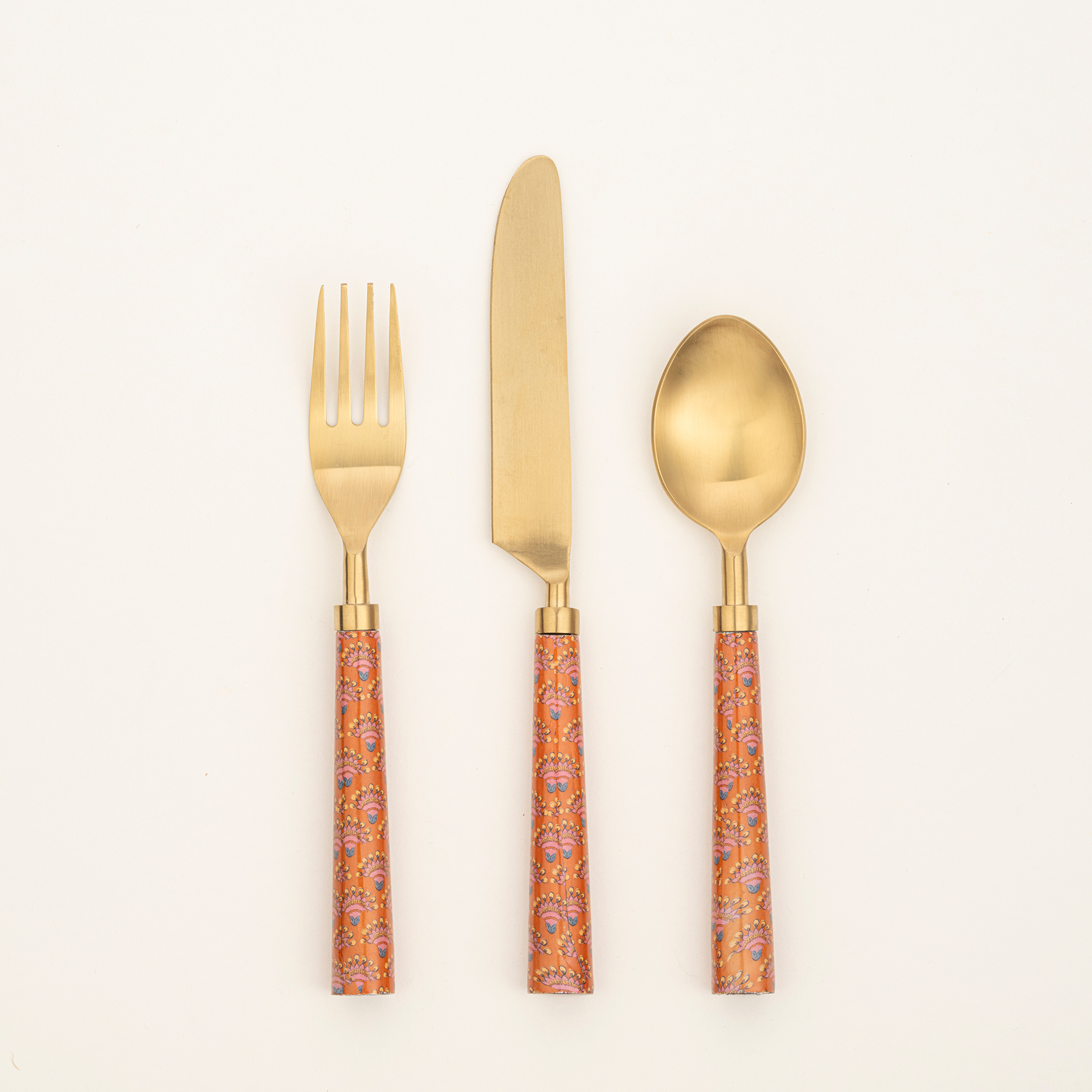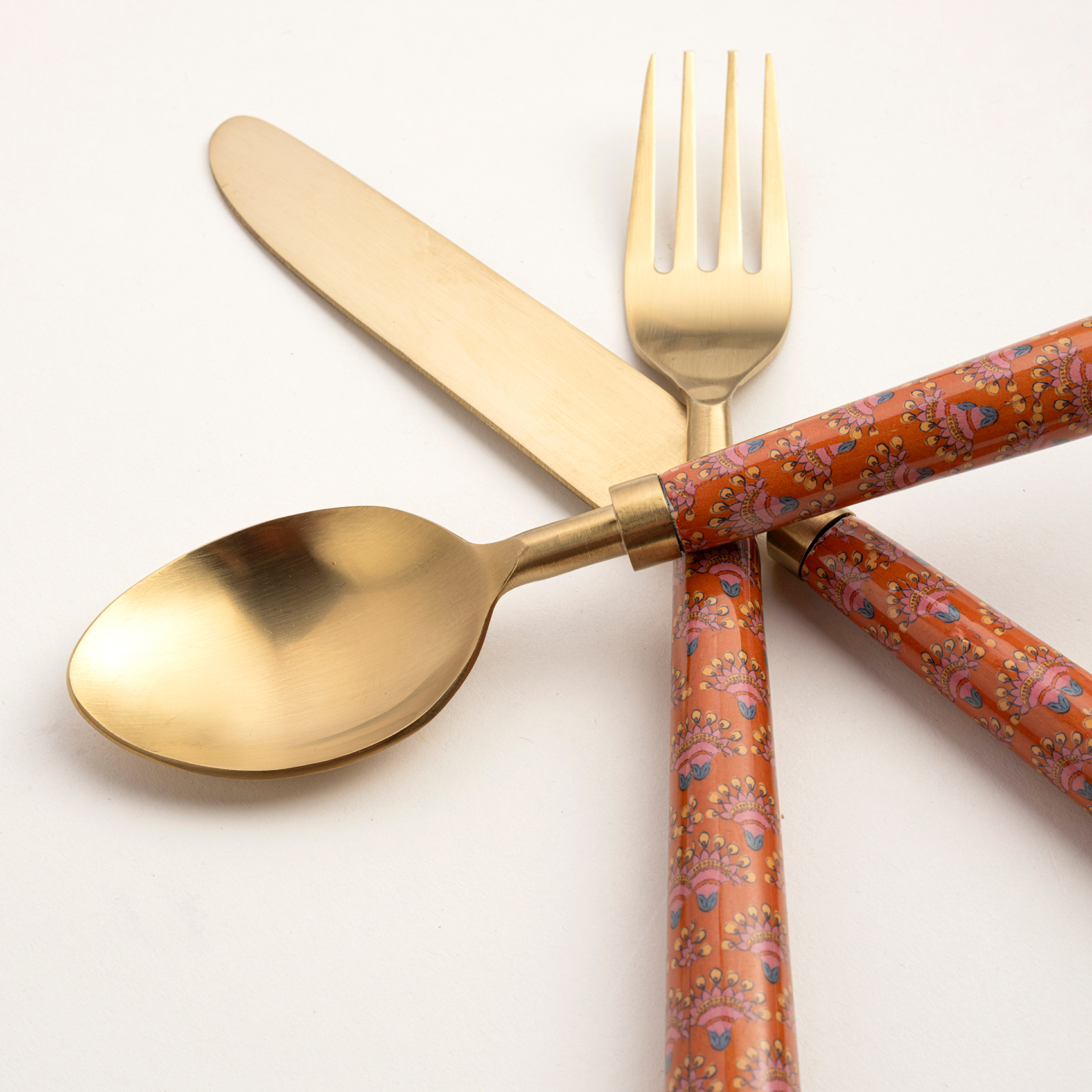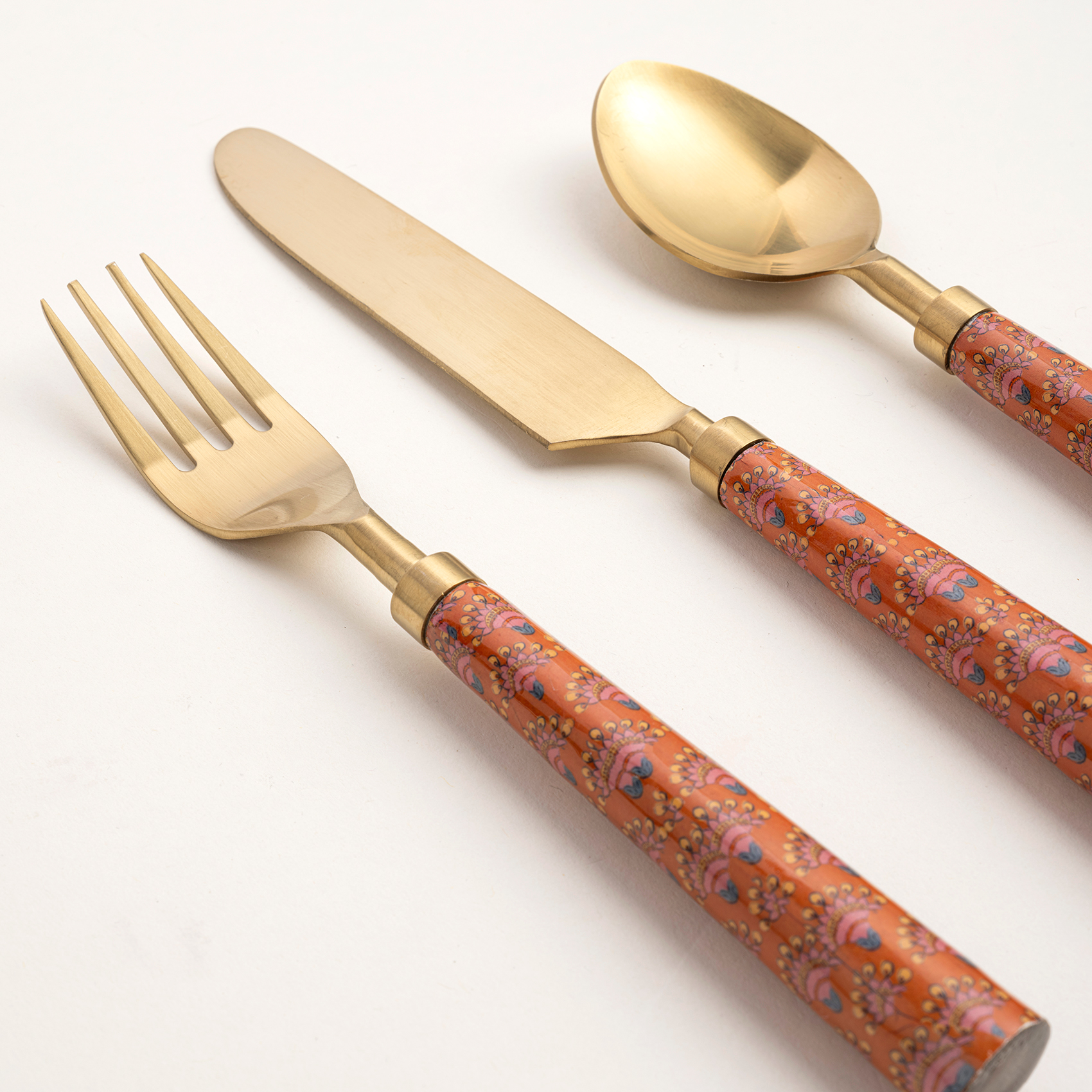 Bu çatal bıçak kaşık seti, Hindistanlı artizanlar tarafından kaliteli paslanmaz çelik üzerine altın PVD kaplanarak üretiliyor. Rampur’un Heritage temasının etnik desenlerini yansıtan sapları, davet masalarına eklektik bir dokunuş katıyor. Bulaşık makinesinde yıkamayınız.