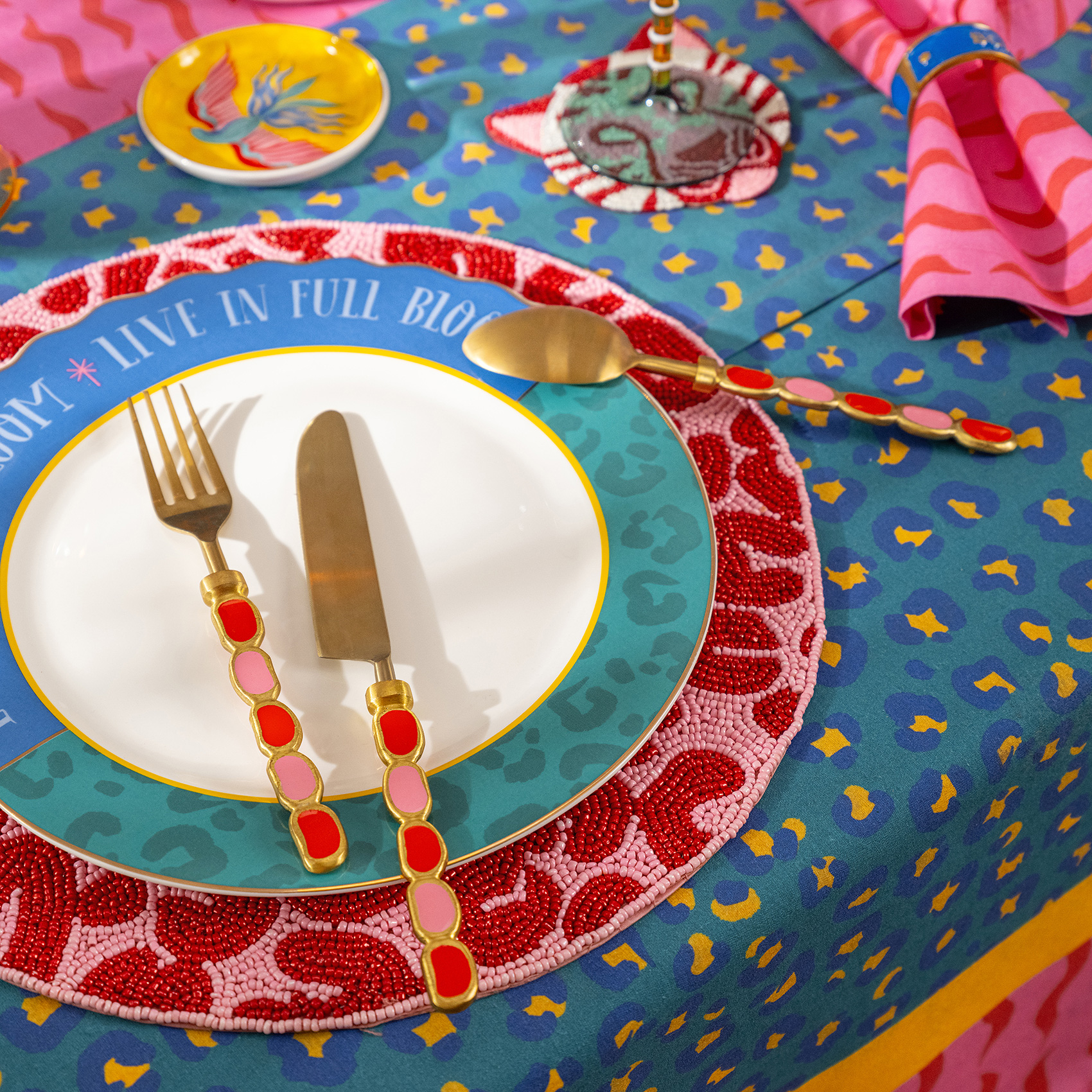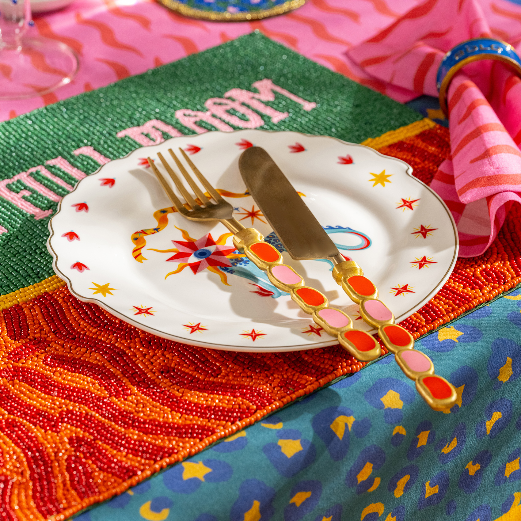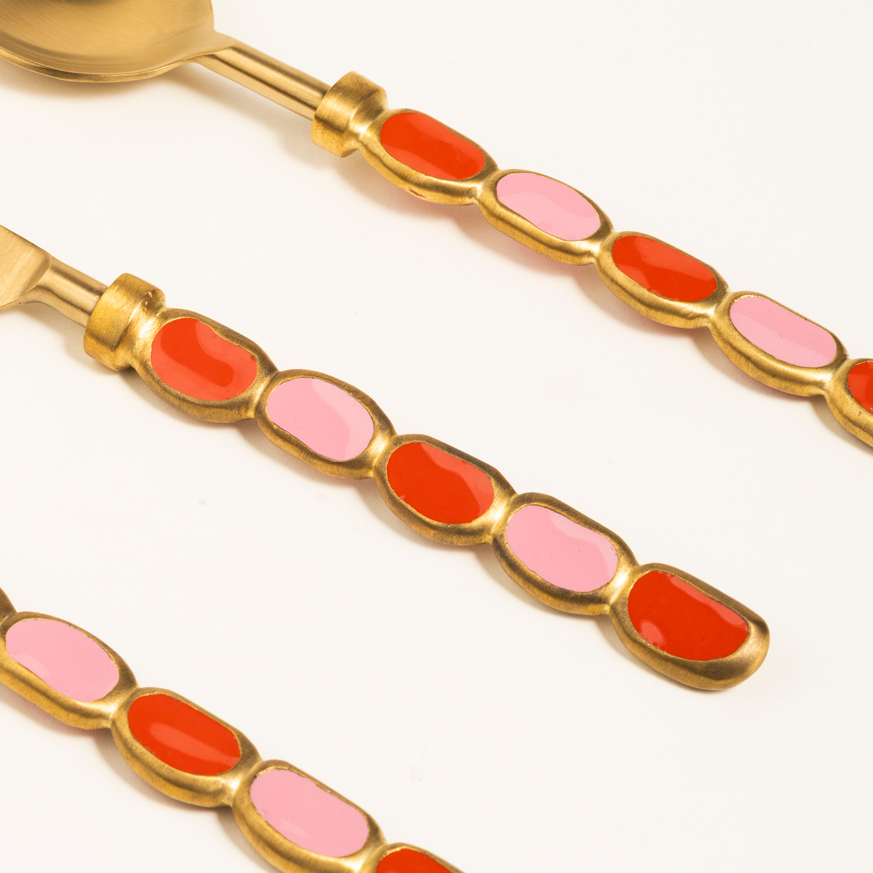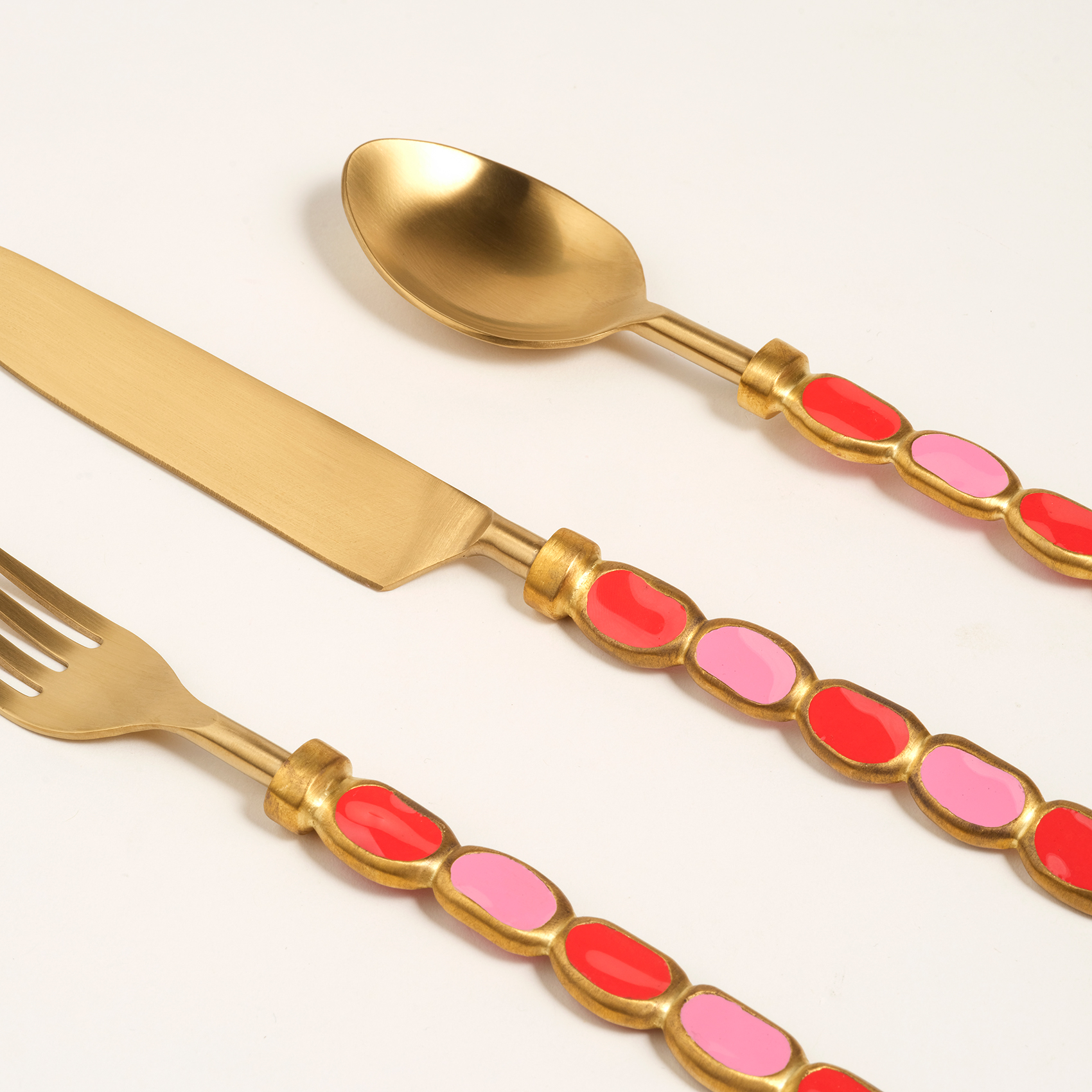 Rampur 3’lü çatal-kaşık-bıçak setiyle sofralarınıza Maximalist koleksiyonun oyuncu ruhu geliyor. Pembe ve kırmızının neşeli uyumu, pirinç sapların ışıltısıyla buluşuyor; sıradan bir öğün bile küçük bir şölene dönüşüyor. Hindistan’da özenle üretilen çelik gövdesiyle hem dayanıklı hem stil sahibi. Elde yıkamanızı öneriyoruz.