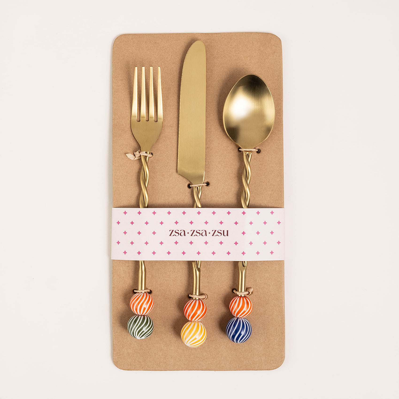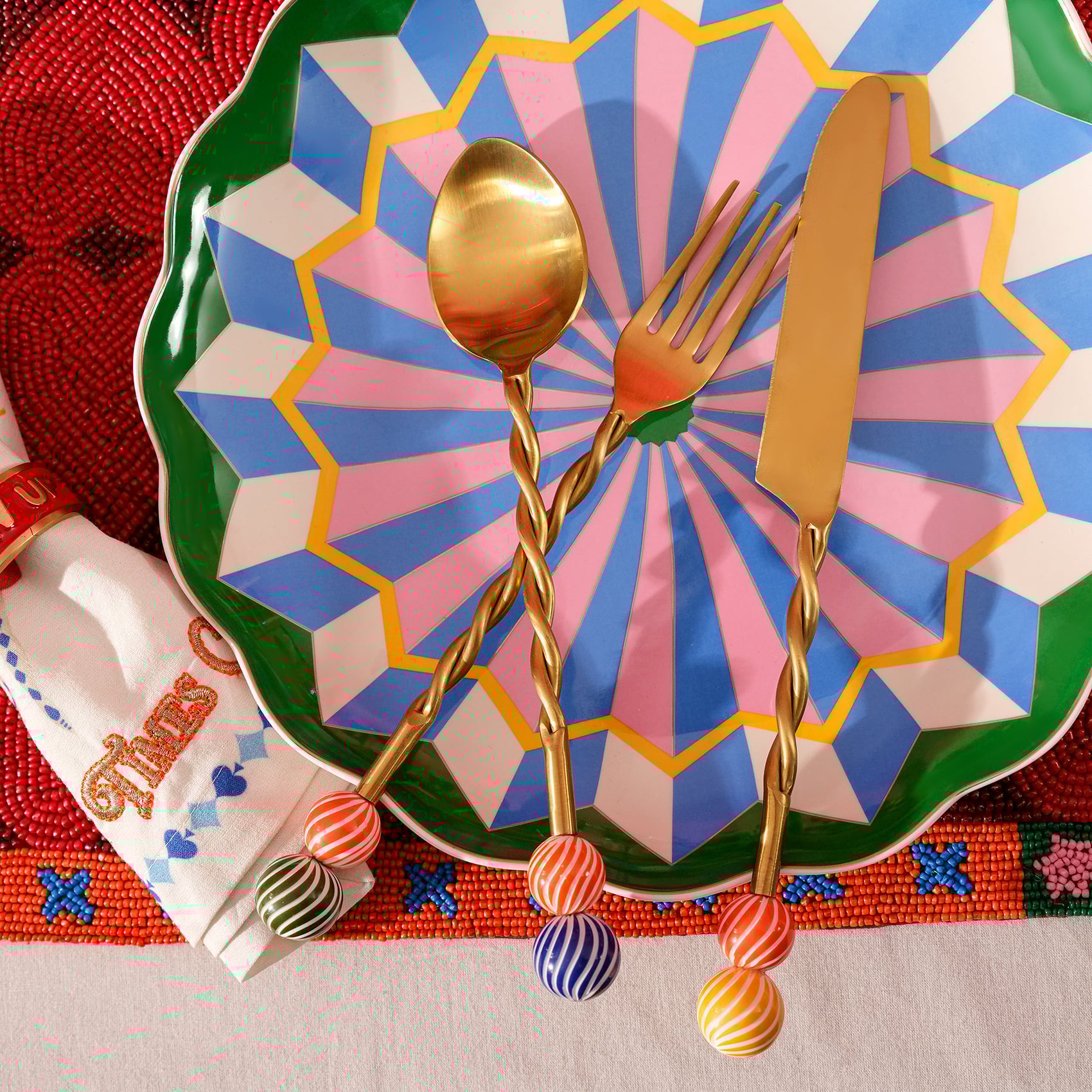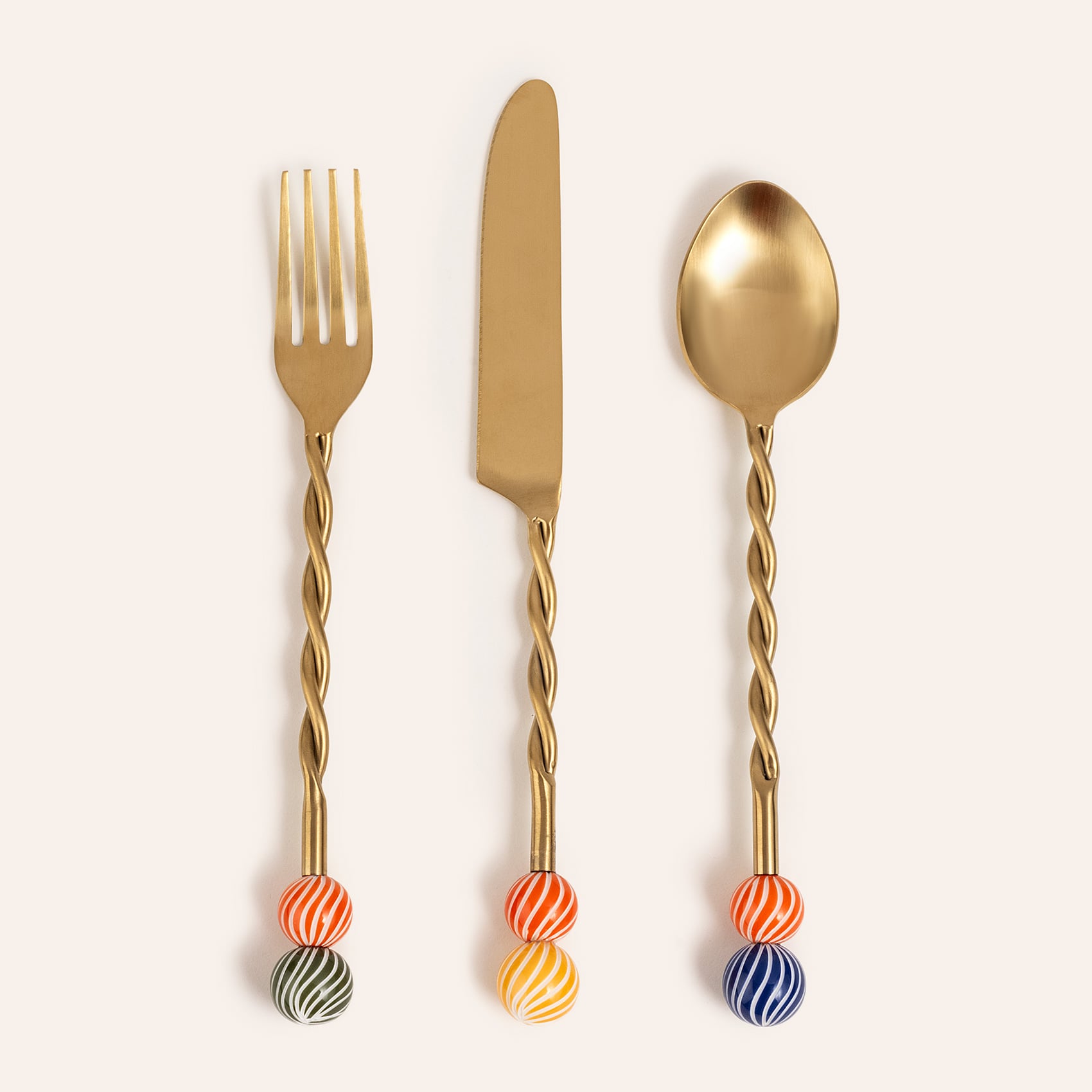 Çatalında biraz eğlence arayanlar için, sofrada neşeyle stil buluşuyor. Kıvrımlı sapları ve rengârenk reçine detaylarıyla Rampur 3’lü çelik çatal kaşık bıçak seti, her sunuma oyunbaz bir ışıltı katıyor. Her parça, sıradan bir öğünü renkli bir kutlamaya dönüştürüyor. Cheerland koleksiyonunun enerjik favorilerinden biri olan bu set, Hindistan’da sevgiyle el işçiliğiyle üretildi. Işıltısını koruması için elde yıkamanızı öneriyoruz.