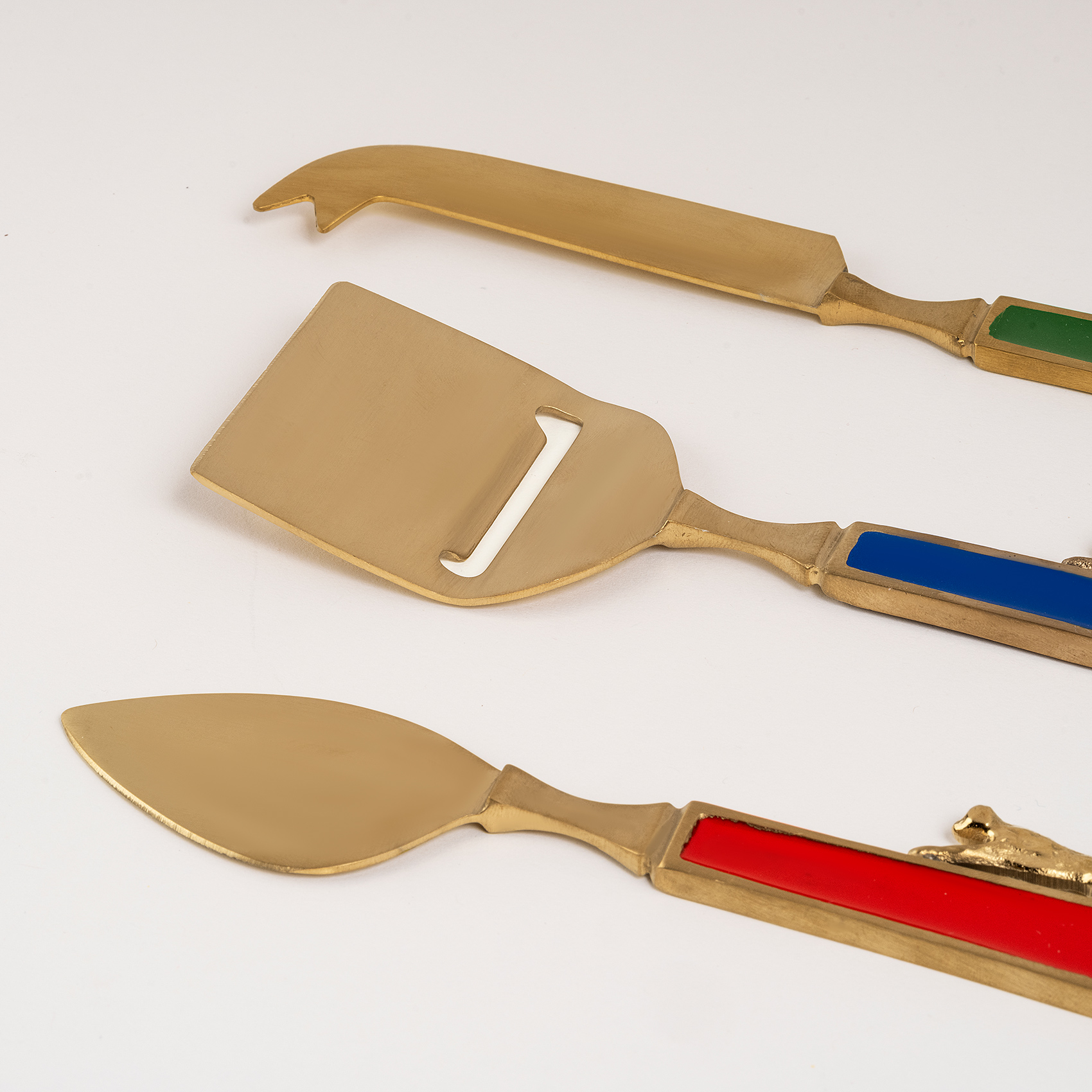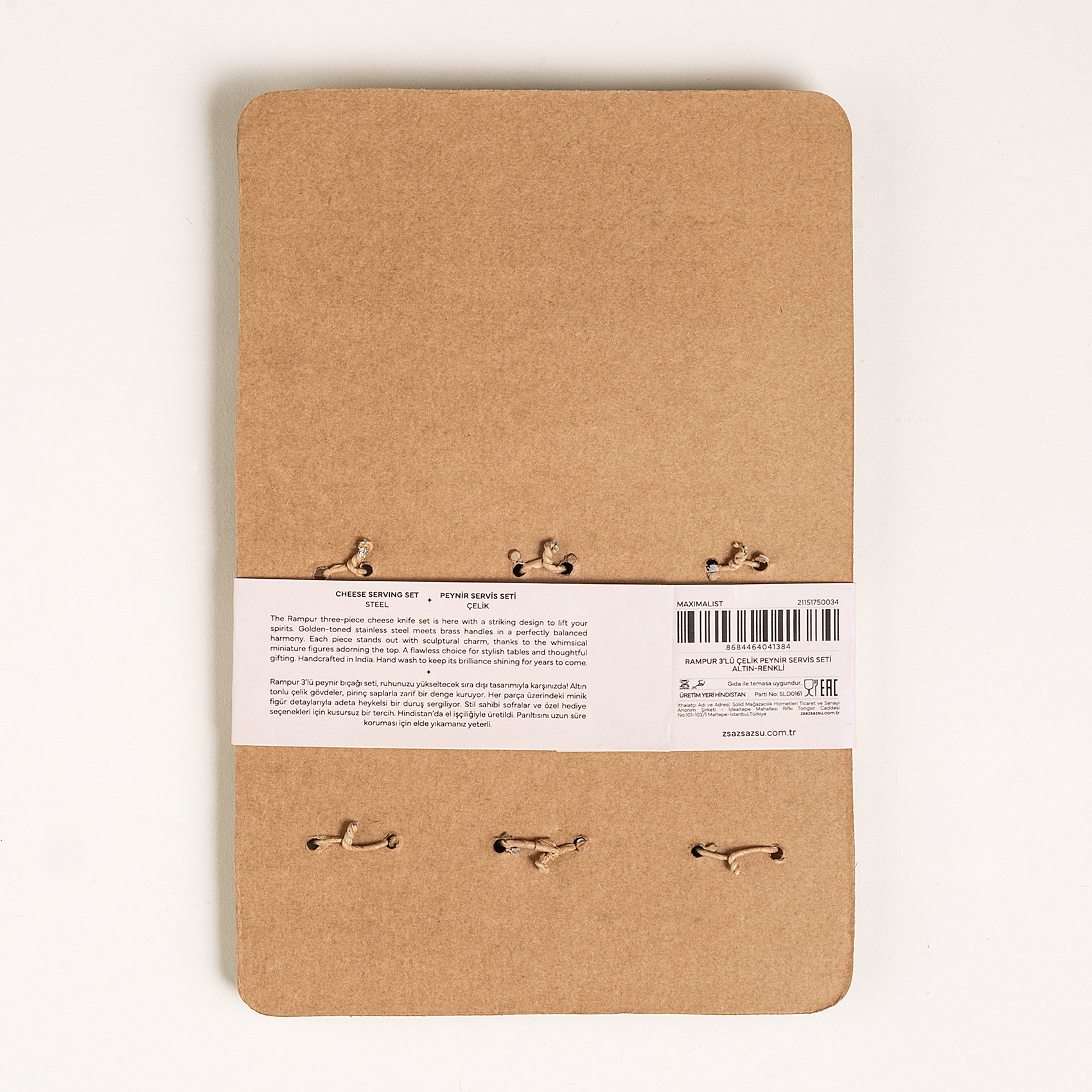 Rampur 3’lü peynir bıçağı seti, ruhunuzu yükseltecek sıra dışı tasarımıyla karşınızda! Altın tonlu çelik gövdeler, pirinç saplarla zarif bir denge kuruyor. Her parça üzerindeki minik figür detaylarıyla adeta heykelsi bir duruş sergiliyor. Stil sahibi sofralar ve özel hediye seçenekleri için kusursuz bir tercih. Hindistan’da el işçiliğiyle üretildi. Parıltısını uzun süre koruması için elde yıkamanız yeterli.