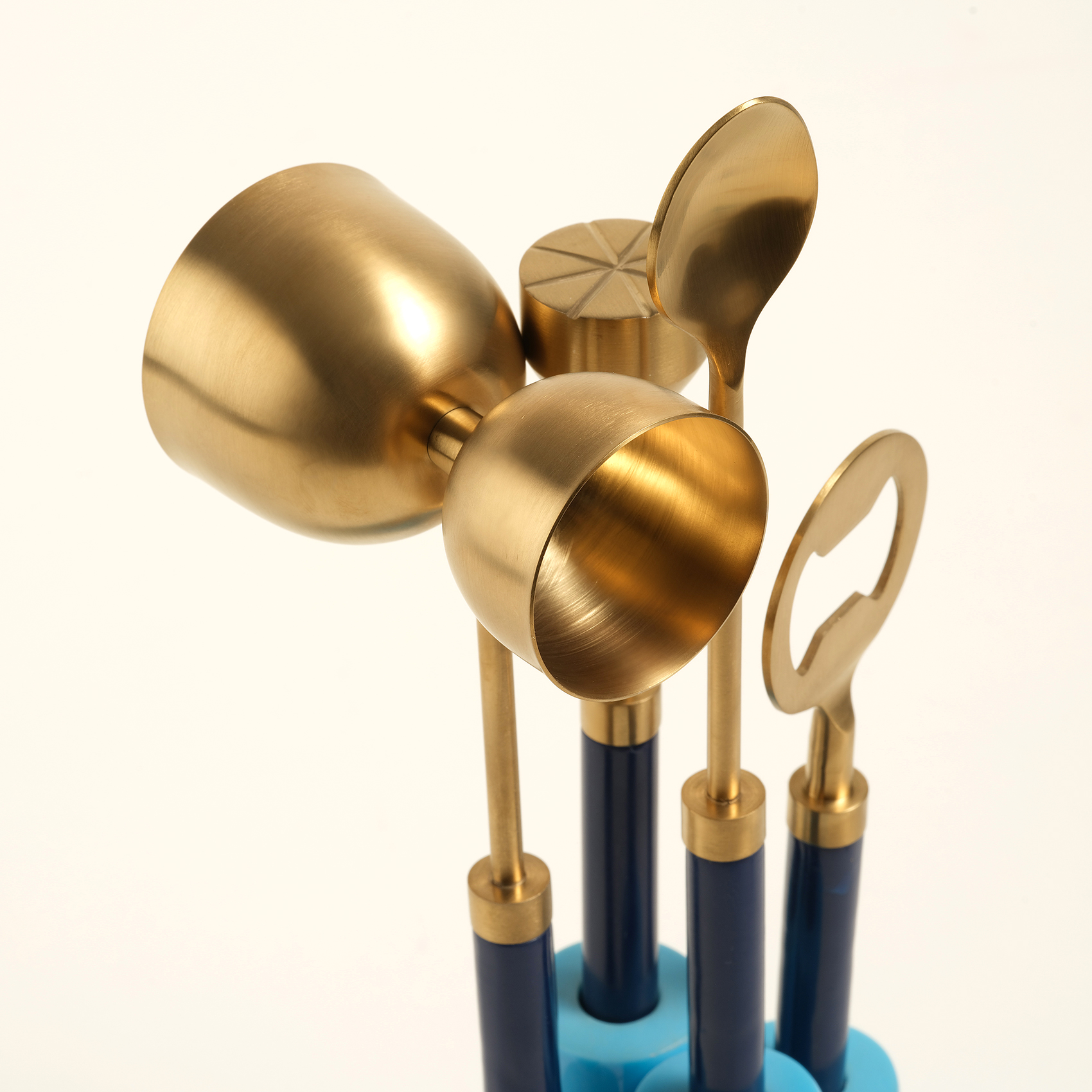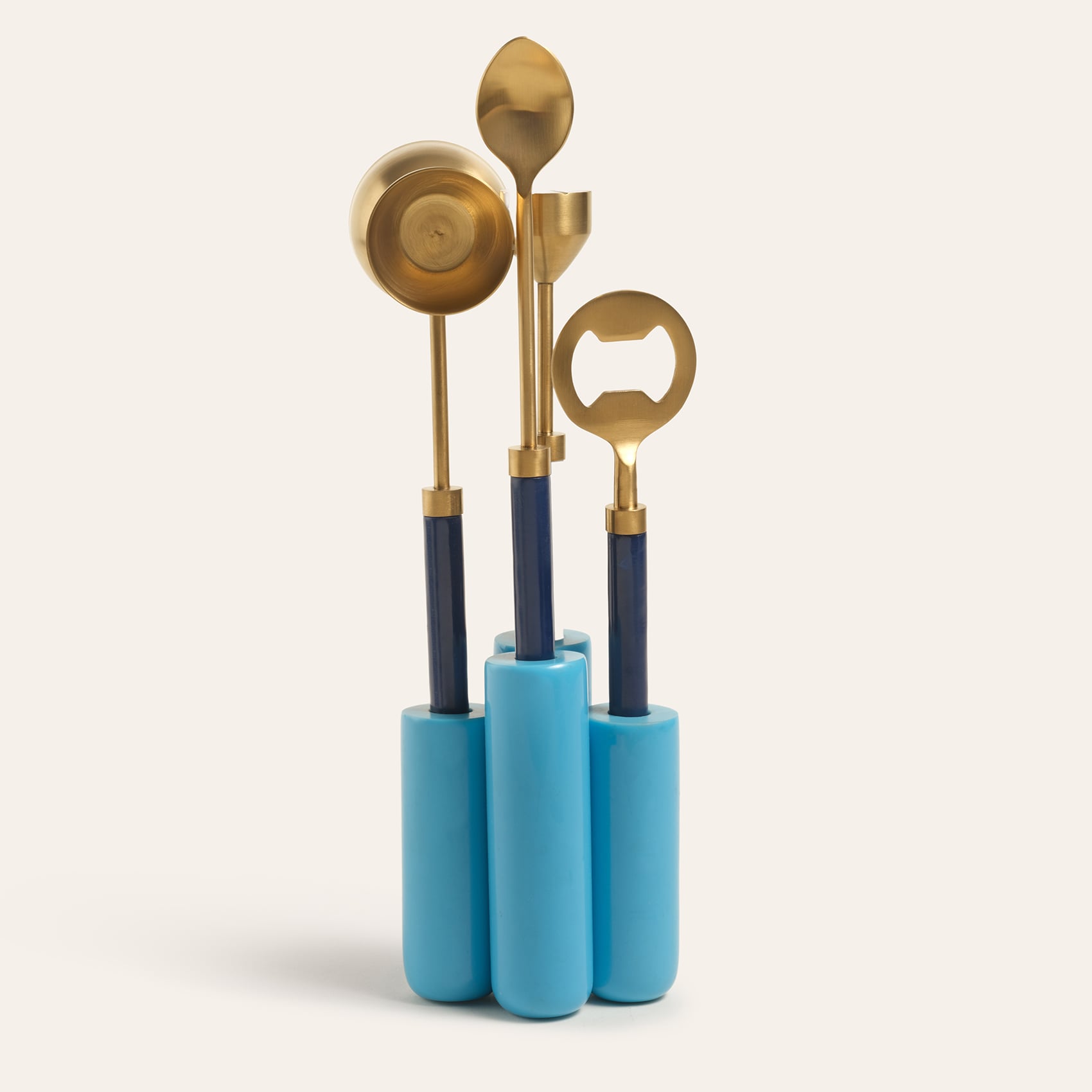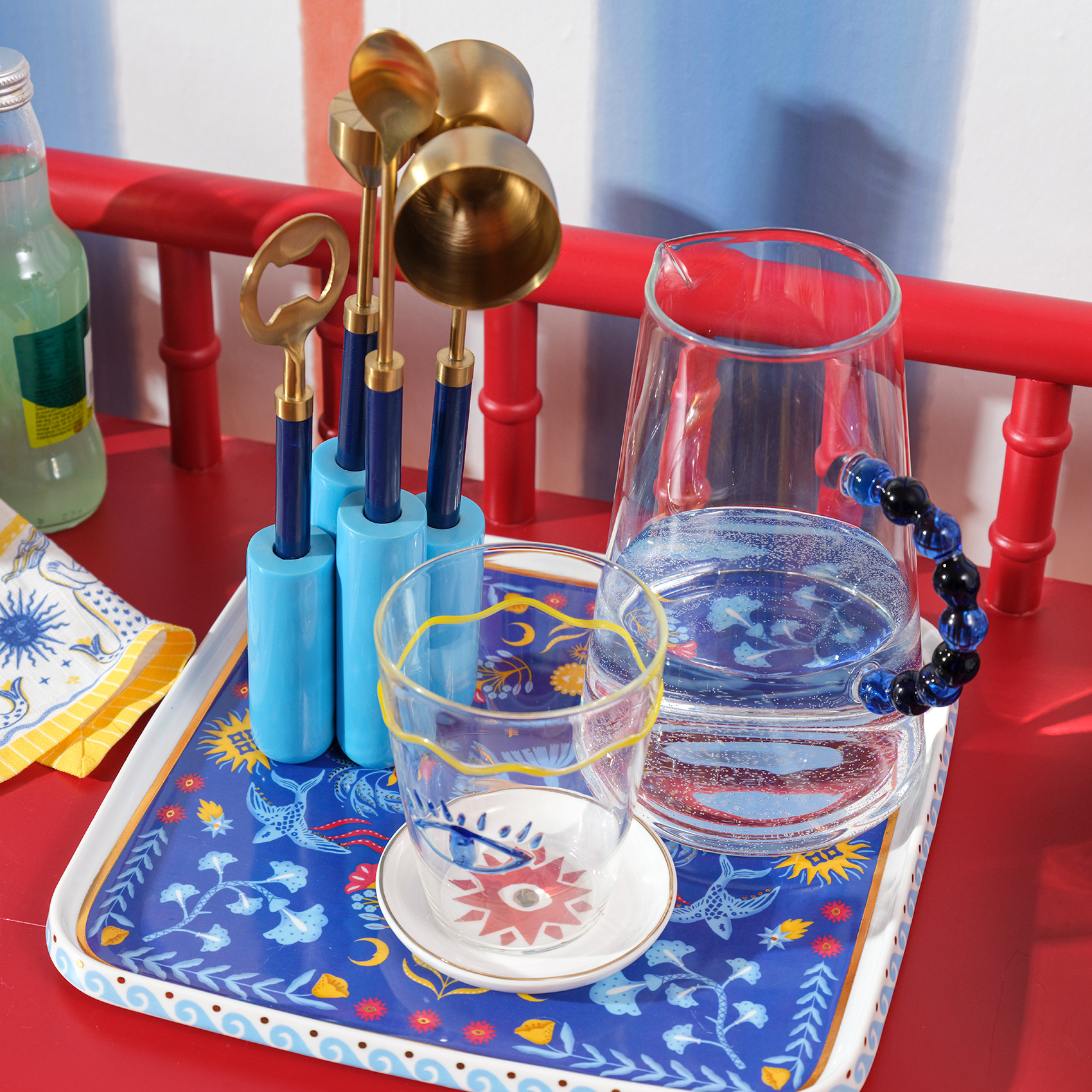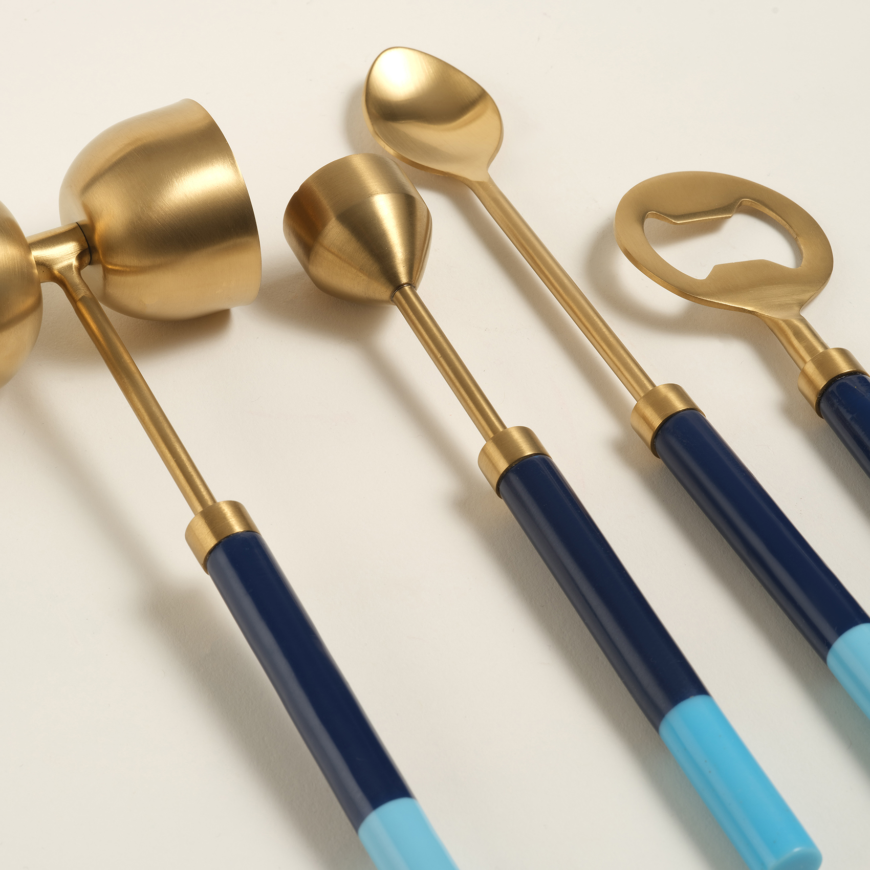 Mavi tonlarının ferahlığı ve gold çeliğin zarif ışıltısı, Rampur 4’lü bar aksesuar setinde bir araya geliyor. Şişe açacağı, ölçü kabı, kokteyl kaşığı ve karıştırma çubuğundan oluşan bu set, içecek sunumlarınıza sofistike bir dokunuş katarken, barınıza da enerjik bir ruh getiriyor. Blue koleksiyonunun deniz esintilerinden ilham alan bu özel tasarımı, her kokteyli bir sanat eserine dönüştürerek içki hazırlamayı keyifli bir deneyime taşıyor. El işçiliğinin zarafetiyle şekillenen Rampur, Hindistan’da ustalıkla üretildi.