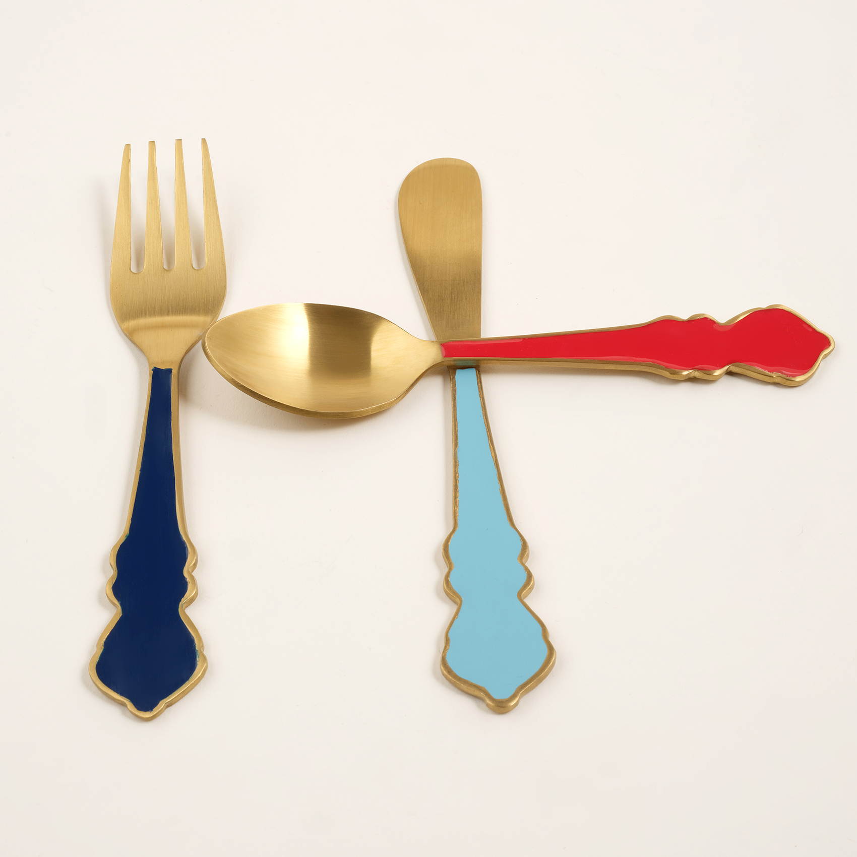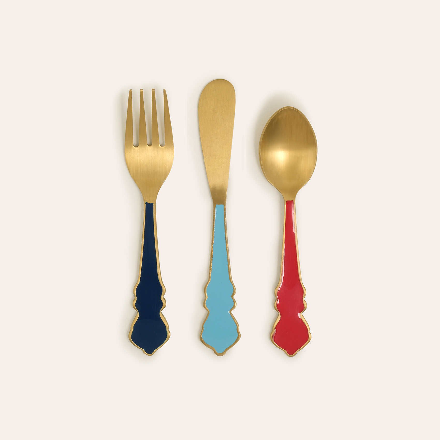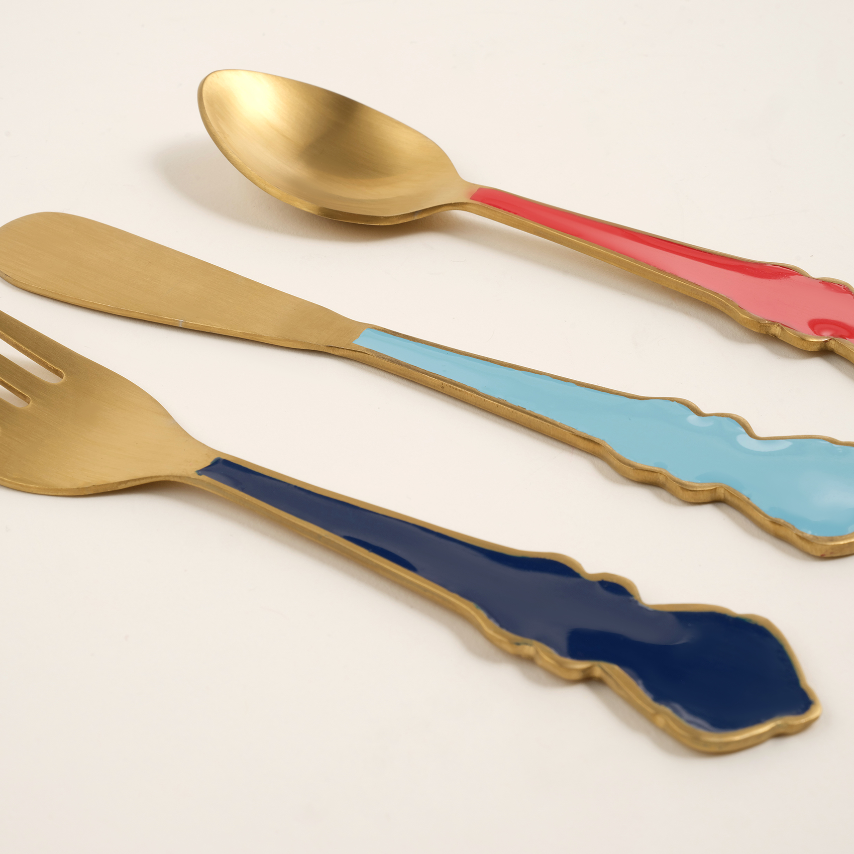 Rampur 3’lü çelik tatlı çatal kaşık bıçak seti, Blue koleksiyonunun zamansız şıklığını sofralarınıza taşıyor. Altın tonundaki çelik yüzeyi, zarif kıvrımlara sahip renkli saplarla tamamlanarak modern ve klasik estetiği çarpıcı bir yaklaşımla bir araya getiriyor. Sofistike detaylarla tasarlanan bu set, her tatlı sunumunu özel bir ritüele dönüştürüyor. Usta artizanlar tarafından titiz el işçiliğiyle şekillenen Rampur, Hindistan’da özenle üretildi.
