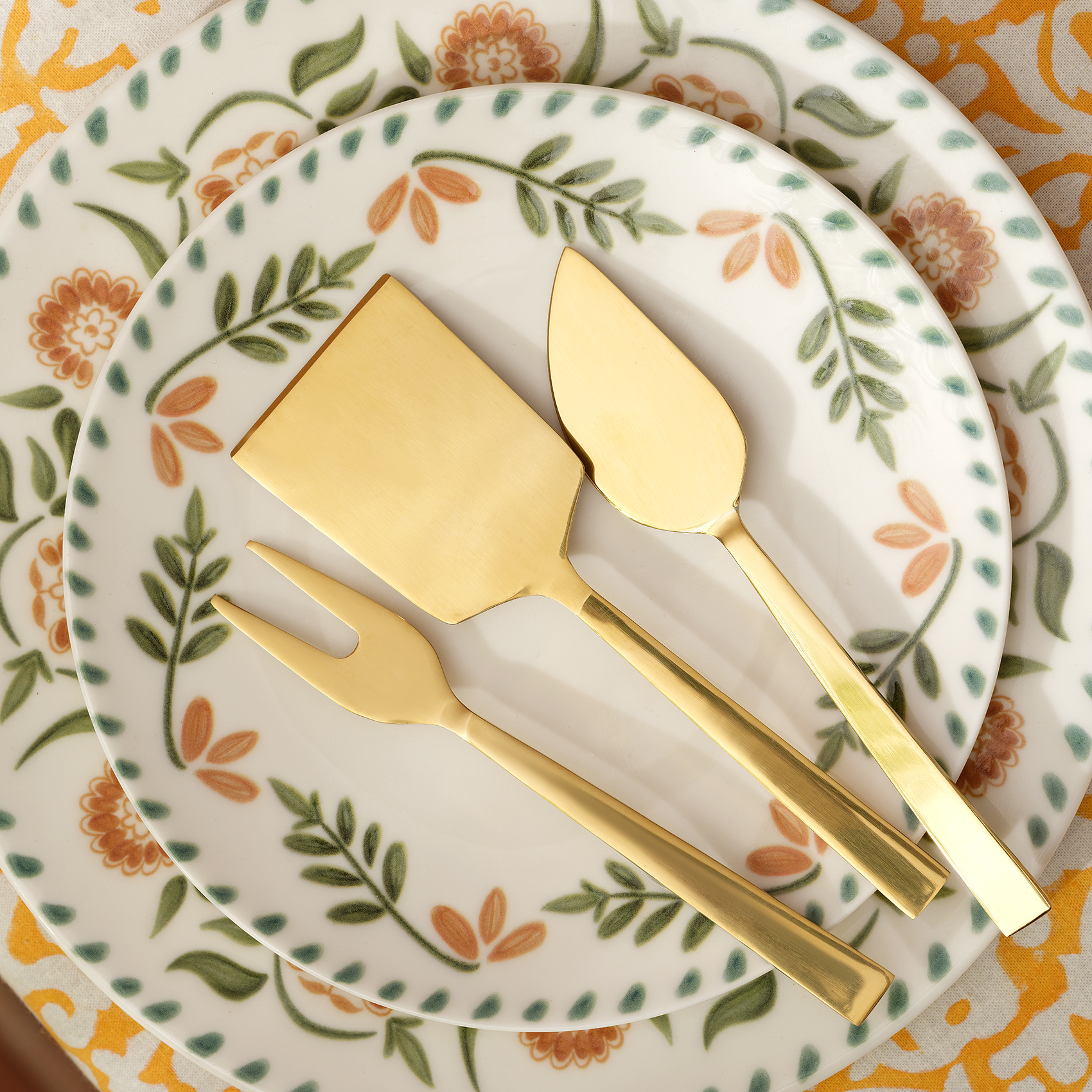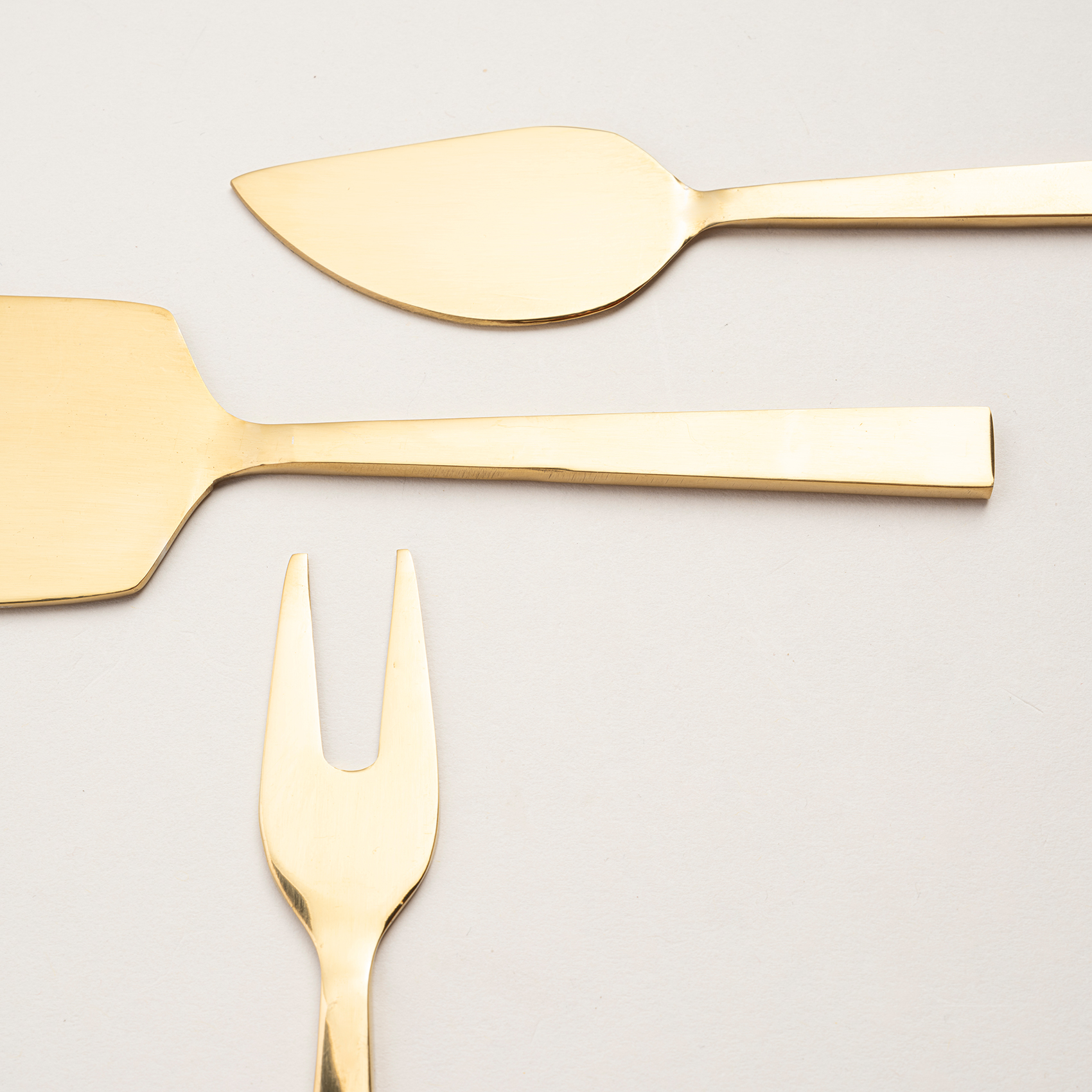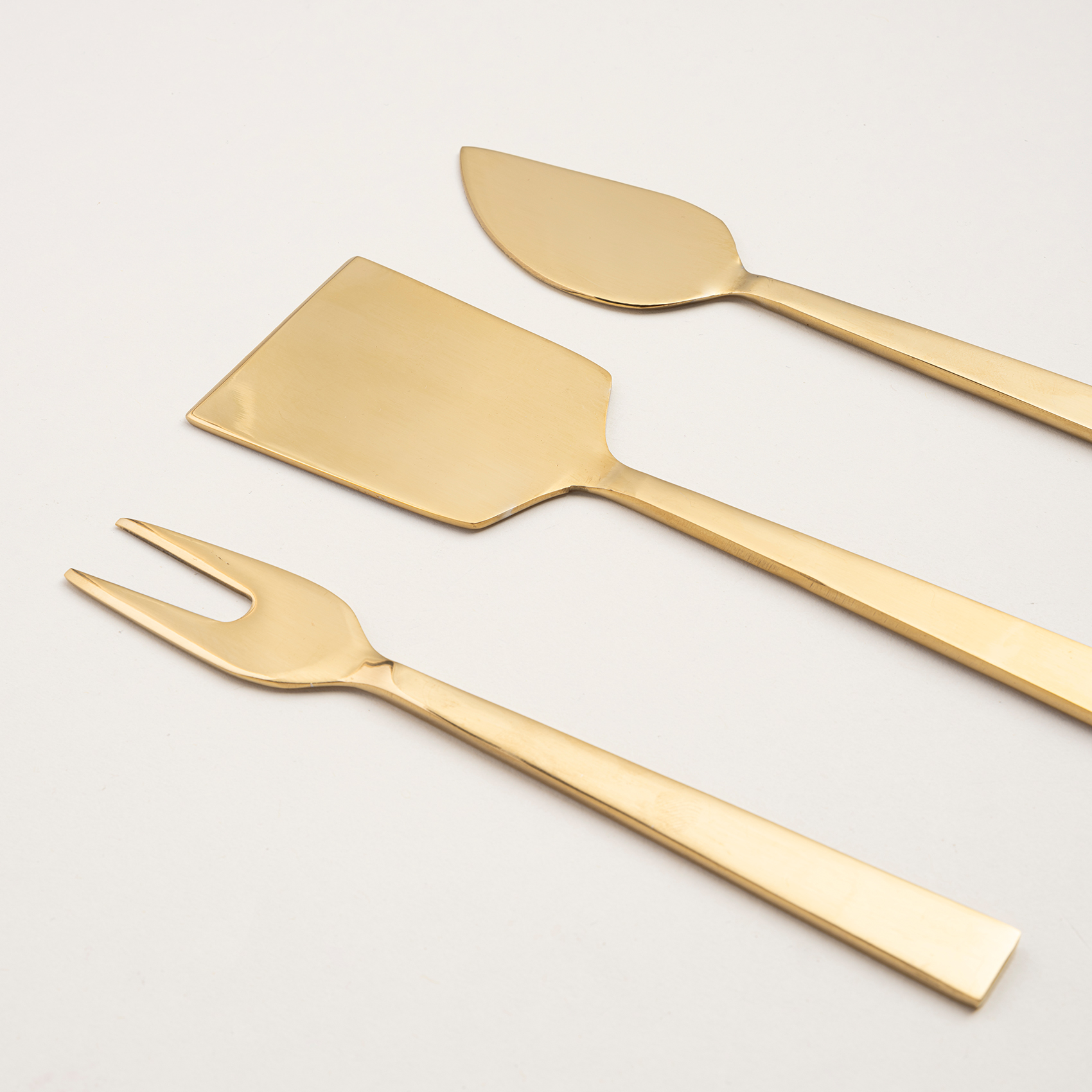Altın PVD kaplama paslanmaz çelik 3’lü peynir seti, Hindistan’da yaşayan zanaatkârlar tarafından el işçiliğiyle üretiliyor. Fonksiyonel tasarımıyla kullanım kolaylığı sunan Rampur peynir seti, altın renginin zarafetini sofralara taşıyor. İnsan sağlığına uygun ve dayanıklıdır.