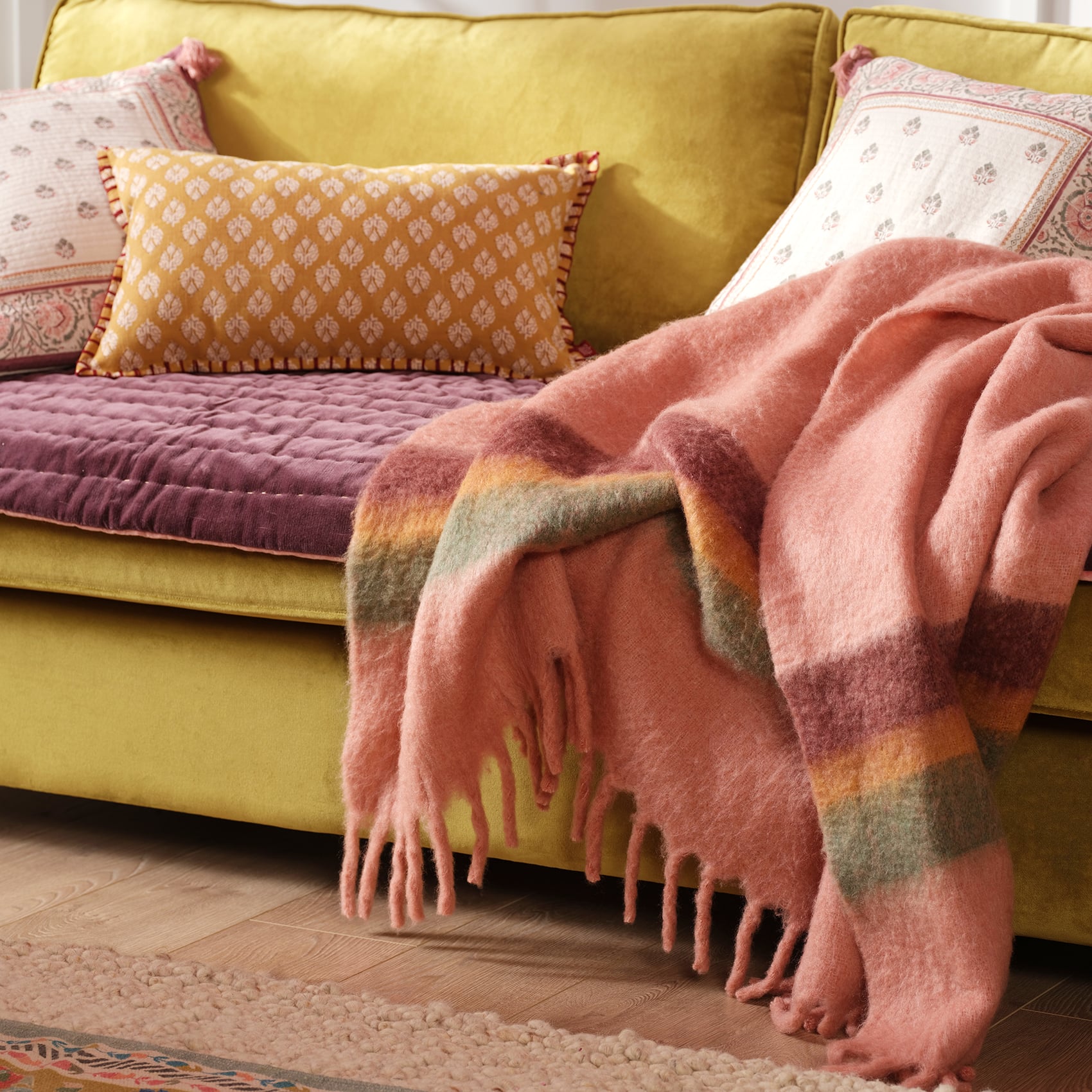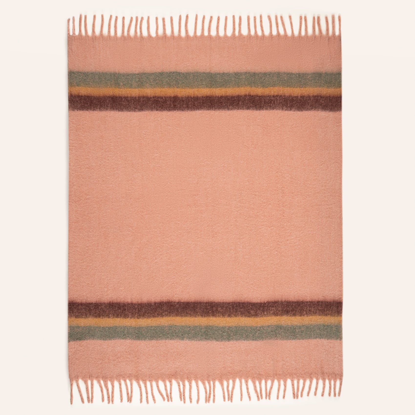 Ropar saçaklı kenar çizgili koltuk şalı, evinize sıcacık bir dokunuş katmak için burada! %20 yün, %60 akrilik ve %20 polyester karışımıyla üretilen bu şal, yumuşaklığıyla sizi sarıp sarmalarken, kil tonları ve sofistike kenar çizgileriyle yaşam alanınıza eğlenceli bir stil kazandırır. Saçaklı detaylarıyla hareketli ve zarif, tam da Zsa Zsa Zsu tarzına uygun bir parça!
