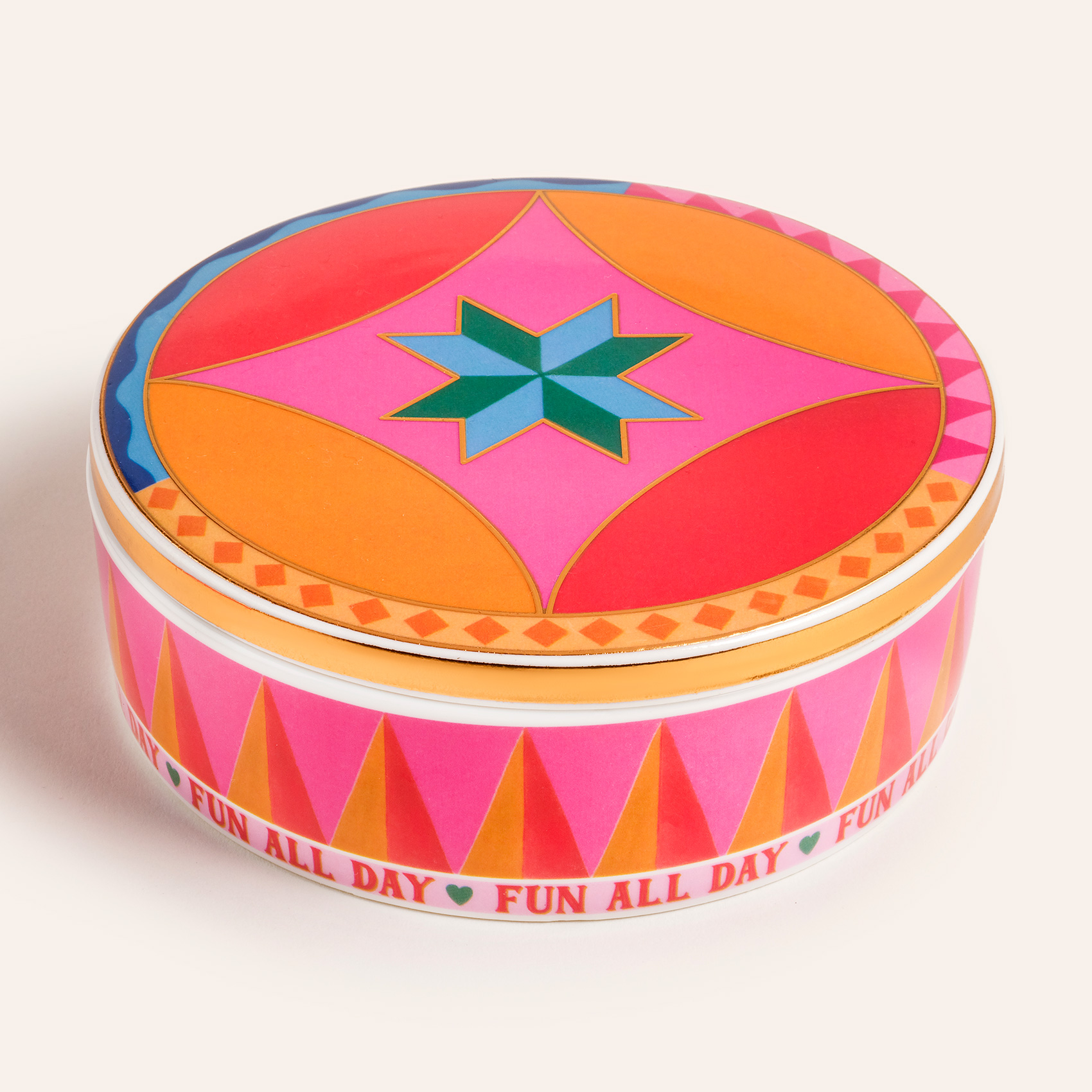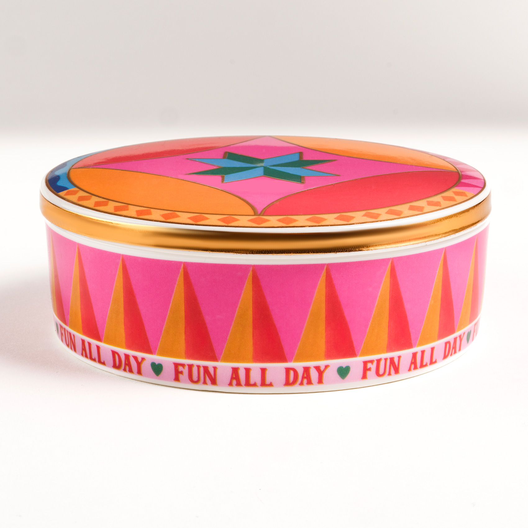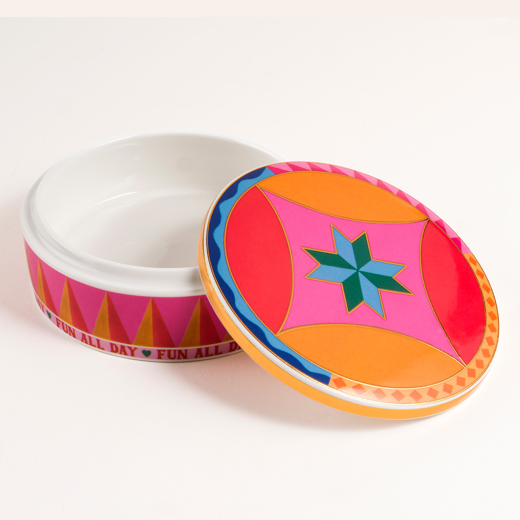Shekou porselen dekoratif obje, Cheerland koleksiyonunun neşesini taşıyan kapaklı bir renk kutusu gibi. Oyunbaz, enerjik ve tek başına bile bir kutlama hissi yaratıyor. Eğlence mesajlarıyla bezeli yüzeyi, dinamik formu ve capcanlı renkleriyle bulunduğu her ortama karnaval havası katıyor. Parlak porselen yüzeyde hayat bulan desenler, usta işi dekal tekniğiyle uygulanıyor. Temizliği çok kolay. Nemli bir bezle silmeniz yeterli.