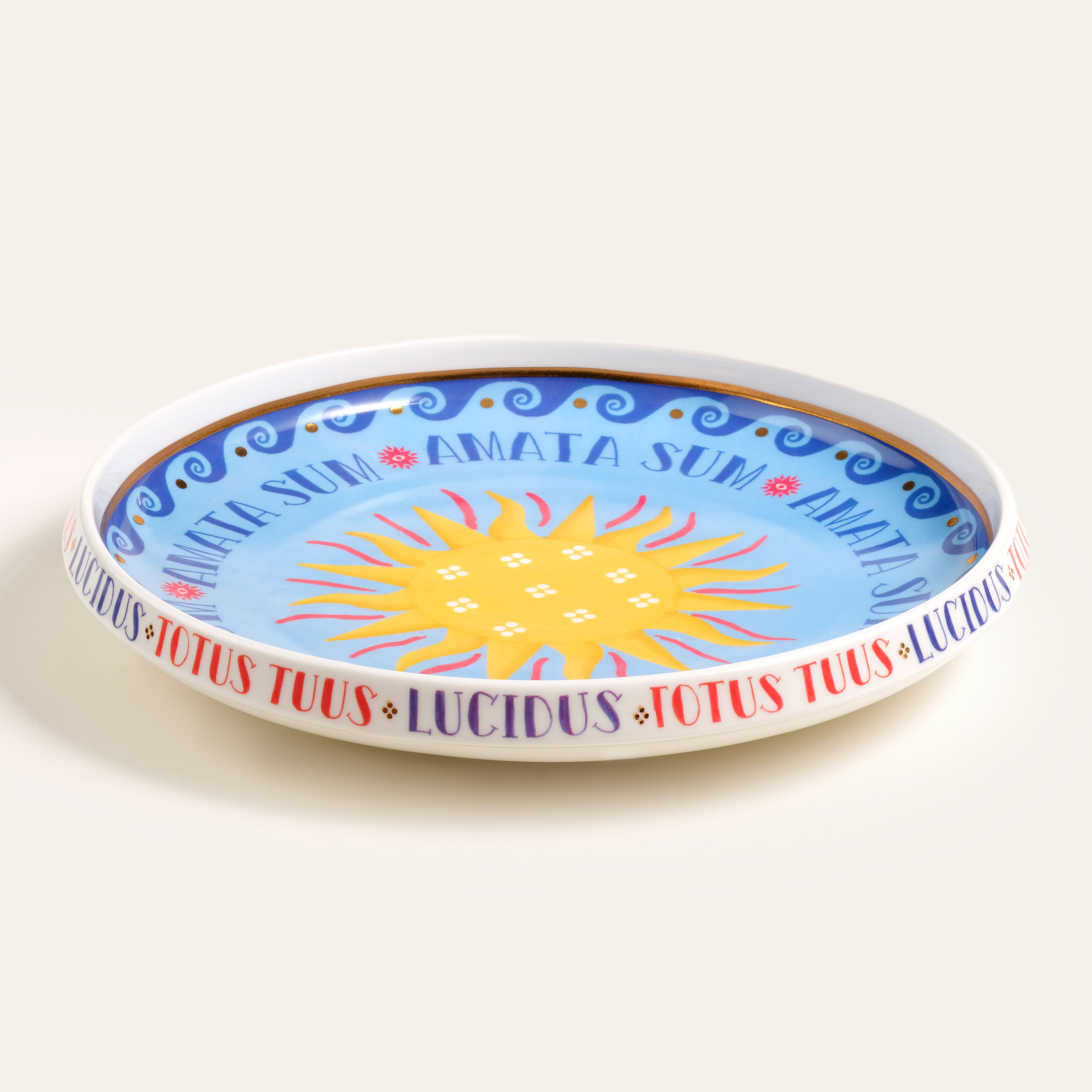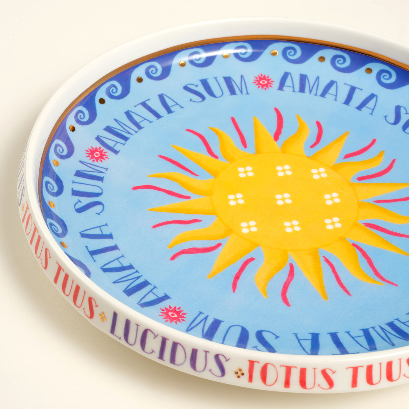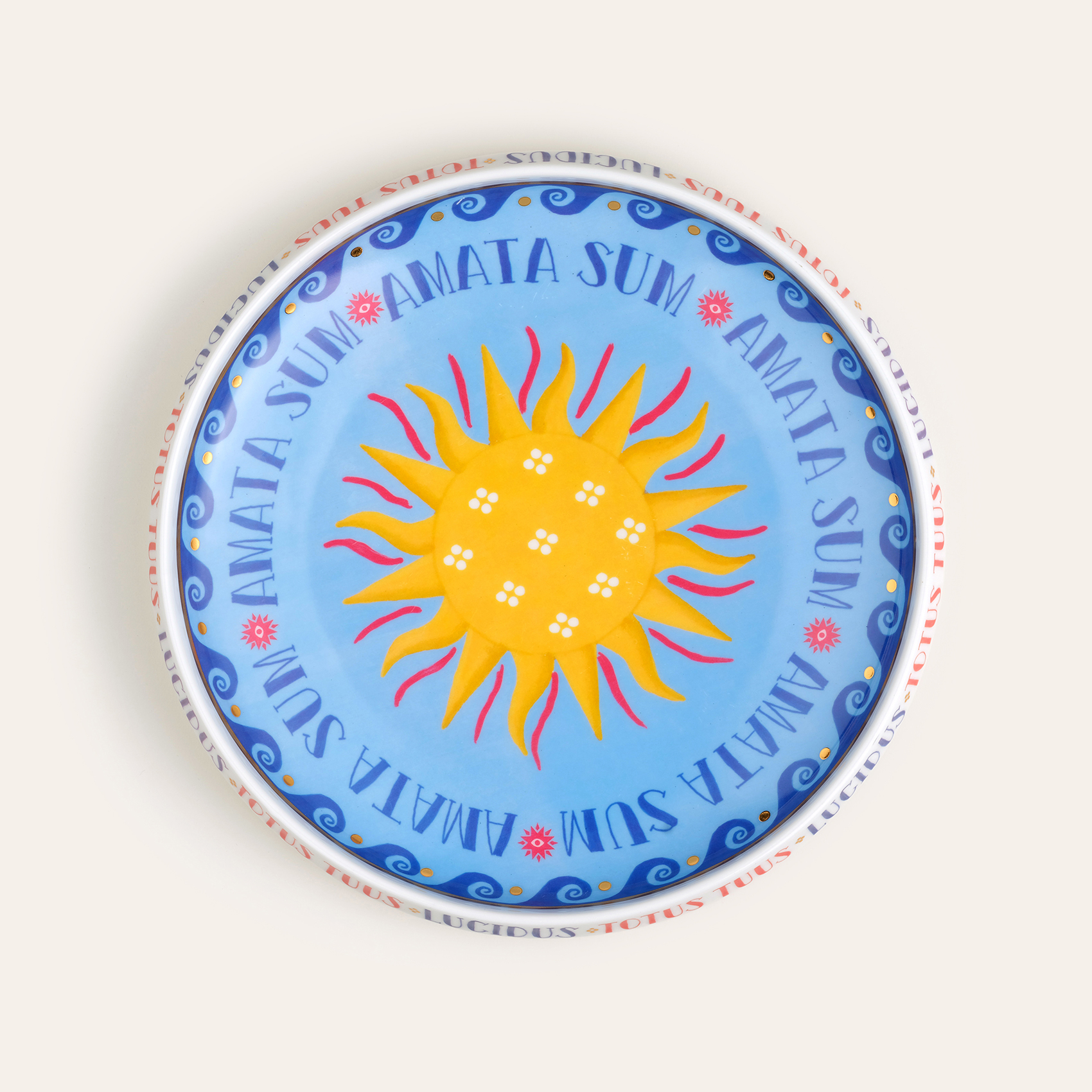 Blue koleksiyonunun rafine ve oyuncu stilinden ilham alan Shekou porselen dekoratif tepsi, canlı renklerin ve zarif detayların buluştuğu göz alıcı bir tasarım sunuyor. Ortasındaki parlak güneş motifi, Akdeniz’in sıcaklığını ve enerjisini yansıtırken, çevresindeki mavi ve kırmızı detaylar hareketli bir dinamizm katıyor. Kenarına işlenmiş "Amata Sum" ve "Totus Tuus" ifadeleri tasarıma anlam derinliği kazandırarak mistik bir atmosfer yaratıyor. Güneşin sıcaklığını ve renklerin coşkusunu Shekou ile evinize taşıyın!