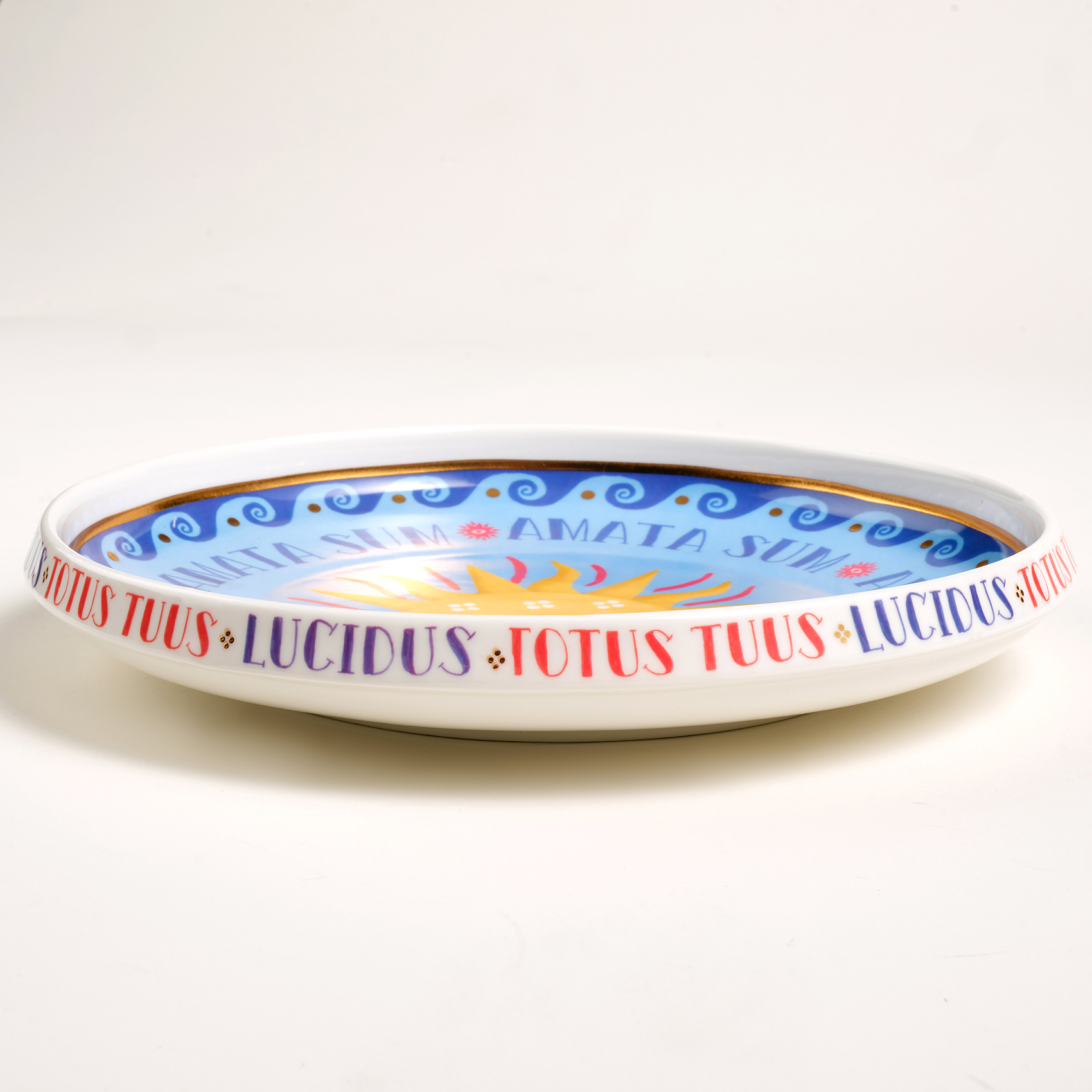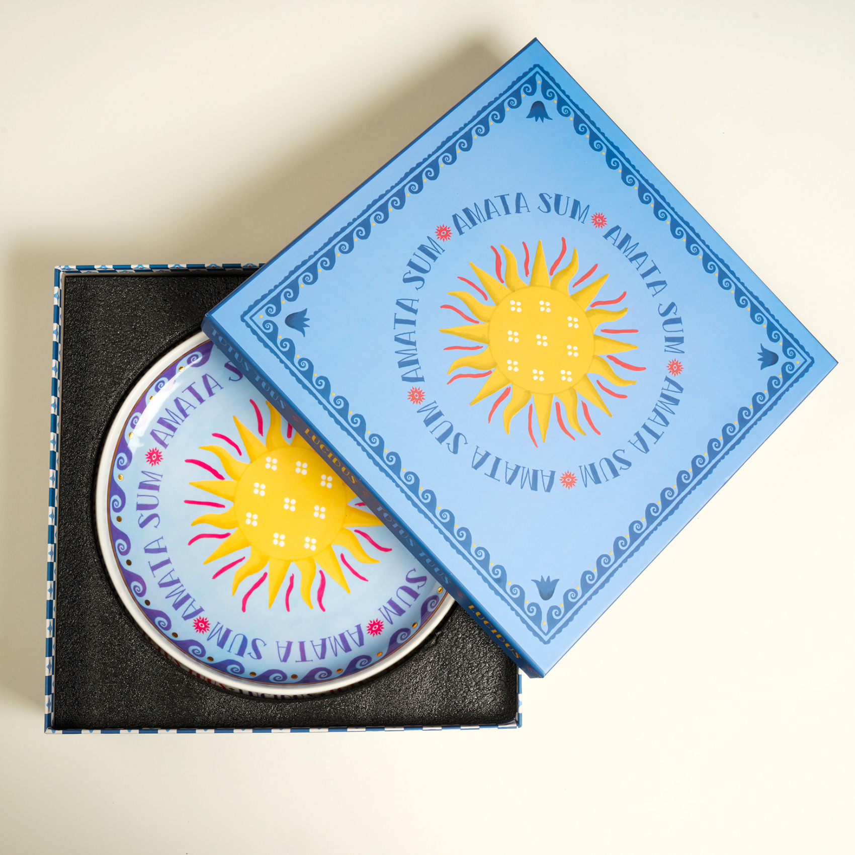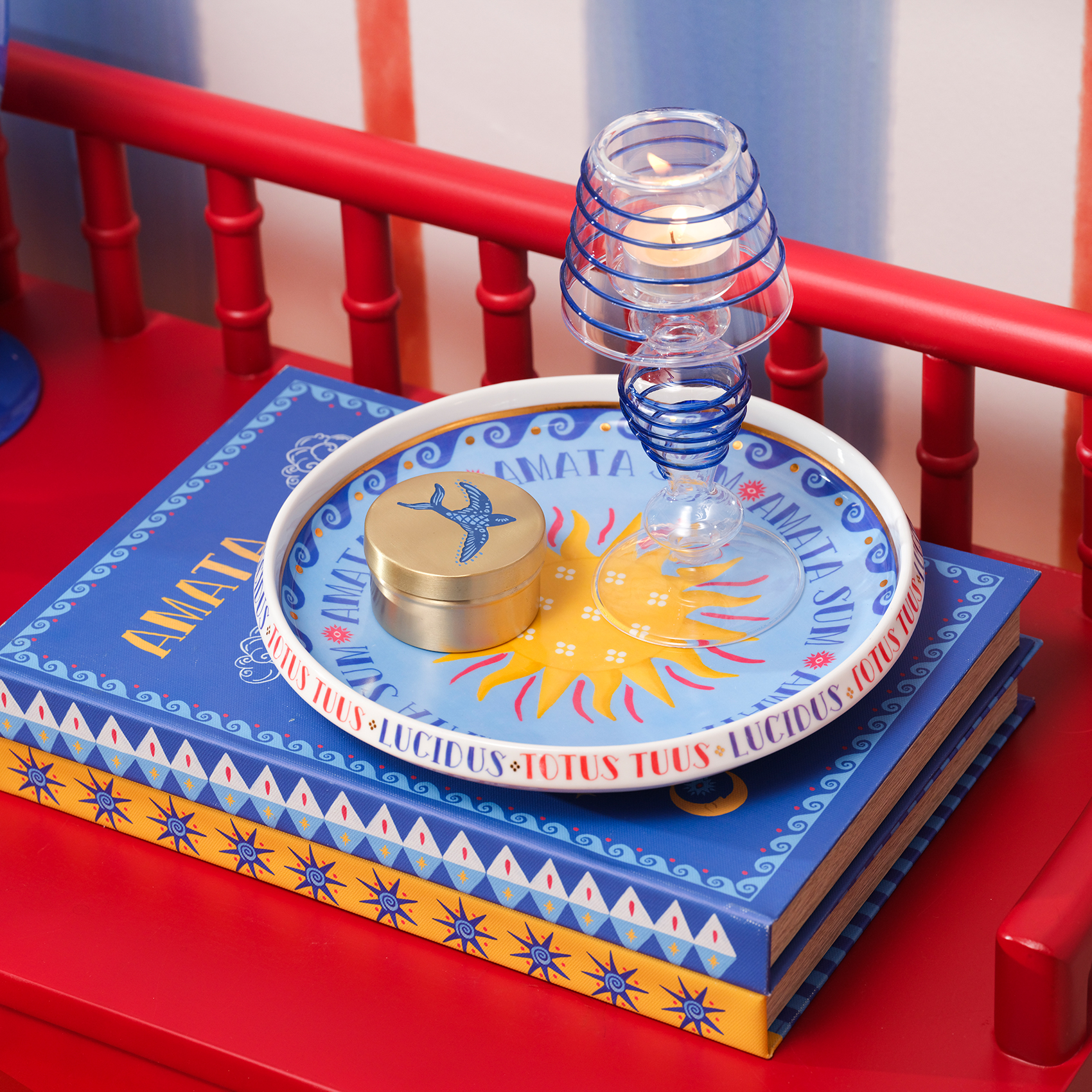 Blue koleksiyonunun rafine ve oyuncu stilinden ilham alan Shekou porselen dekoratif tepsi, canlı renklerin ve zarif detayların buluştuğu göz alıcı bir tasarım sunuyor. Ortasındaki parlak güneş motifi, Akdeniz’in sıcaklığını ve enerjisini yansıtırken, çevresindeki mavi ve kırmızı detaylar hareketli bir dinamizm katıyor. Kenarına işlenmiş "Amata Sum" ve "Totus Tuus" ifadeleri tasarıma anlam derinliği kazandırarak mistik bir atmosfer yaratıyor. Güneşin sıcaklığını ve renklerin coşkusunu Shekou ile evinize taşıyın!