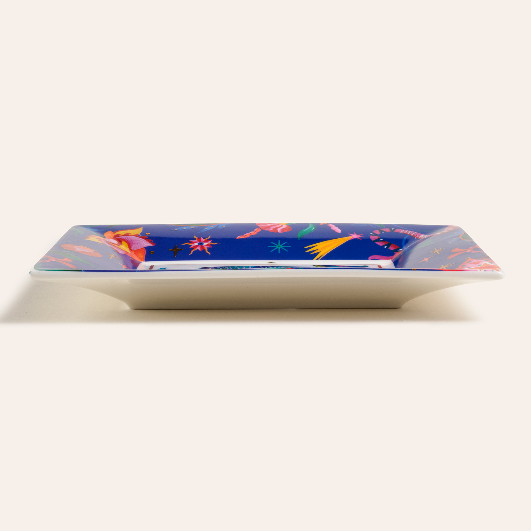 Shekou porselen dekoratif tepsi, Maximalist koleksiyonun tüm coşkusunu üzerinde taşıyor. Yıldızlar, çiçekler ve hayali figürlerle dolu desenler, evrenle dans eden bir enerji yayıyor. Zsa Zsa Zsu tasarım ekibinin çizimleriyle hayat bulan bu parça, bulunduğu her ortamda dikkatleri üzerine çekiyor. Parlak porselen yüzeyde hayat bulan desenler, özenli dekal işçiliğiyle uygulanıyor. Temizliği çok kolay. Nemli bir bezle silmeniz yeterli.