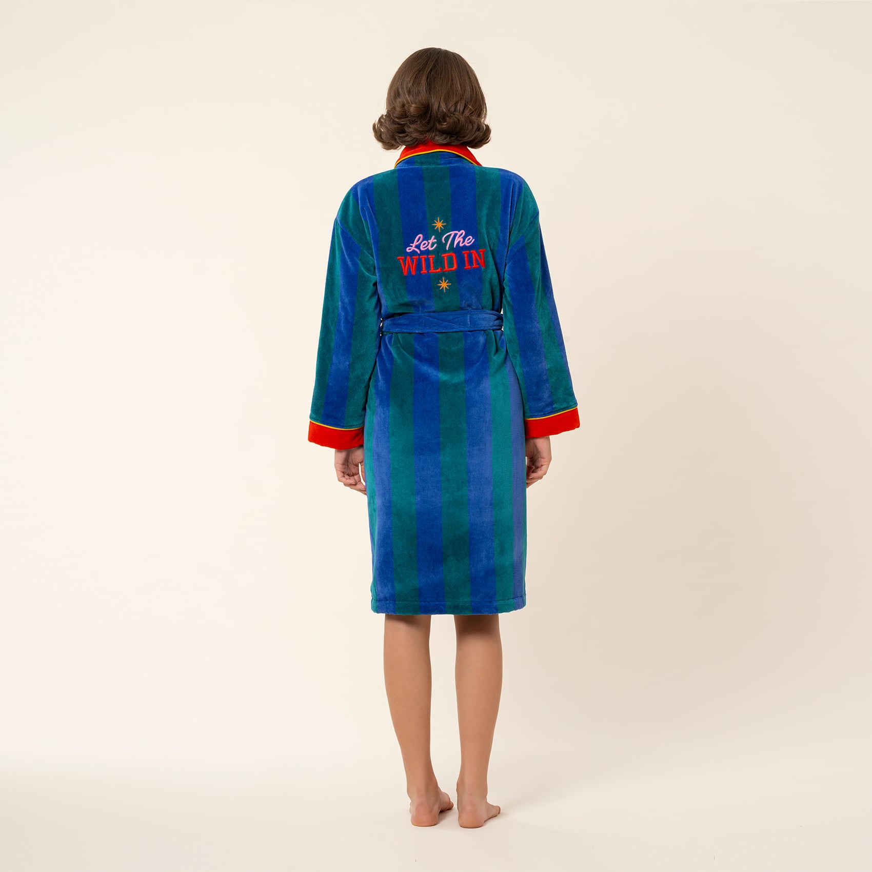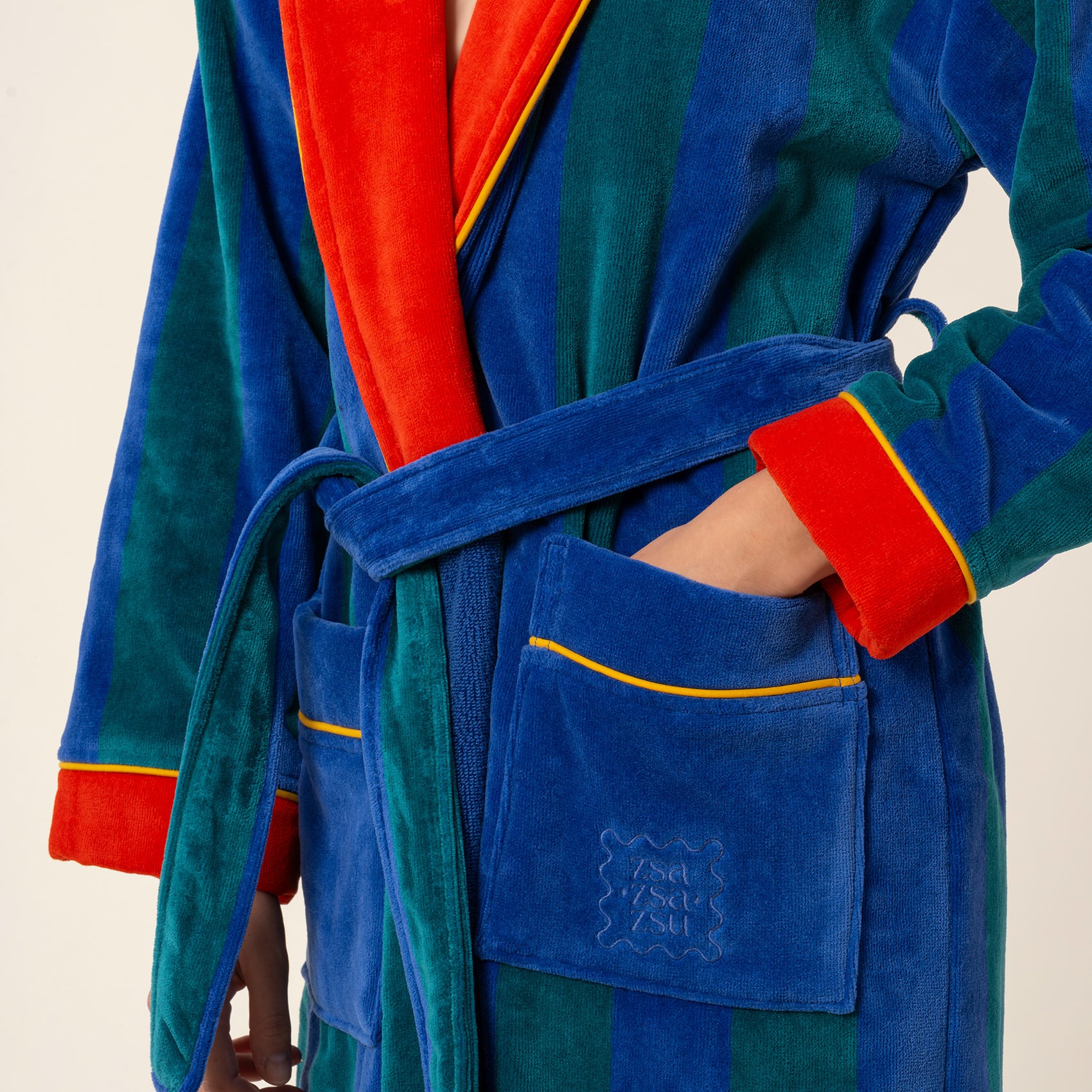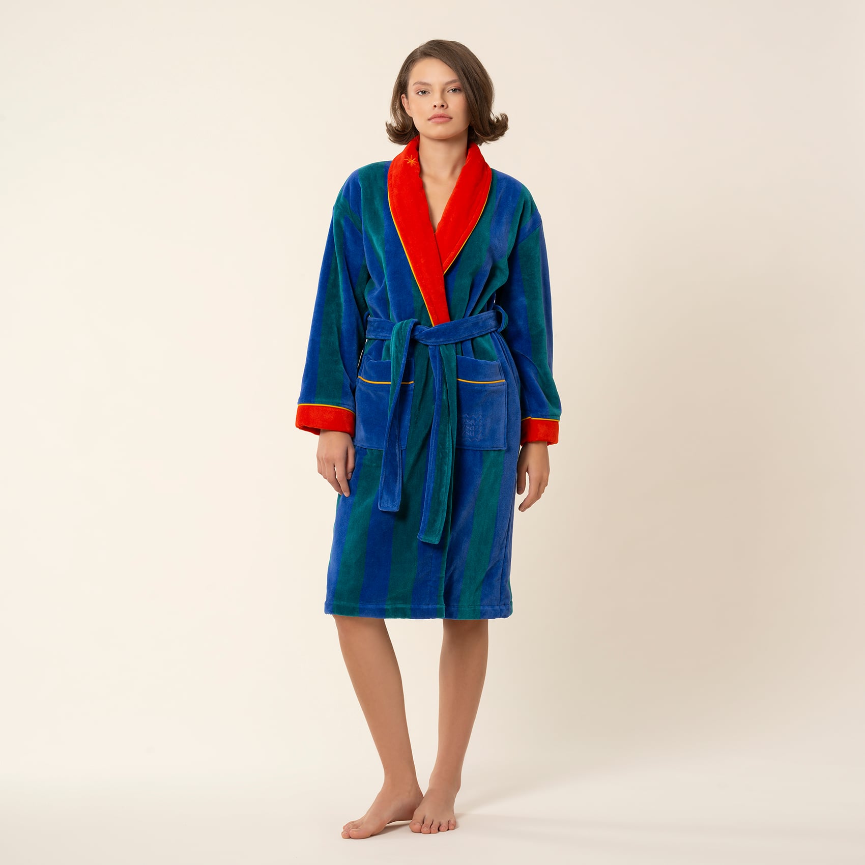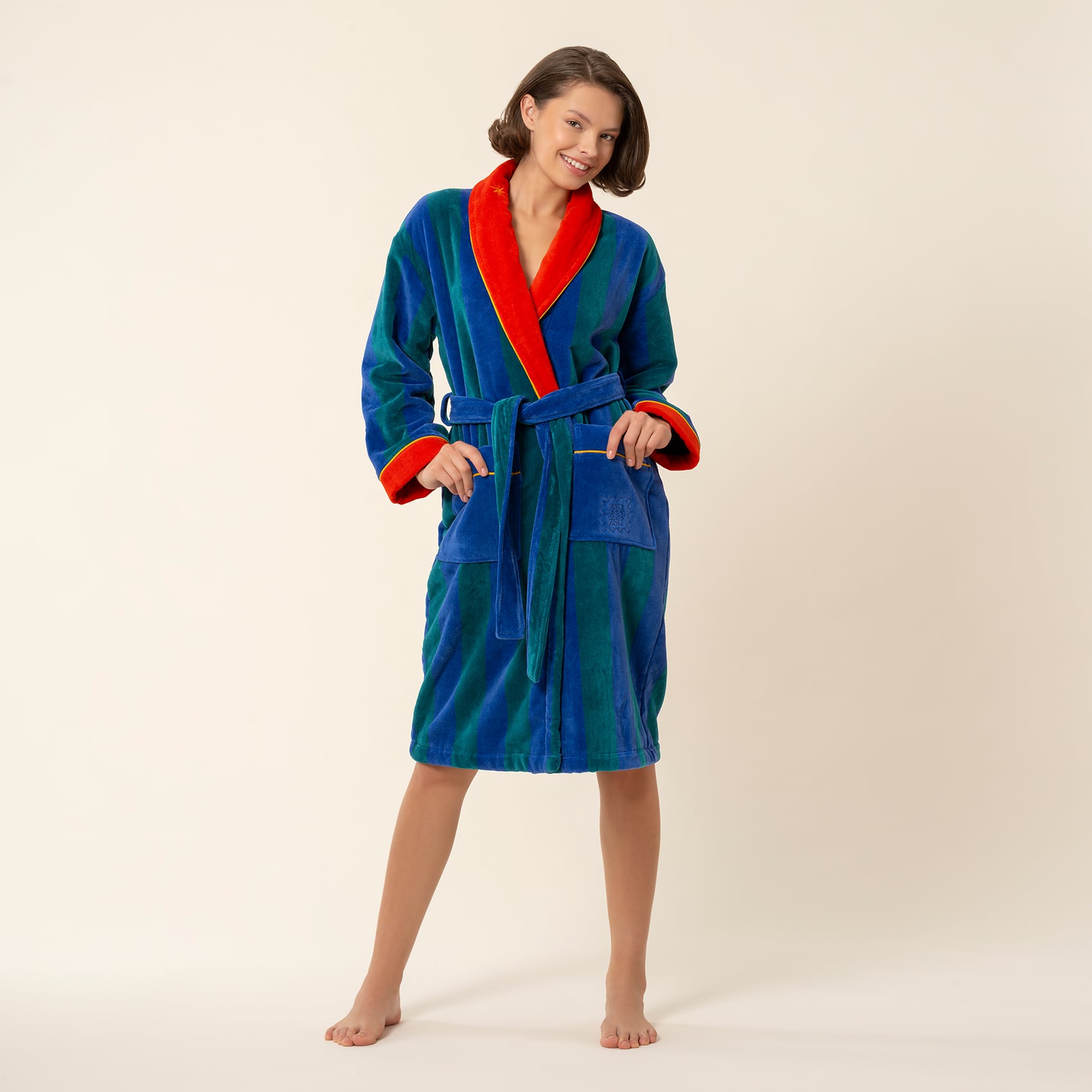 Maximalist koleksiyonunun mod yükselten renkli stilinden doğan Tabea bornoz, iyi hissetmenin stil sahibi yolunu sunuyor. Türkiye’de %100 pamuk kadife kumaştan üretilen bu 450 GSM tasarım, sizi yumuşacık sararken rahatlığı da yanında getiriyor. Zsa Zsa Zsu Tasarım Ekibi’nin yorumladığı özgün nakış desenleri, beklenmedik kontrast tonlarla birleşerek göz alıcı bir etki yaratıyor. Cep detayı pratiklik sağlarken, kemer vücuda zarif bir silüet kazandırıyor. Tabea, banyodan sonra dahi enerjisiyle ışıldamak isteyenler için tasarlandı.