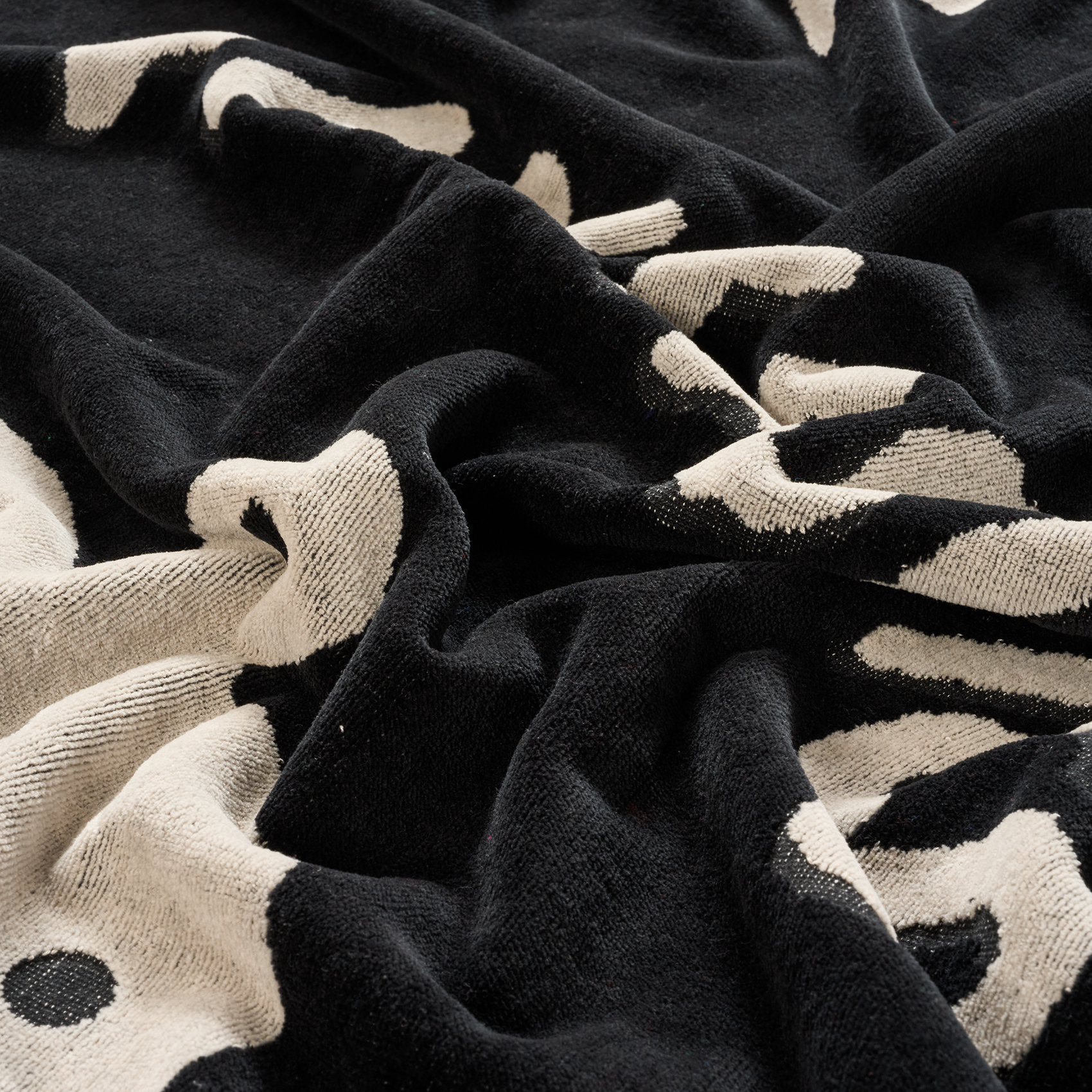 Plajda desen oyunu. Bold koleksiyonunda yer alan Tabea Jakarlı %100 Pamuk Kadife Plaj Havlusu, siyah beyazın yüksek kontrastlı dünyasını grafik bir anlatımla yorumluyor. Jakarlı yüzeyin içine işlenen motifler uzaktan bile ayırt edilebilen güçlü bir ifade oluşturuyor. %100 pamuk yapısı emici ve dolgun bir kullanım sunarken, soyut formlar, yıldızlar ve organik çizgiler yüzeyde akışkan bir denge kuruyor. Sınırlı bir renk paletiyle yoğun bir etki ortaya çıkıyor. Güneşte uzanırken, denizden çıkarken ya da kumda kendi alanını kurarken stilini desenler üzerinden anlatmayı sevenler için tasarlandı. Türkiye’de üretilmiştir.