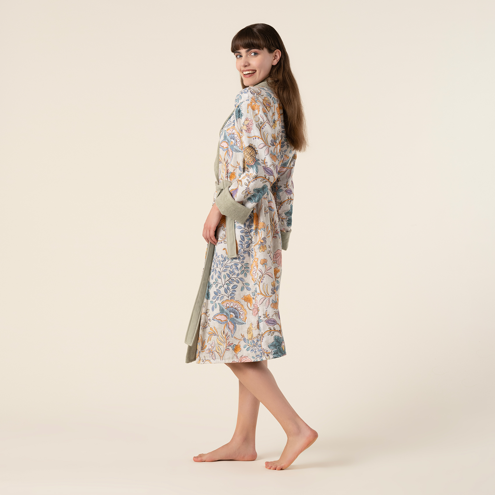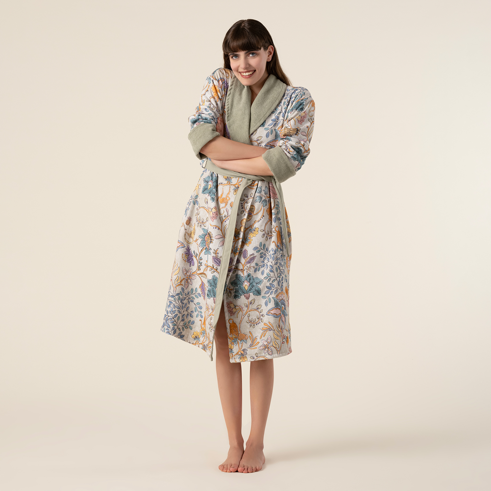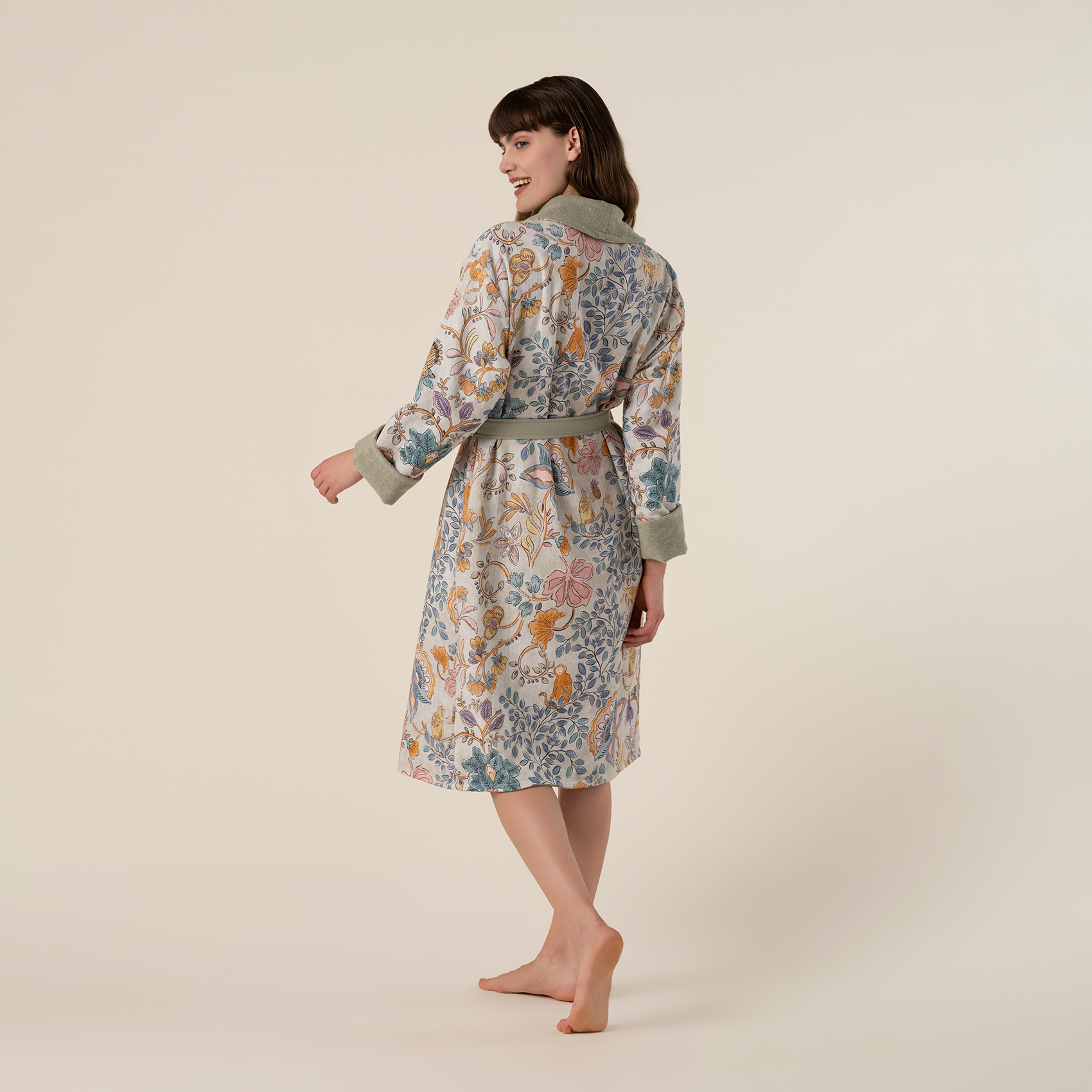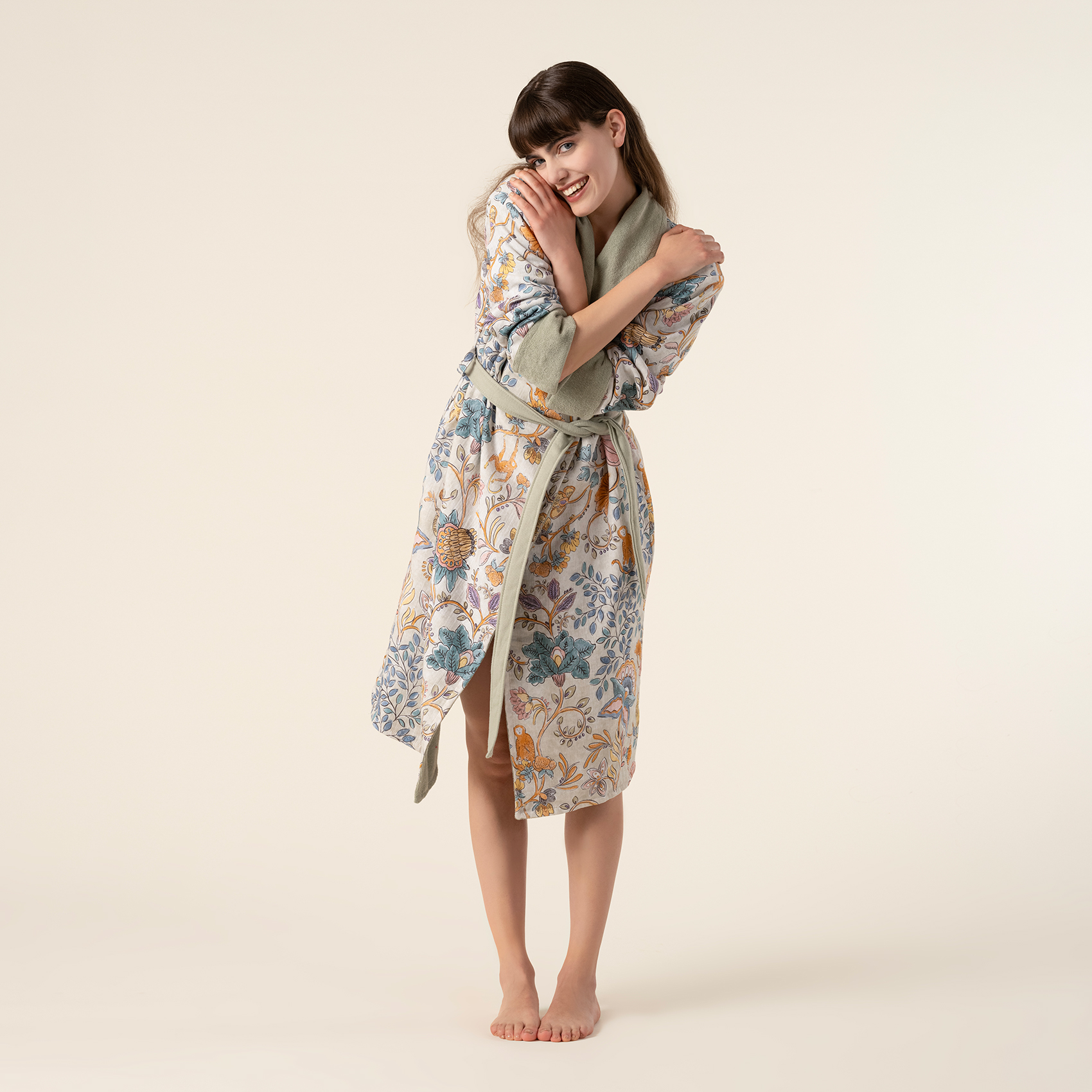 Zsa Zsa Zsu nun farklı kültürlerin otantik desenlerinden ve sofistike renklerinden ilham alan Heritage koleksiyonunun stil kodlarını taşıyan Tabea bornoz, özgün tasarımı ve kalitesi ile sizi eklektik lüks hissini deneyimlemeye davet ediyor. Tabea, %100 pamuk liflerinden dokunan müslin dış kumaşı ve %100 pamuk bukle iç kumaşıyla üst düzey ferahlık sunuyor. Şal yakalı bornoz, şık ve işlevsel bir kuşak ile birlikte geliyor. Tabea bornoz Türkiye’de üretilmiştir.