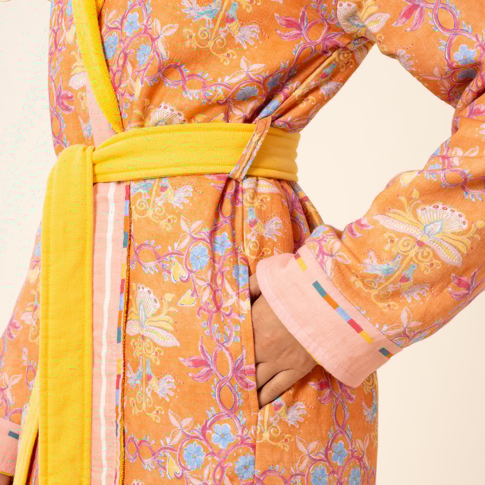 Günlük ritüellerinizi stil sahibi bir şekilde yaşamak istiyorsanız, Tabea kimono yaka müslin %100 pamuk bornoz tam size göre! Türkiye’de üretilen bu özel tasarım, iç yüzeyindeki yumuşacık pamuk dokusuyla sizi sararken, müslin dış dokusundaki eklektik desenleri ve sofistike renkleriyle aynaya bakarken bile modunuzu yükseltir. Heritage koleksiyonunun ilham dolu parçalarından biri olan Tabea, kimono yakası ve ayarlanabilir kemeriyle ev halinize bambaşka bir hava katar.
