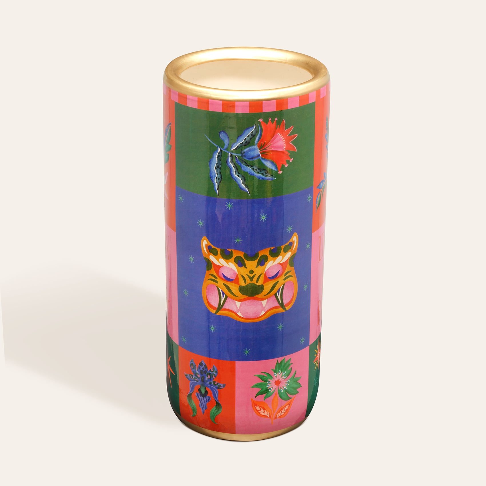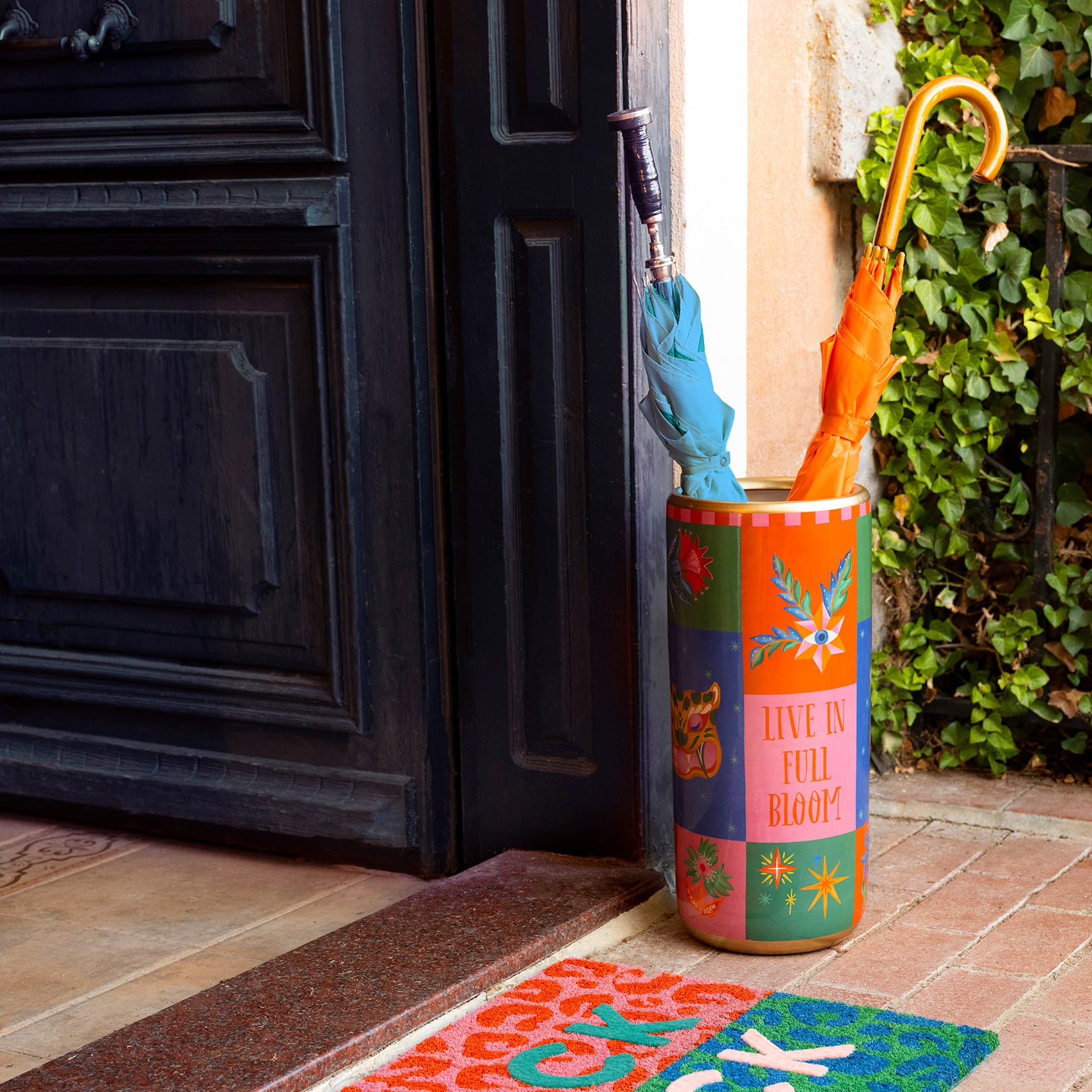 Tanbu Porselen Şemsiyelik, Maximalist koleksiyonun yaratıcı stilini heykelsi bir forma dönüştürerek kapınızı küçük bir sahneye çeviriyor. Porselen yüzeye dekal tekniğiyle aktarılan desenler; hayali karakterlerin oyunu, vahşi hayvan figürleri ve tipografik sürprizlerle buluşuyor. Her motif, içeri girenlere “bu evde hayat renkli, özgür ve eğlenceli” diye sesleniyor. El boyaması altın bordür, bu görsel karnavalı zarif bir ışıltıyla taçlandırıyor. Tanbu, şemsiyeleri toplarken bile evinize stil, neşe ve ilham katıyor.