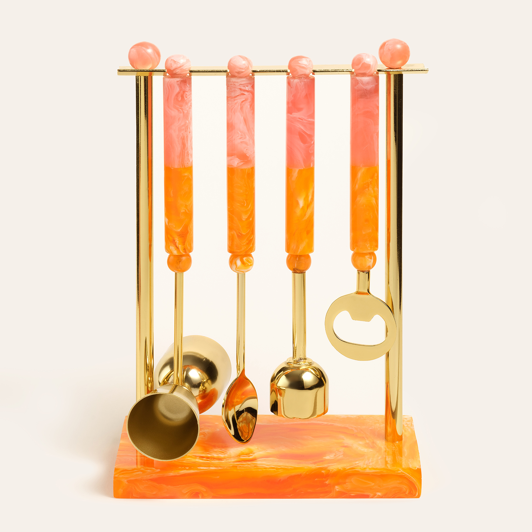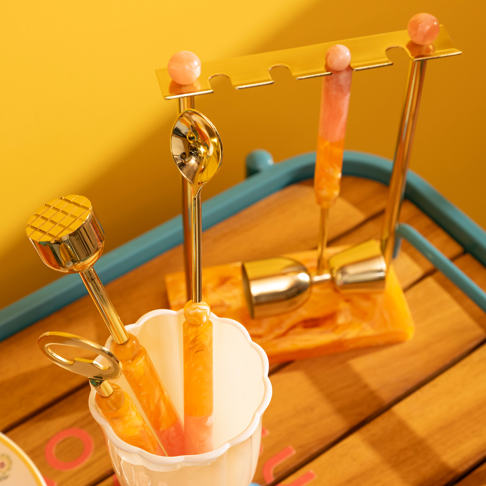 Heritage koleksiyonunun ilham dolu otantik dünyasından gelerek evinize neşe ve renk katan Tanda 4’lü çelik bar aksesuarları seti, Hindistan’daki usta zanaatkârlar tarafından üretildi. Renkli reçine sapları ve altın rengi metal detaylarıyla mutluluk saçan bu set, kokteyl hazırlama deneyiminizi sadece pratik bir işlem değil, renkli bir şölene dönüştürüyor. Şişe açacağı, altın çelikten şık bir parça olarak, barın enerjik havasını yansıtan modern reçine sapıyla göz kamaştırıyor; karıştırma kaşığı, zarif tasarımıyla kokteyllerinize eğlenceli bir dokunuş katıyor; süzgeç, altın rengi çelik ve modern çizgileriyle estetik bir parça olarak hem işlevsel hem de çarpıcı bir detay sunuyor; süzme kaşığı ise şıklığı ve pratikliği birleştirerek her içeceğinize zarif bir dokunuş ekliyor. Her bir parça, sadece işlevselliğiyle değil, aynı zamanda barınıza kattığı stil ve neşeyle kendini gösteriyor. Tanda bar seti, Heritage koleksiyonunun özgün ve cesur tasarım dilini yaşam alanlarınıza taşıyor; çünkü her içecek, Zsa Zsa Zsu ruhuyla kutlanmayı hak eder!