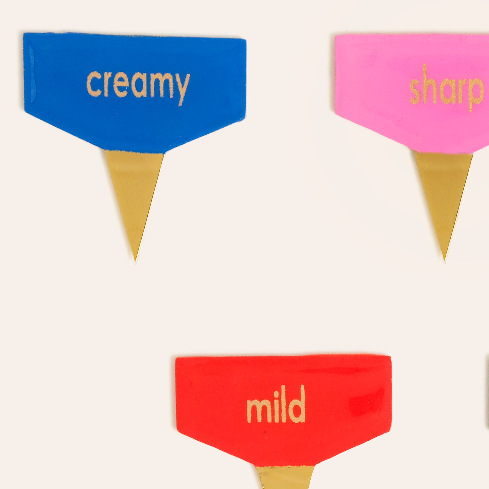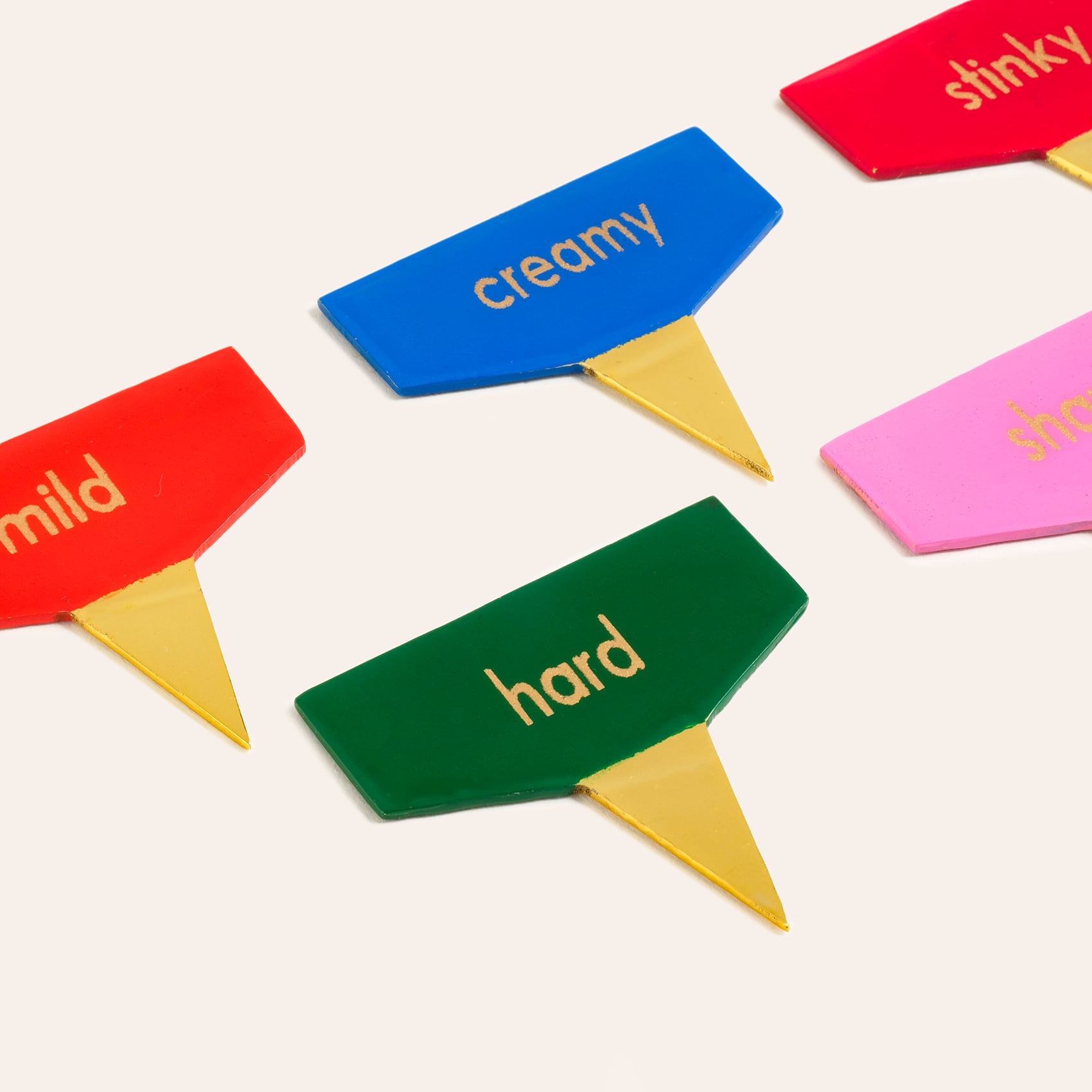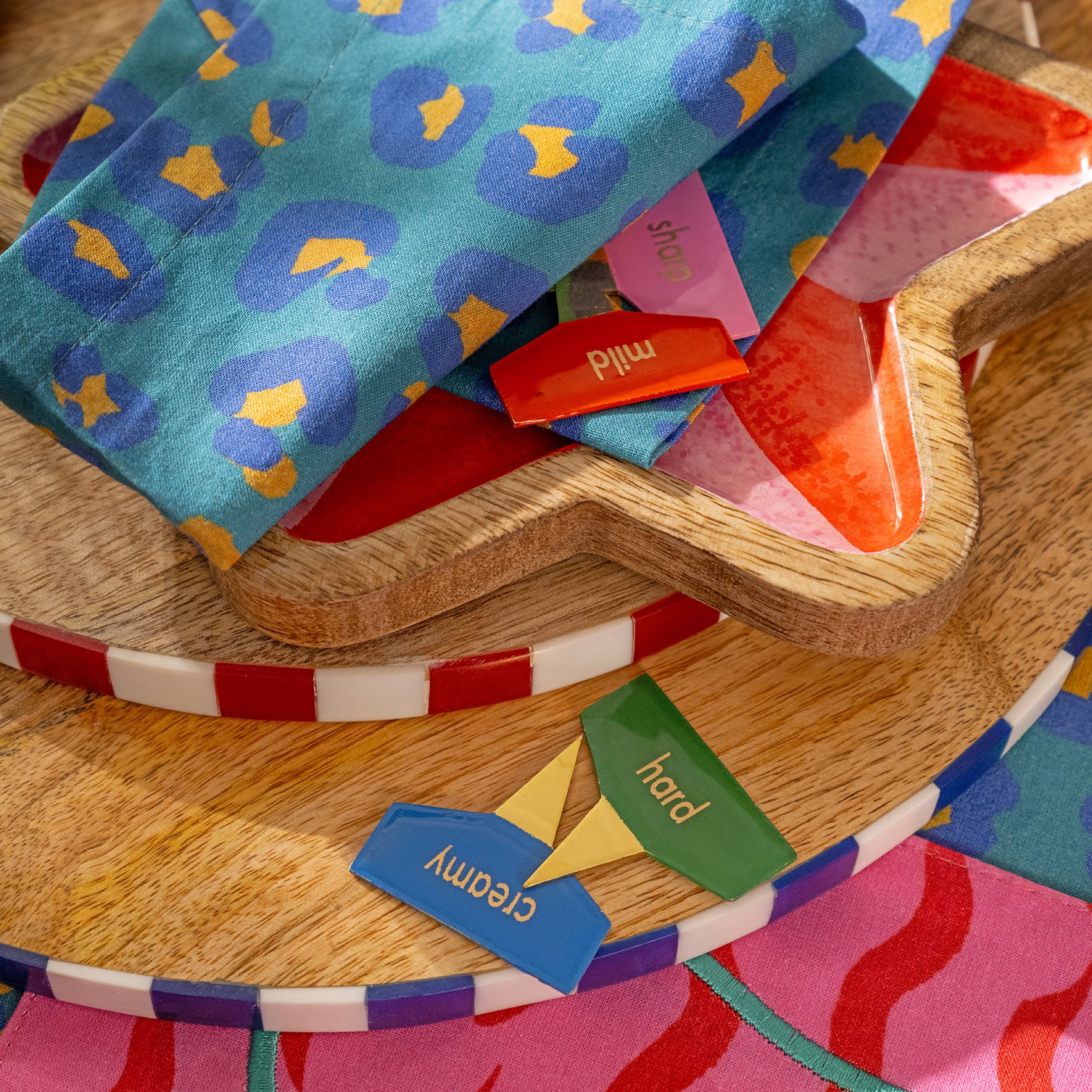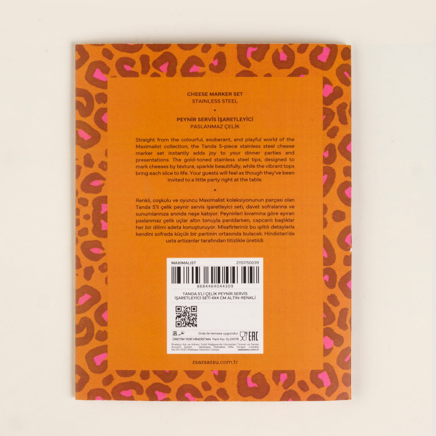 Renkli, coşkulu ve oyuncu Maximalist koleksiyonunun parçası olan Tanda 5’li çelik peynir servis işaretleyici seti, davet sofralarına ve sunumlarınıza anında neşe katıyor. Peynirleri kıvamına göre ayıran paslanmaz çelik uçlar altın tonuyla parıldarken, capcanlı başlıklar her bir dilimi adeta konuşturuyor. Misafirleriniz bu ışıltılı detaylarla kendini sofrada küçük bir partinin ortasında bulacak. Hindistan’da usta artizanlar tarafından titizlikle üretildi. Tanda, hayatın küçük anlarını tatlı bir mutluluk ifadesine dönüştürüyor.